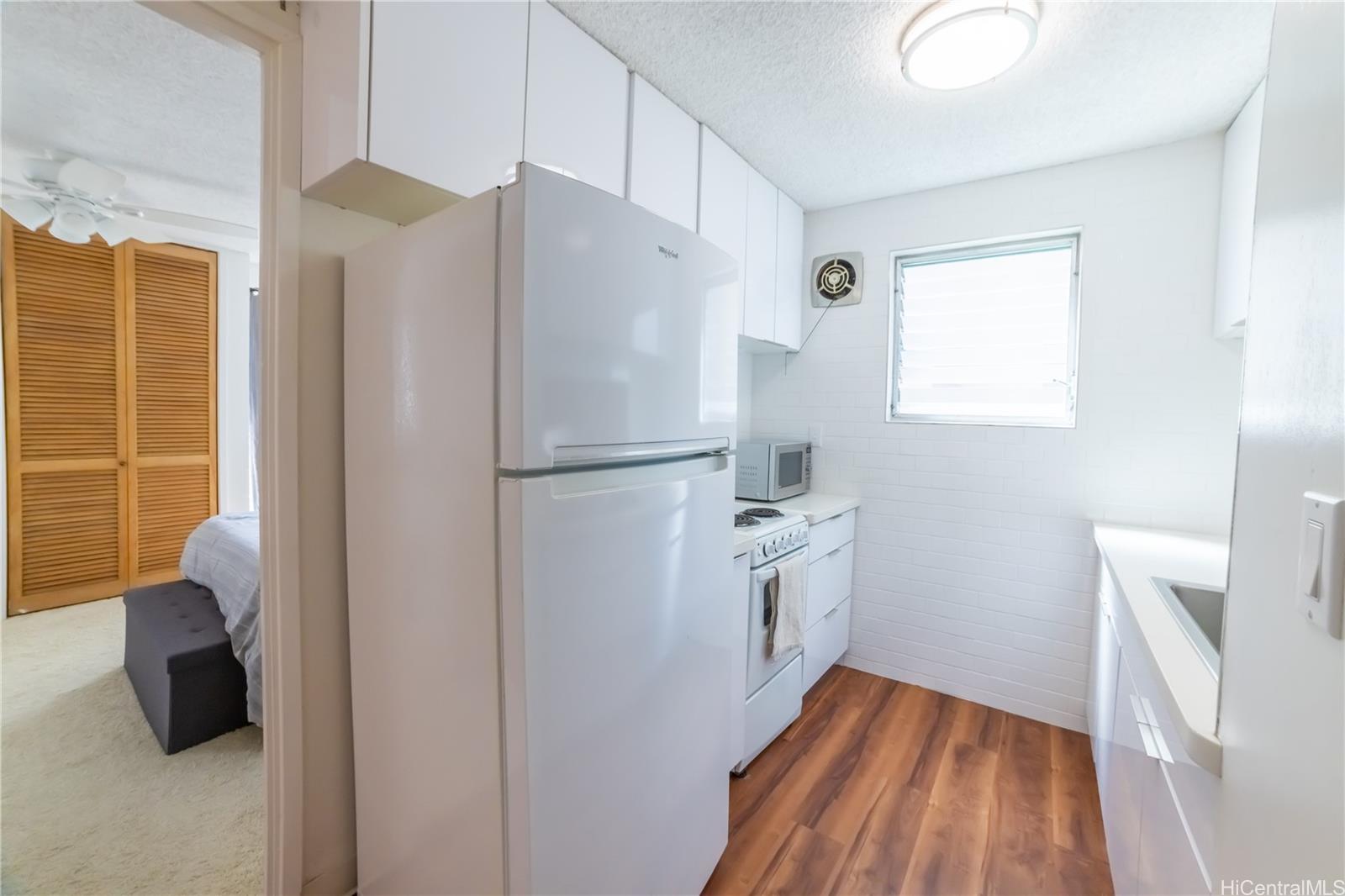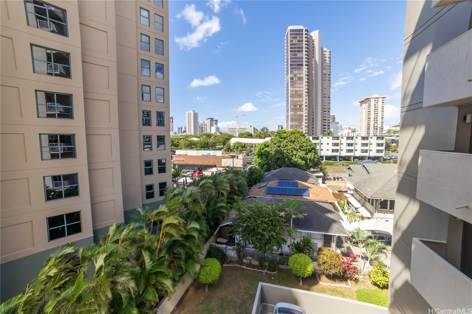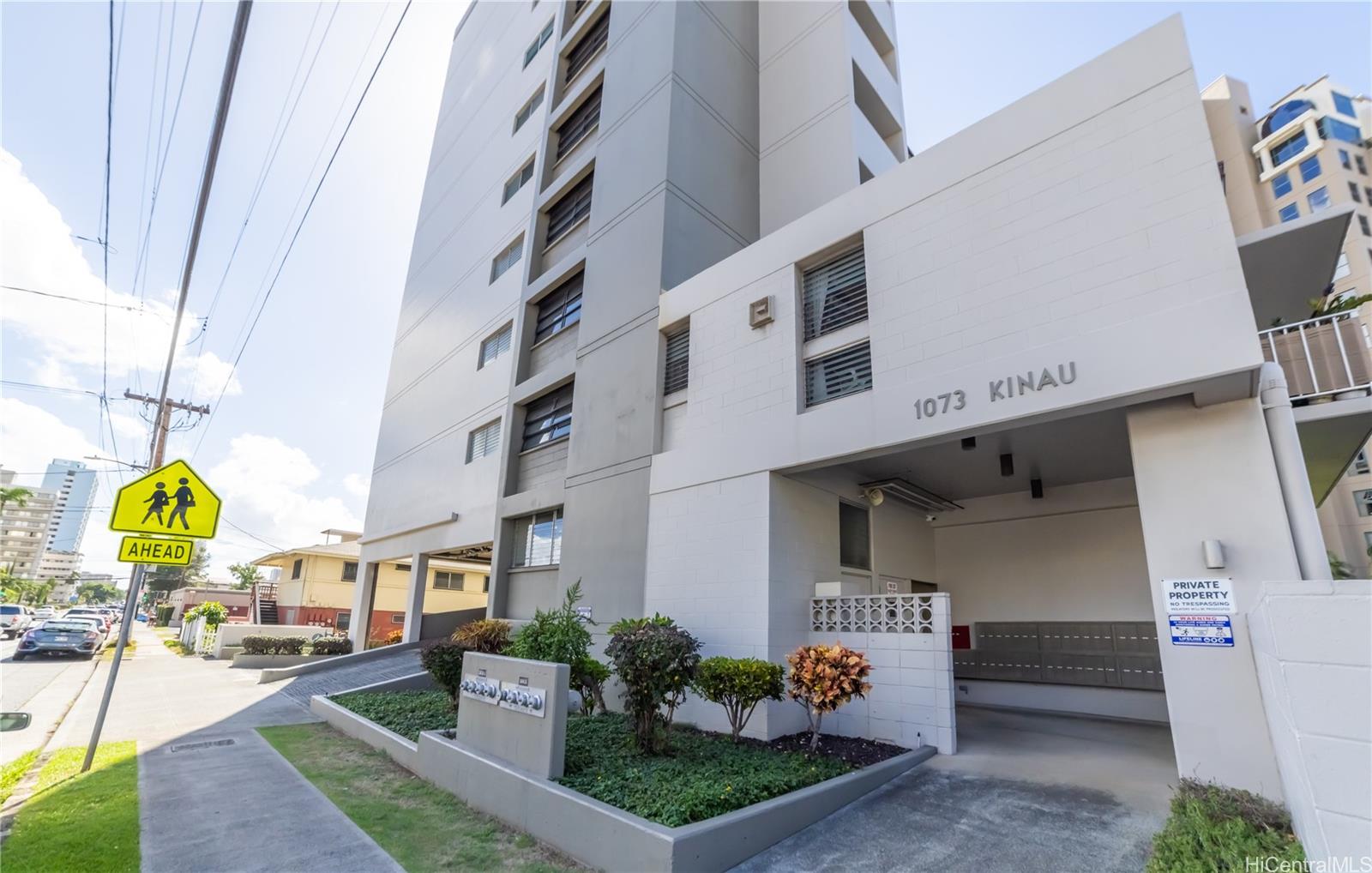 Welcome home to this RARELY available + SPACIOUS 1 bedroom/1 bathroom unit at 1073 Kinau. This well-maintained corner/end unit offers upgraded kitchen with custom cabinets, full load washer/dryer, A/C, ample storage space, excellent cross ventilation, an additional nook area off primary bedroom, a cozy corner lanai with city views, and LOW maintenance fees of $516/month! This secured building features recently upgraded elevator and a on-site resident manager. Centrally located just a few blocks from Downtown Honolulu, Post Office, Kaiser Medical Center, Kapiolani and Queen’s Hospitals, Schools, Honolulu Museum of Arts, and a wide range of shops, restaurants and entertainment.