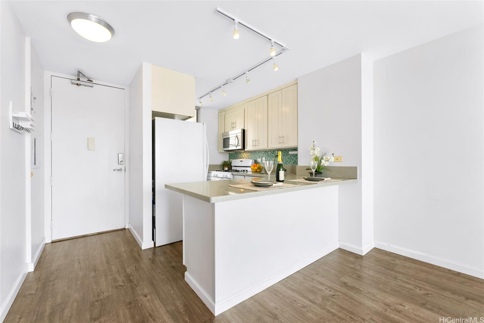 Enjoy cool mountain breezes from this spacious and tastefully upgraded 2-bedroom, 1 bathroom apartment.  Updates include quartz countertops, newer cabinets, and luxury vinyl plank floors. Located in a secure building with an enter phone system and secured elevator fob access.  Unit comes with one covered parking stall.  Conveniently situated near UH, Chaminade, Iolani, beaches, shopping centers, restaurants, bus lines, and freeway access.  This property is ideal for first-time homeowners or investors looking for a prime location.  Don't miss out on this opportunity to own a piece of paradise! (One or more photos are enhanced)