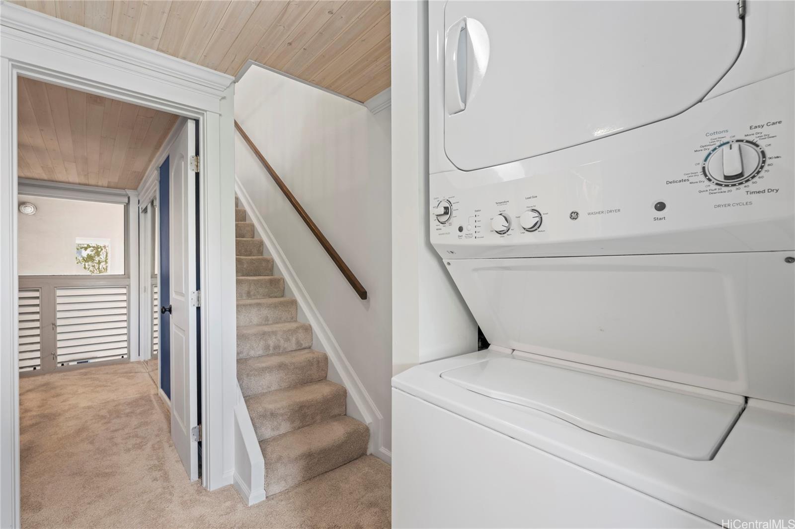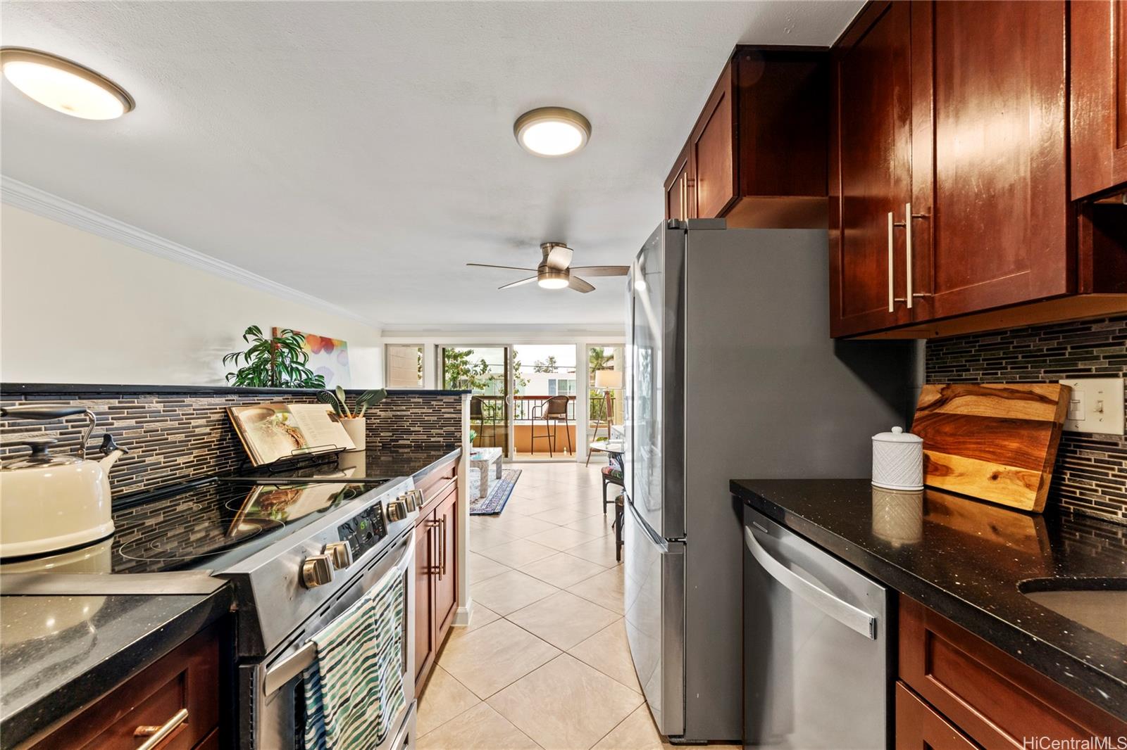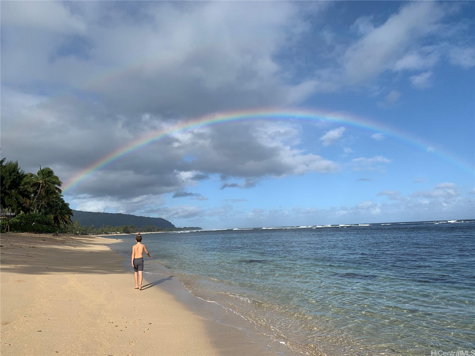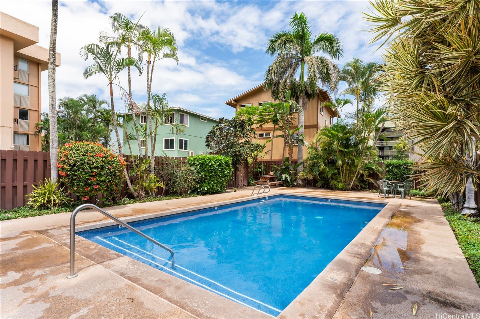 One block from the beach on North Shore, peek a boo ocean view, swimming pool & sauna, cool tile floors, in-unit laundry, large closets, updated kitchen/bathroom, lanai & trade winds. LARGE DOG FRIENDLY/pet friendly community. This fresh, townhouse style unit has a special design in which the bedrooms are under your own living area! No one to disturb you at night walking above. Enter on the third floor which is your living/dining/lanai area and the stairs to your left take you down to your bedrooms, bathroom and laundry area. No walkways in front of your bedrooms. Some of the best privacy you can get in a condo on the North Shore. The resident manager is always working to ensure residents have the cleanest and safest complex in the area. Secured salt water swimming pool and sauna area with bathrooms and shaded seating.