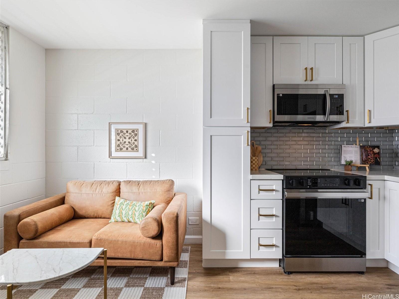 ターンキー&全面改装済み | マッカリーでモダンなアイランドリビング ハレ ホアロハを発見してください - マッカリーの中心部に静かに佇む、わずか 35 ユニットの 7 階建てブティック レジデンスです。3 階にあるこの明るく風通しの良い 1 ベッドルーム、1 バスルームの家は、上から下まで上品に改装されており、すぐに入居できます。中に入ると、新しいビニール フローリング、最新の仕上げ、そして朝のコーヒーや夕方の夕日を楽しむのに最適な広々としたベランダにシームレスにつながるオープン コンセプトのレイアウトを備えた新鮮でモダンなインテリアが目に入ります。メイン フロアにある共同ランドリーは利便性を高め、建物のセキュリティ エントランスと手入れの行き届いた共用エリアで安心して過ごせます。ホノルル生活の最高の体験をお楽しみください。ハワイ大学マノア校、アラ モアナ センター、ワイキキ ビーチ、ダウンタウンから数分、高速道路へのアクセスが容易で、近隣にはレストラン、カフェ、マーケットが数多くあります。所有者の居住率が高く、水道、下水道、ゴミ処理を含む管理費が手頃なため、初めての購入者、投資家、またはシンプルでスタイリッシュな島の別荘を探している人にとって理想的です。