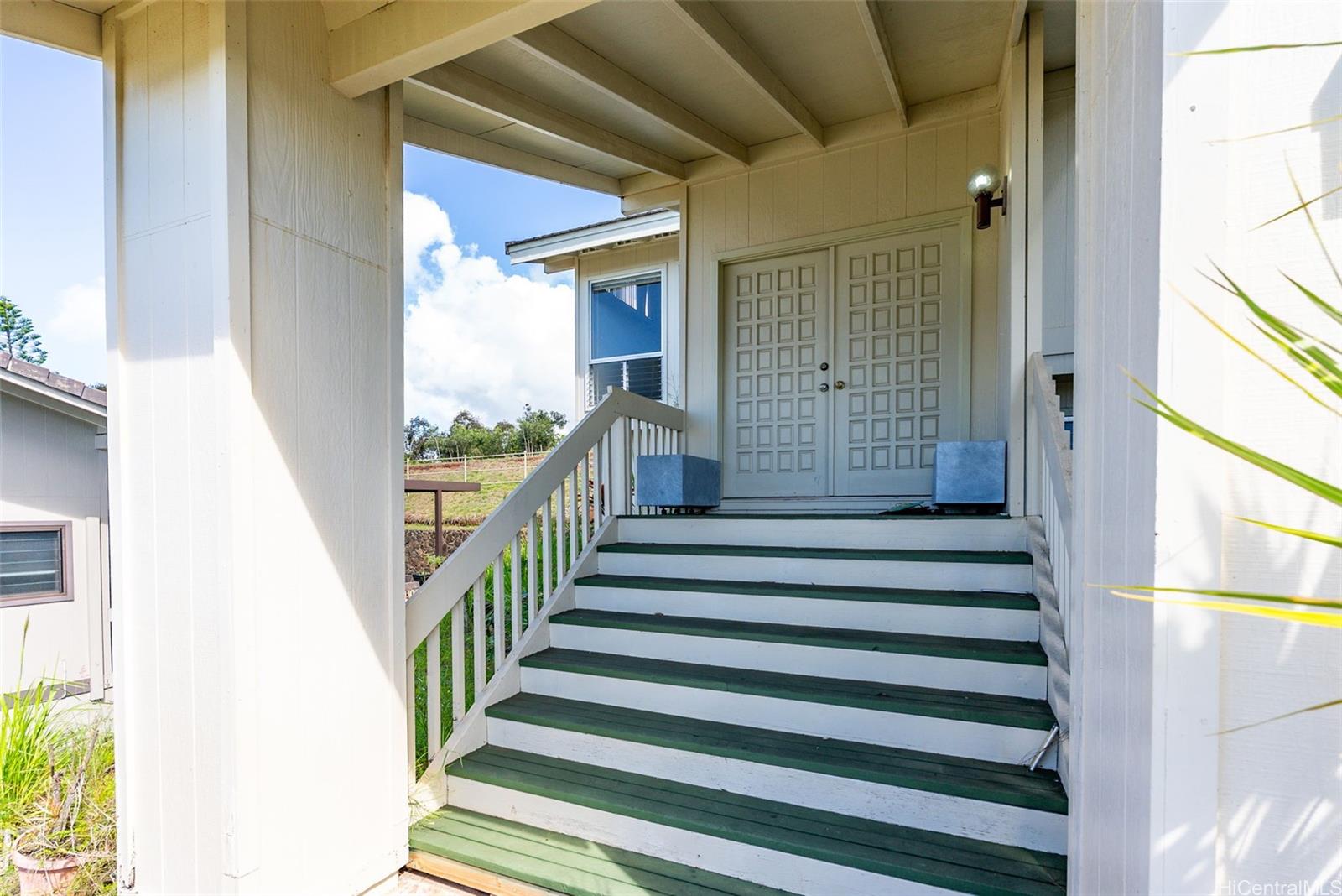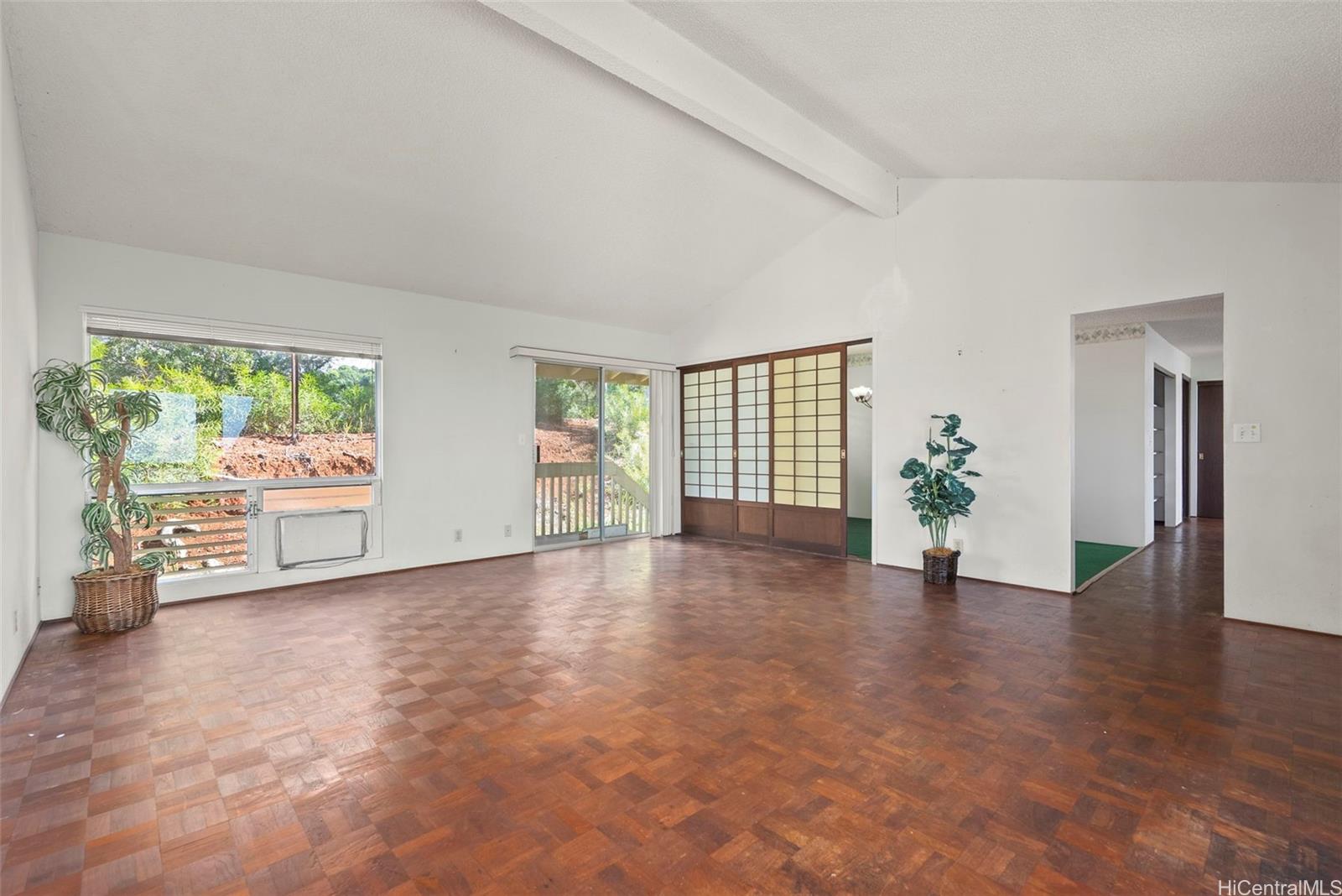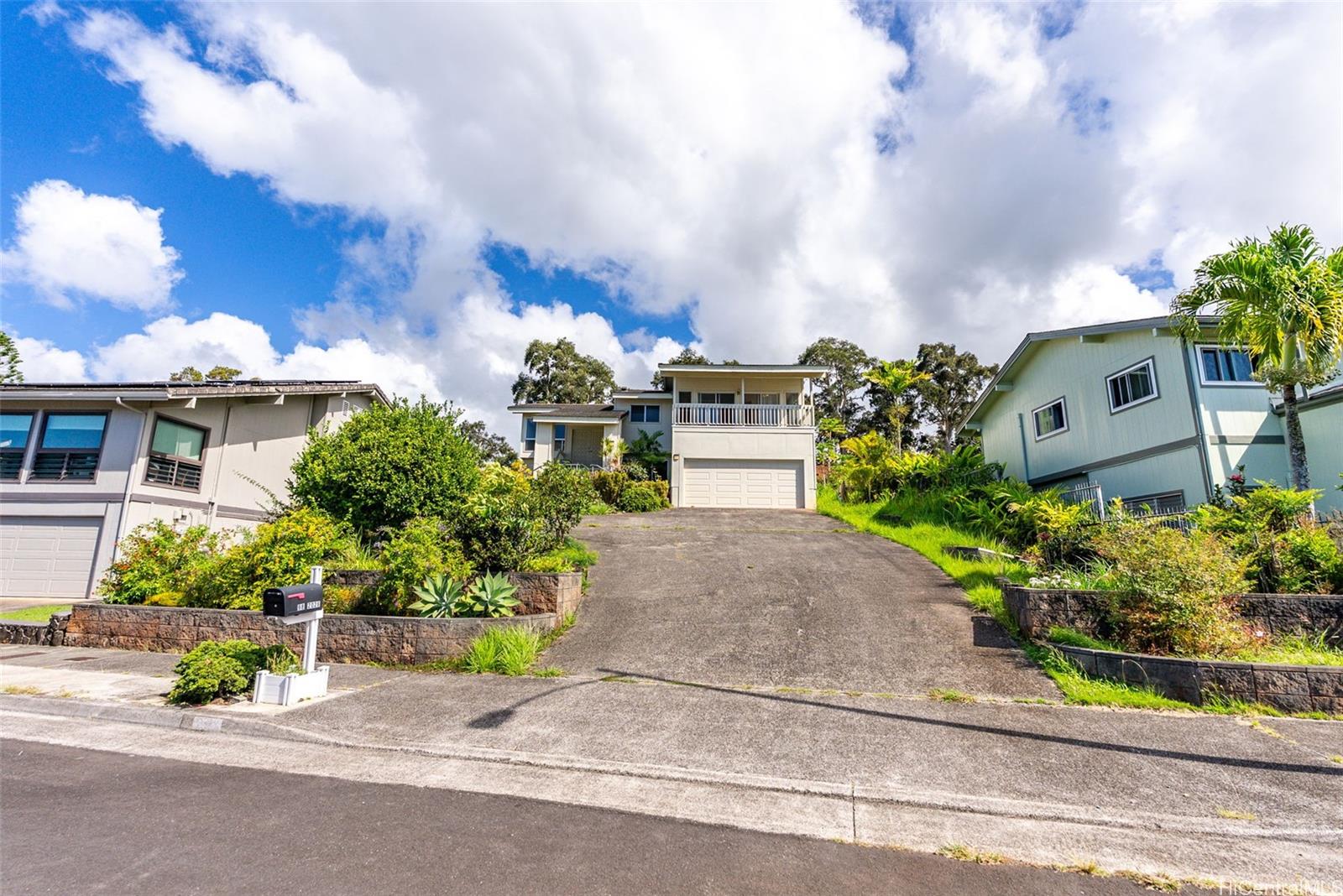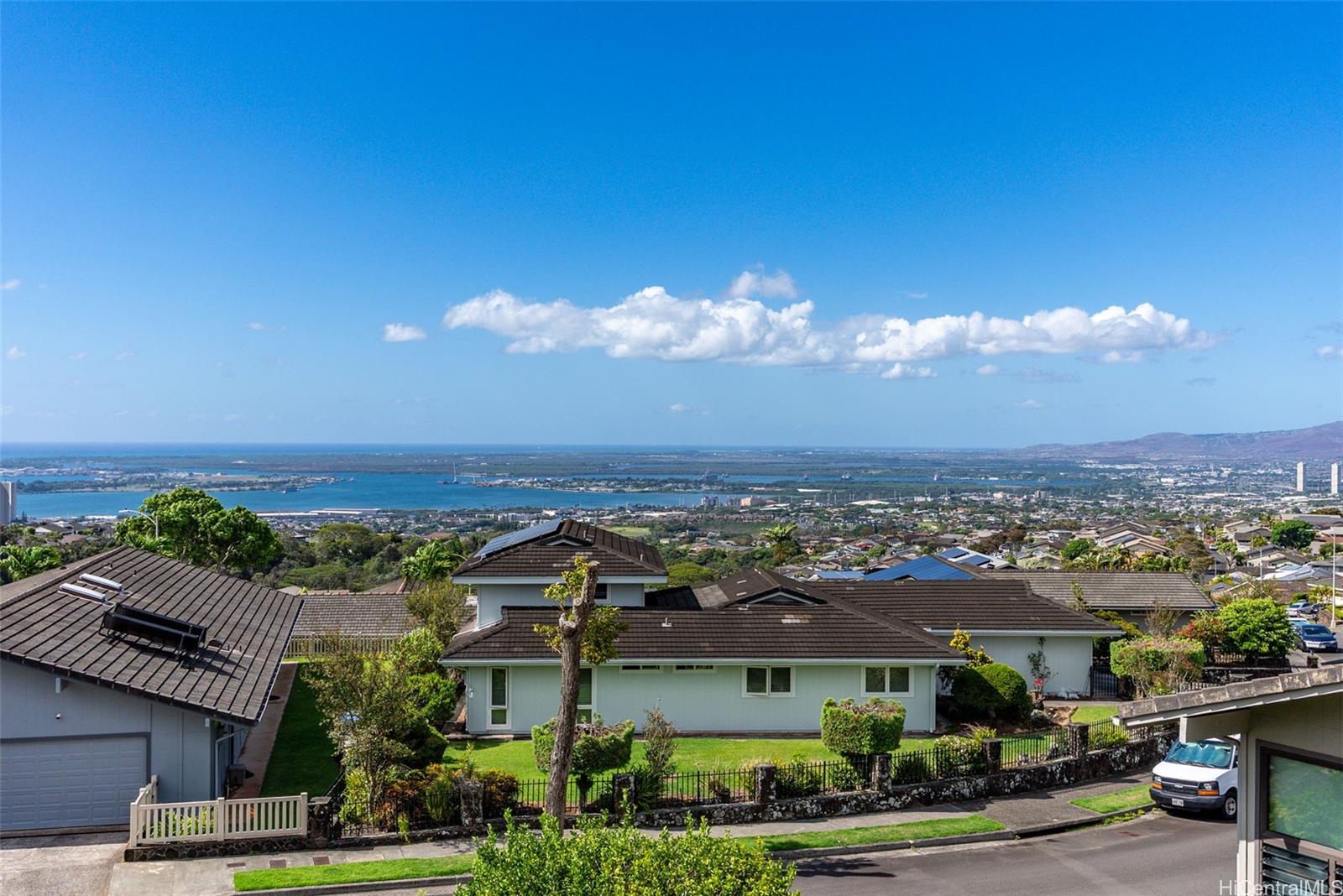 Located in the highly sought-after Newtown Estates neighborhood, this spacious 3-bedroom, 3-bathroom home sits on an expansive 8,108 sq. ft. rim lot, offering stunning panoramic ocean and city skyline views. With 2,202 sq ft of living space, this two-story home provides great potential ready for your personal touch. Features double front doors that open to the high vaulted ceilings in the living room and the sweeping views from the covered lanai. Downstairs, you'll find a versatile room with a wet bar along with a separate entry and a full bathroom. This level also includes a separate laundry room and an enclosed 2 car garage offering convenience and ample storage space.  Newtown Estates comes with a membership to the community center, providing access to fantastic amenities such as a swimming pool, jacuzzi, tennis courts, basketball courts, pickleball courts, and a gym.  Enjoy the convenience of being minutes away from Pearl Harbor, Pearlridge Mall, and the upcoming new stadium.  This is your chance to update and renovate this ideally located home to your tastes and call it your own!