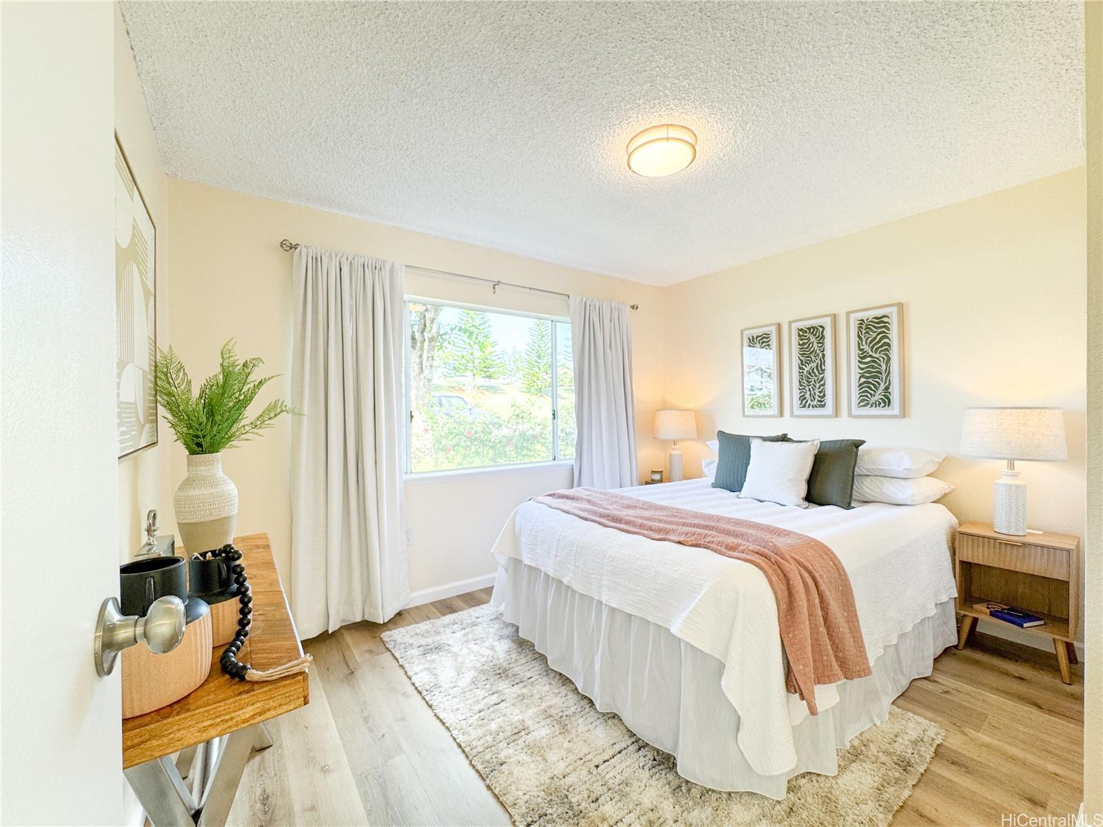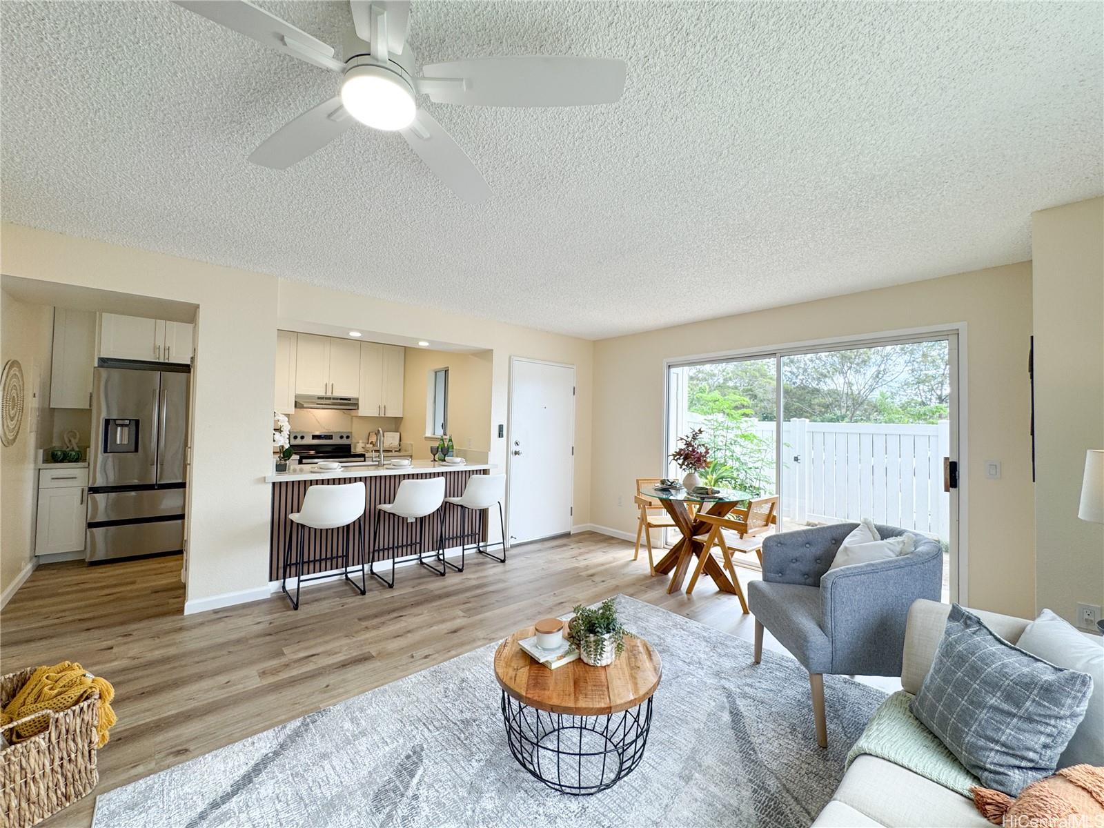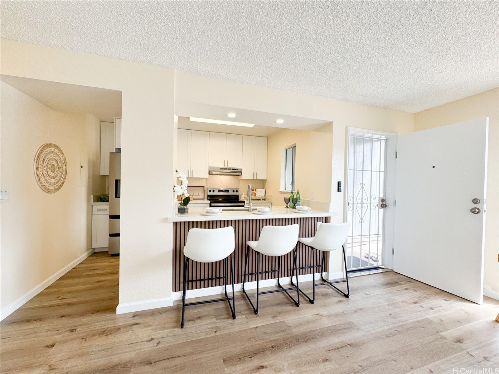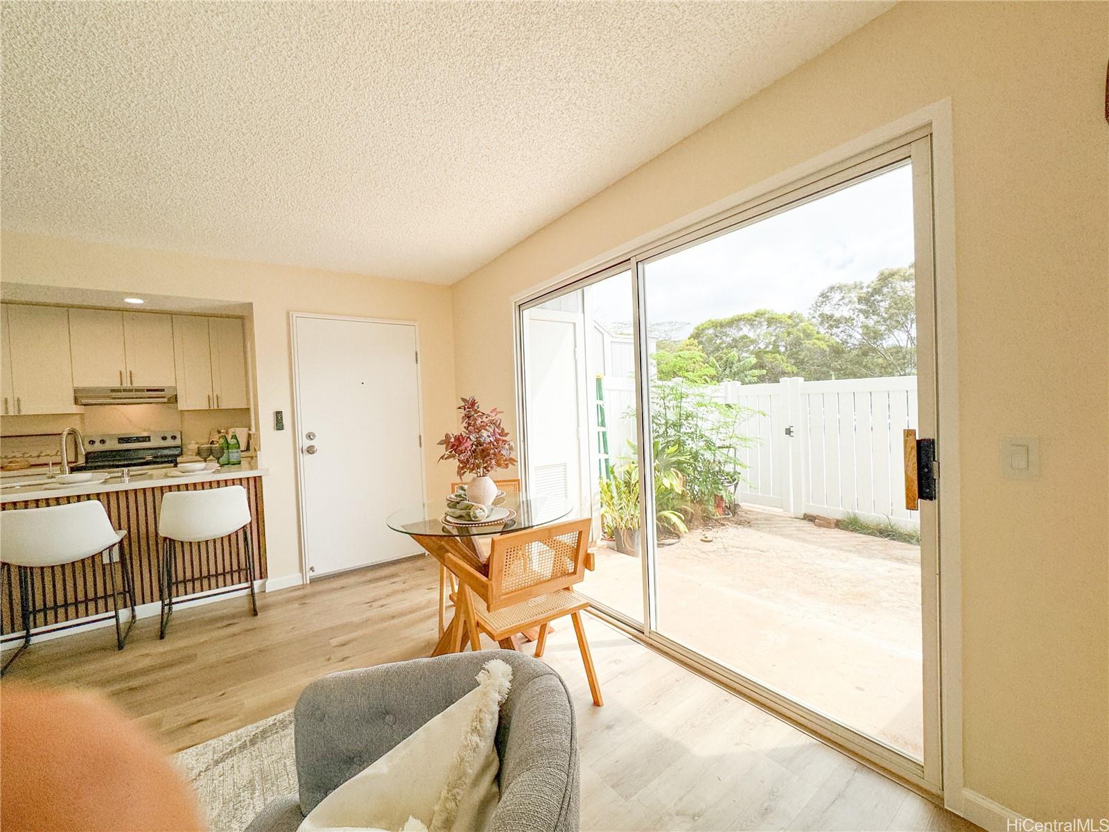 Welcome to your New Home in the heart of Mililani Mauka! Beautiful, completely remodeled 3bedroom 2bath ground floor end unit townhome. Ideally located on the perimeter of the Hillsdale townhome complex with no neighbor on one side or in the back, only serene green space & extra street parking. Fabulous Upgrades include NEW stainless-steel appliances, dishwasher, stove, refrigerator, large kitchen sink, custom cabinets, & gorgeous quartz countertops. New luxury vinyl plank flooring throughout entire home in neutral tones leaving room for your creative design. All new paint, large stacked washer/dryer in the unit. Two full sized side by side parking stalls right in front. Enjoy the many recreation centers, the newest Rec 7 boasting a heated saline pool, kiddie pool, internet cafe, volleyball, free Wi-Fi, indoor volleyball, basketball courts, BBQ pavilion and playground. Conveniently located near top-rated schools, shopping, dining, this home is ideal for those seeking both comfort and convenience. Quick access to H-2 freeway and Kam Hwy, shopping centers, restaurants, schools and Park and Ride. Don’t miss this wonderful opportunity—contact us today for a private showing!