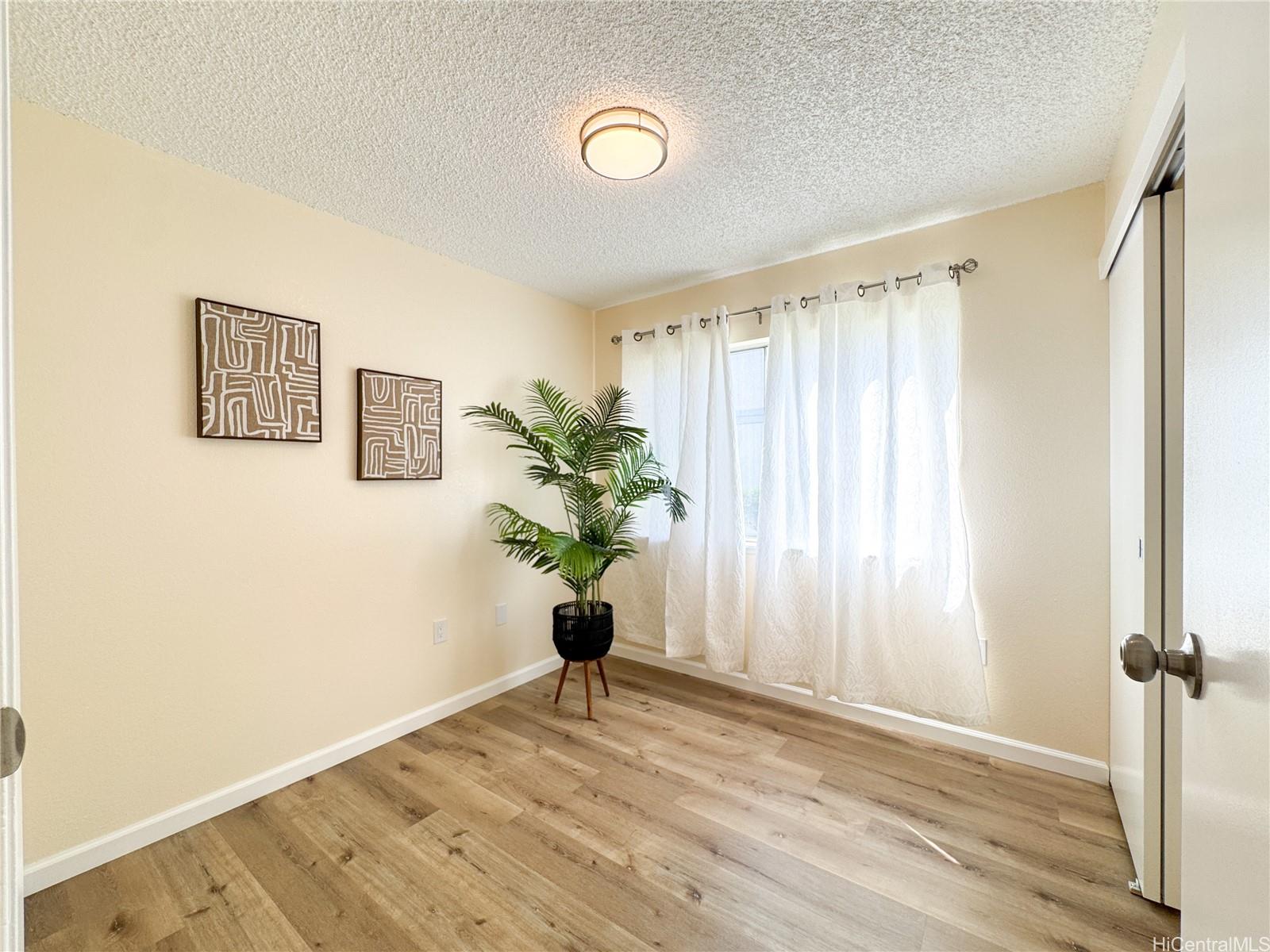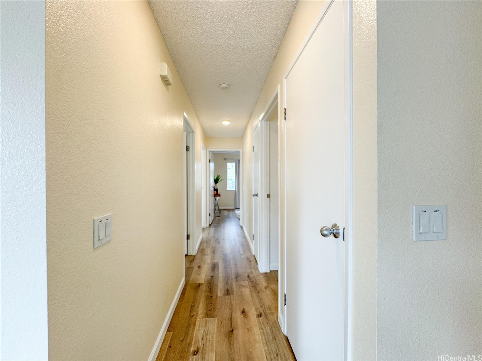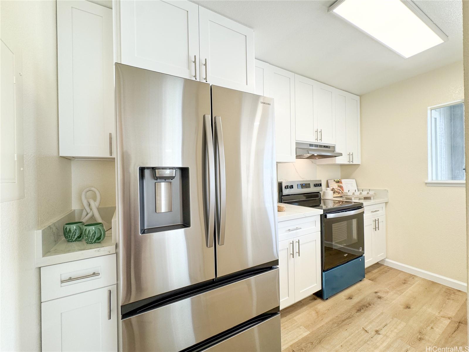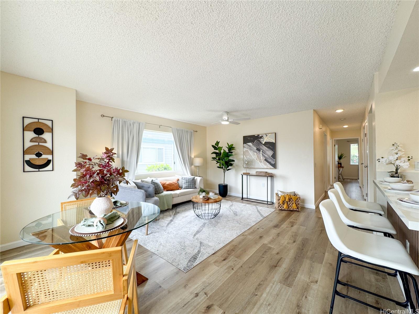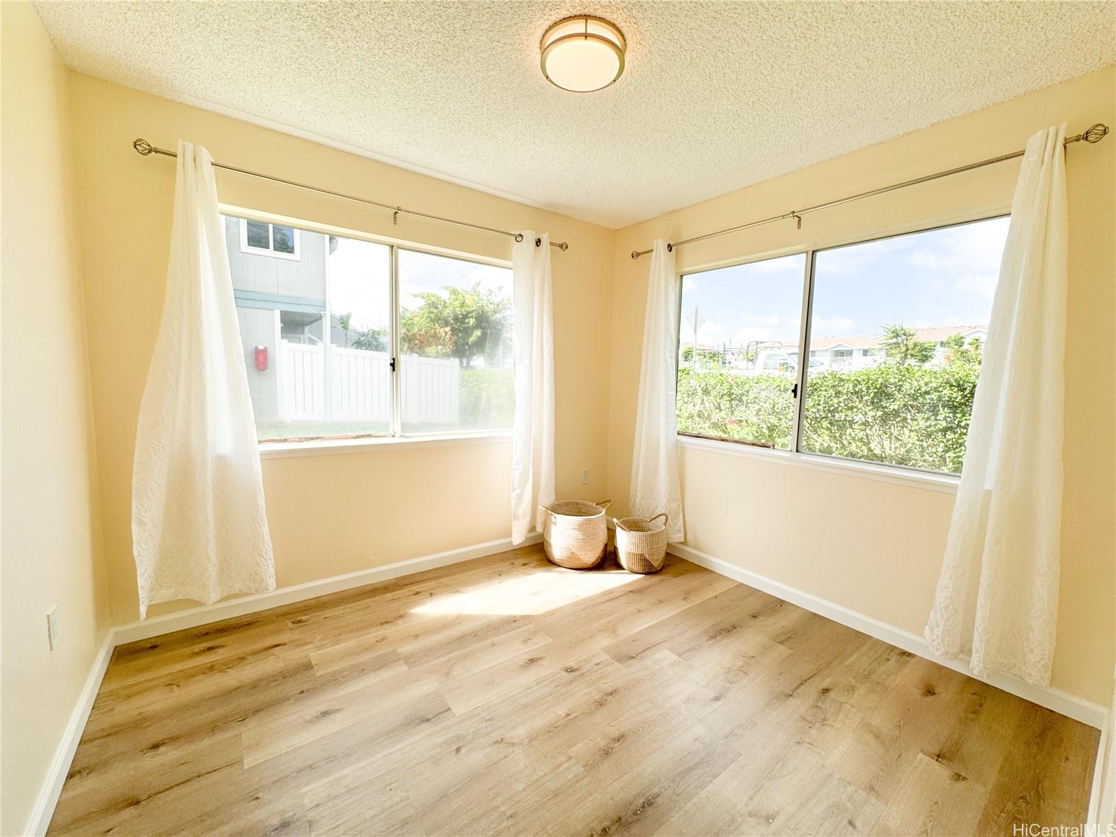 Welcome to your New Home in the heart of Mililani Mauka! Beautiful, completely remodeled 3bedroom 2bath ground floor end unit townhome. Ideally located on the perimeter of the Hillsdale townhome complex with no neighbor on one side or in the back, only serene green space & extra street parking. Fabulous Upgrades include NEW stainless-steel appliances, dishwasher, stove, refrigerator, large kitchen sink, custom cabinets, & gorgeous quartz countertops. New luxury vinyl plank flooring throughout entire home in neutral tones leaving room for your creative design. All new paint, large stacked washer/dryer in the unit. Two full sized side by side parking stalls right in front. Enjoy the many recreation centers, the newest Rec 7 boasting a heated saline pool, kiddie pool, internet cafe, volleyball, free Wi-Fi, indoor volleyball, basketball courts, BBQ pavilion and playground. Conveniently located near top-rated schools, shopping, dining, this home is ideal for those seeking both comfort and convenience. Quick access to H-2 freeway and Kam Hwy, shopping centers, restaurants, schools and Park and Ride. Don’t miss this wonderful opportunity—contact us today for a private showing!