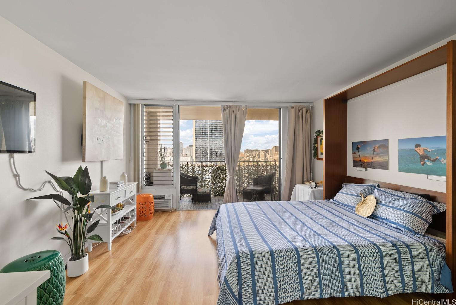 Updated studio unit on the 27th floor in the heart of Waikiki- featuring canal, mountain and ocean views. Enjoy sunsets and Friday night Hilton fireworks from your lanai. Amenities include panoramic rooftop view with heated salt-water pool, fire pit, multiple bbq stations, covered lounge areas and sauna. Unit sells furnished with in-unit washer/dryer, custom wall-bed, ceramic tile and laminate flooring, ready for you to move in or rent out. Other features include assigned covered parking stall, guest parking, fob access to building, and on-site management. Contact us to schedule a private showing today.