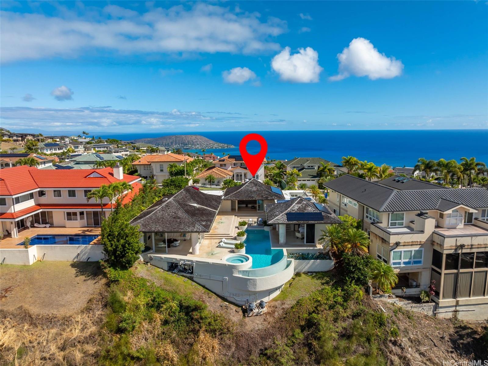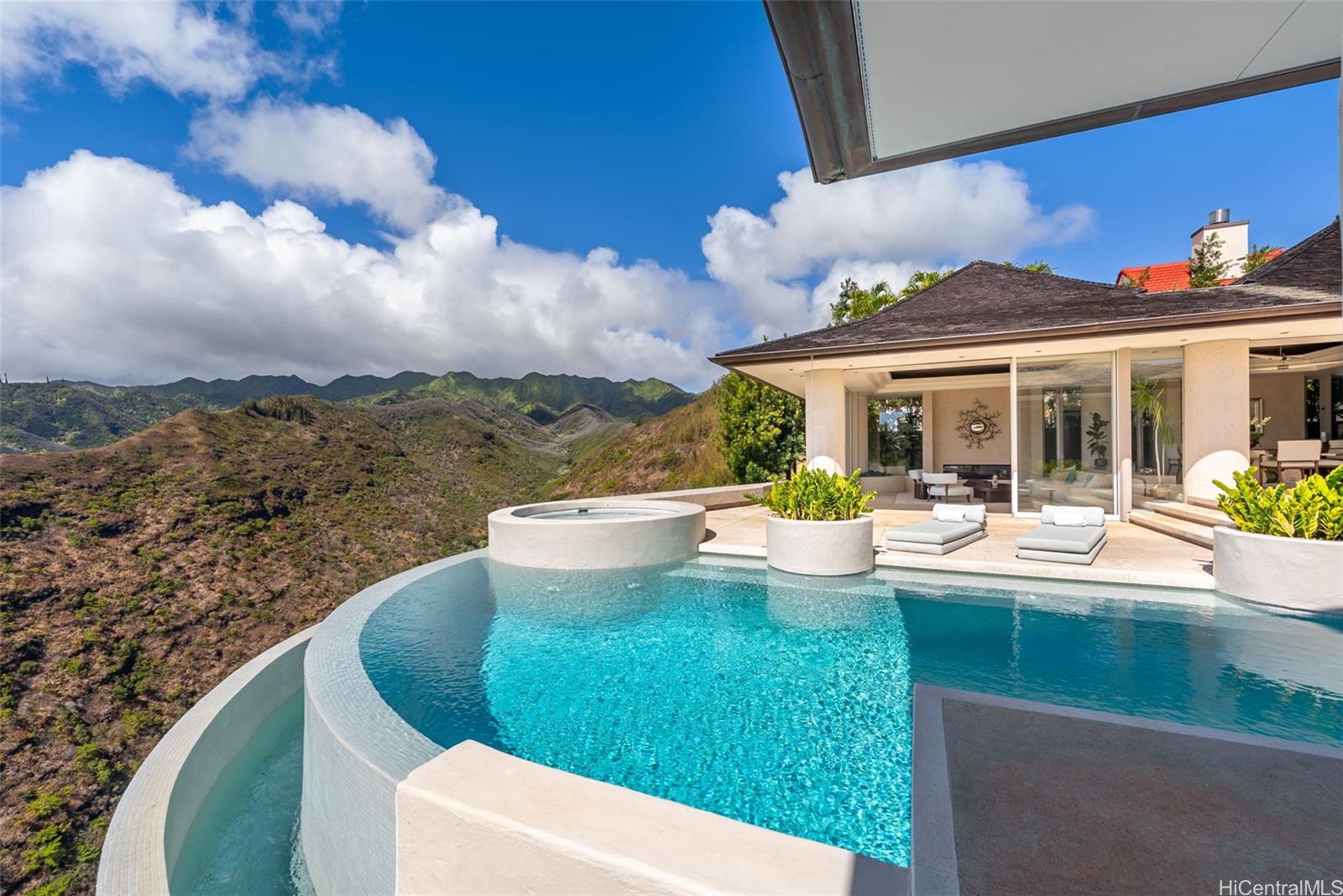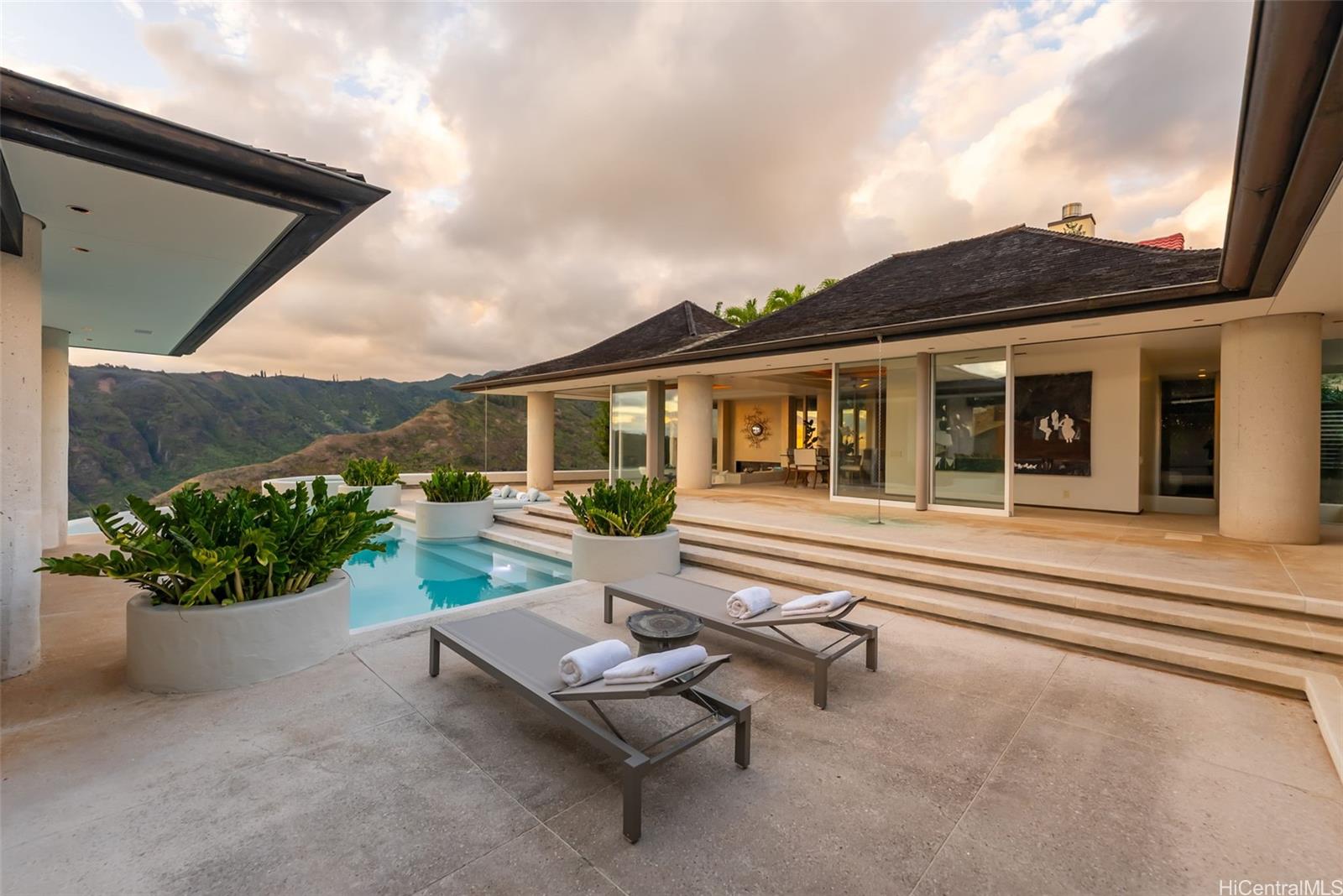 Perched atop the prestigious gated community of Hawaii Loa Ridge, The Summit Retreat House is a rare architectural gem designed by renowned architect Norman Lacayo. Blending timeless design with tropical elegance, this 3-bedroom, 3-bath home features an open floor plan with rich mahogany details, natural stone finishes, and an interior garden that brings the outdoors in. Expansive floor-to-ceiling windows frame panoramic views of both the Pacific Ocean and the majestic Ko'olau Mountains, filling the home with natural light and a sense of serenity. Positioned on a rim lot, the property captures some of the most breathtaking sunsets on Oahu. Enjoy an infinity-edge pool and spa overlooking the ocean, and a chef’s kitchen equipped with high-end appliances designed for both everyday living and entertaining. Located within the secure gates of Hawaii Loa Ridge, this residence offers privacy, serenity, and easy access to Honolulu’s best shopping, dining, and beaches. The Summit Retreat House is more than a home—it’s a refined retreat above it all, where modern design meets Hawaii’s natural beauty.