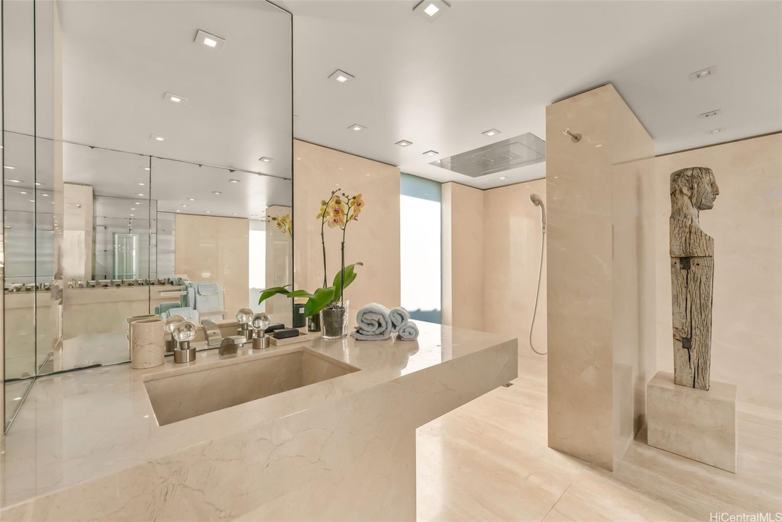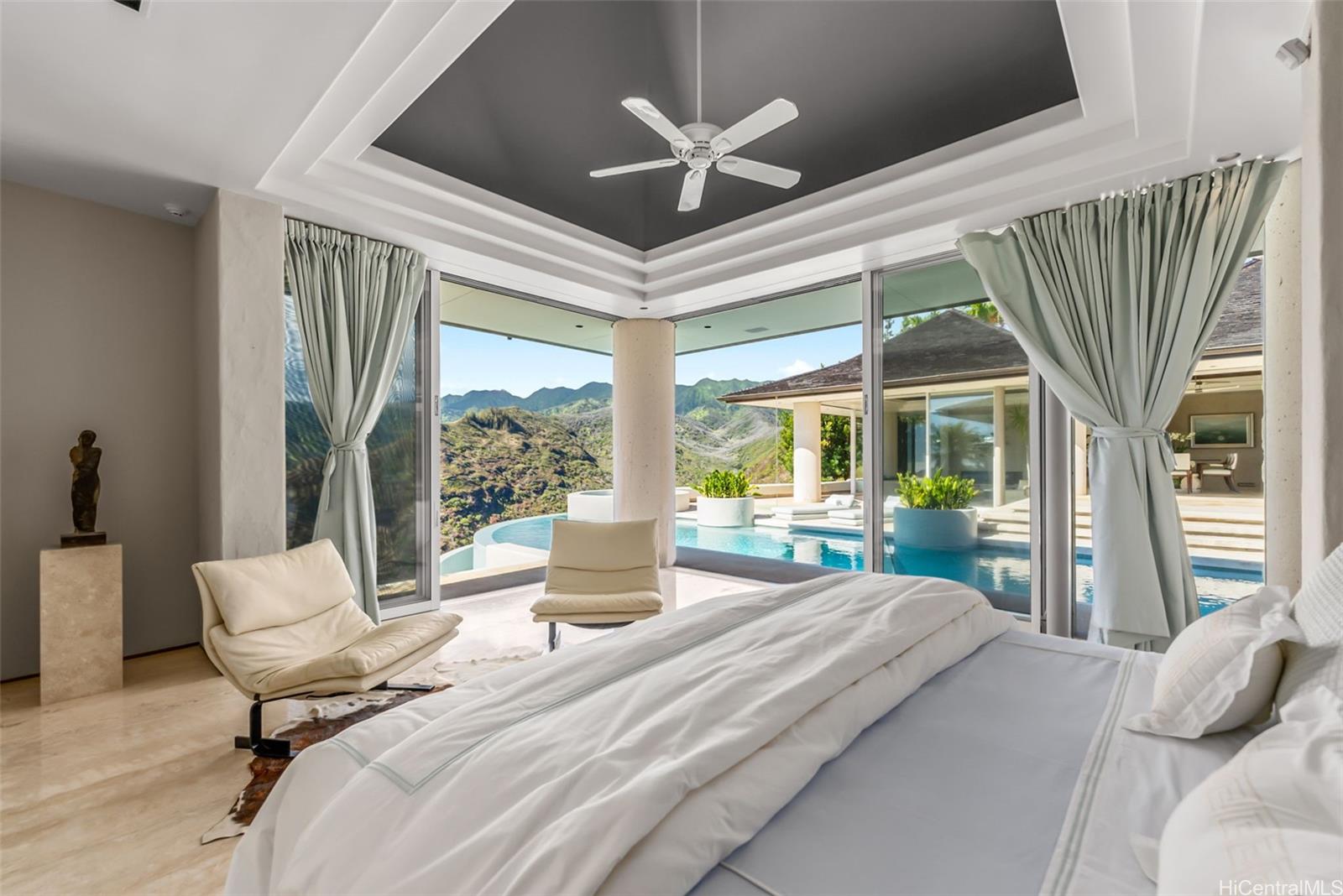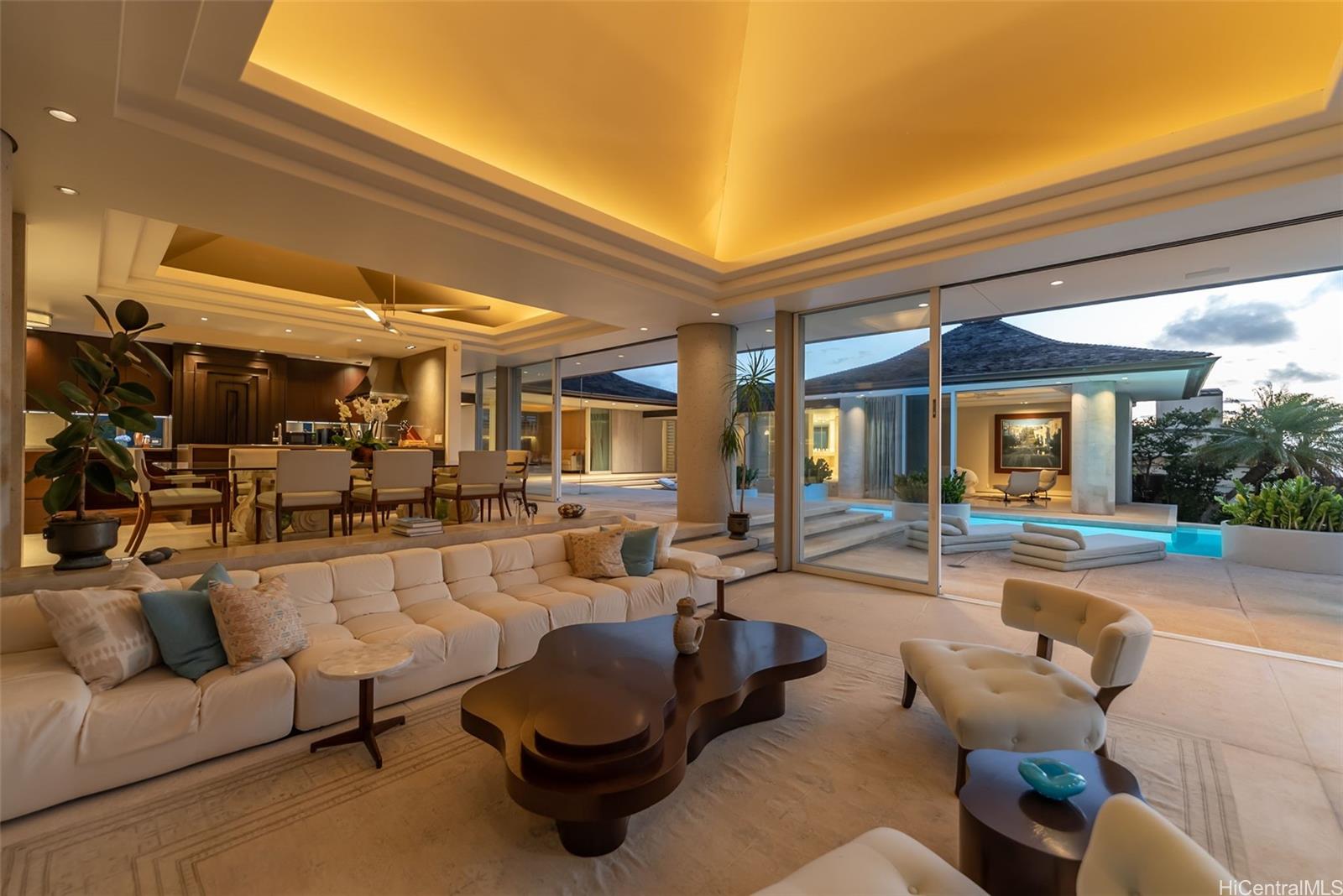 Perched atop the prestigious gated community of Hawaii Loa Ridge, The Summit Retreat House is a rare architectural gem designed by renowned architect Norman Lacayo. Blending timeless design with tropical elegance, this 3-bedroom, 3-bath home features an open floor plan with rich mahogany details, natural stone finishes, and an interior garden that brings the outdoors in. Expansive floor-to-ceiling windows frame panoramic views of both the Pacific Ocean and the majestic Ko'olau Mountains, filling the home with natural light and a sense of serenity. Positioned on a rim lot, the property captures some of the most breathtaking sunsets on Oahu. Enjoy an infinity-edge pool and spa overlooking the ocean, and a chef’s kitchen equipped with high-end appliances designed for both everyday living and entertaining. Located within the secure gates of Hawaii Loa Ridge, this residence offers privacy, serenity, and easy access to Honolulu’s best shopping, dining, and beaches. The Summit Retreat House is more than a home—it’s a refined retreat above it all, where modern design meets Hawaii’s natural beauty.