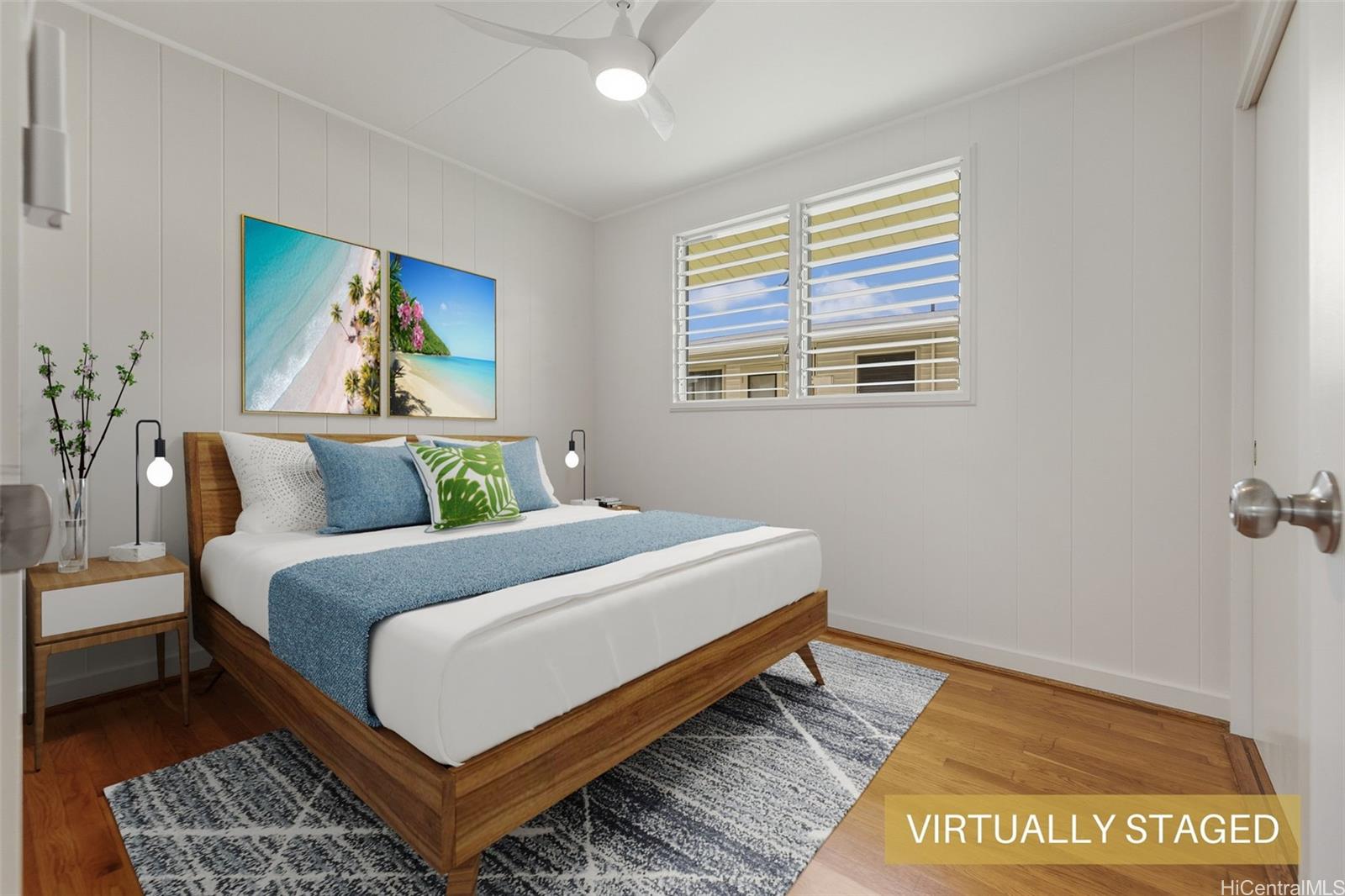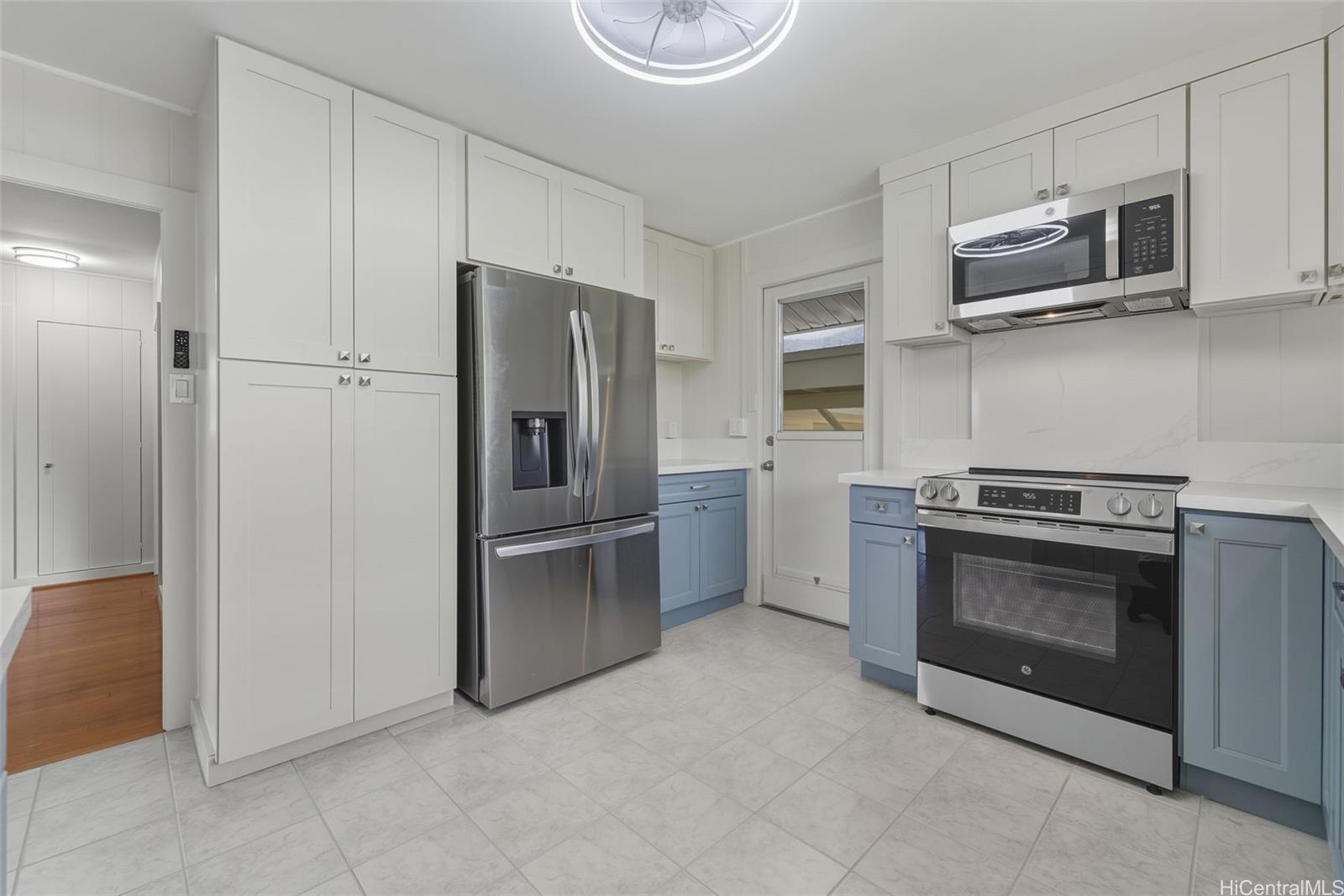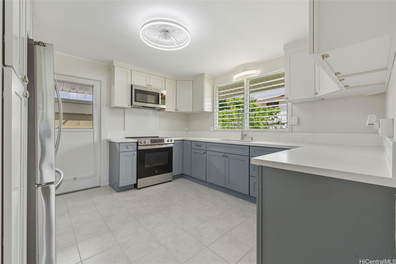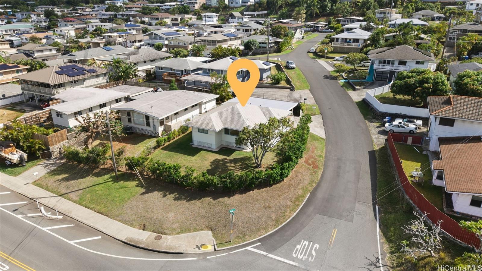 Experience kama'aina living in this beautifully updated single-family home on a desirable corner lot. Recently renovated with a brand-new kitchen and bathroom. Bathroom features a dual vanity with Quartz countertops, lighted mirrors, and tub with shower. Kitchen has contemporary color scheme with blue lower cabinets and white uppers with stainless steel appliances and Quartz countertops. The house has been freshly painted inside and out. A fully fenced yard and new gutters add to the appeal and functionality.