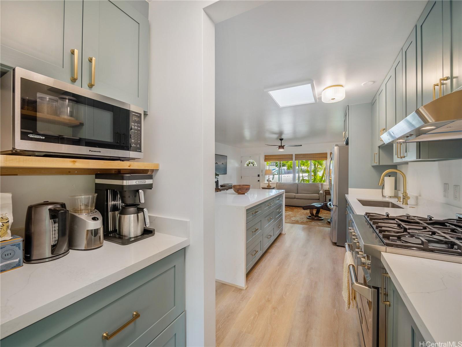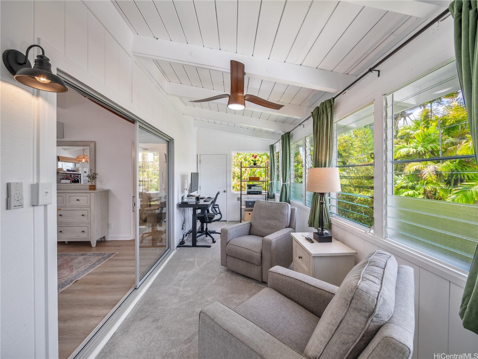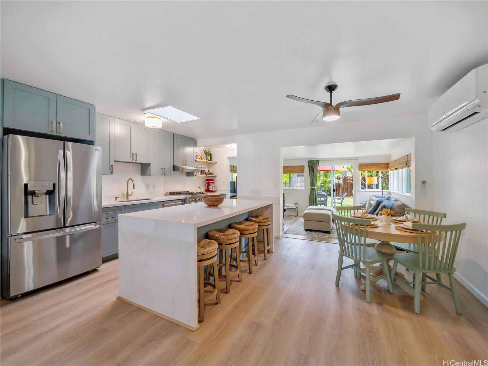 The Kitchen is fully remodeled + opened to the living + dining areas, creating a great room, with new cupboards, appliances + fabulous island + counters all covered with classic white quartz + flows into a bright sun room + beyond to the large private tree lined yard. A flexible floor plan allows for multigenerational living with ocean breezes + mountain serenity on the upper covered lanai + an extra fully enclosed sitting/office area with separate stairway from outside as well as an inner stairway connecting both levels. Upstairs suite has it?s own fridge + a full bank of cupboards for morning coffee in bed or on the lanai. The extended carport can easily double as parking spot + a wonderful storage area + still boasts a separate laundry room with new stainless front loading washer/dryer, a drink fridge + room for more storage! As dreamy as it sounds..