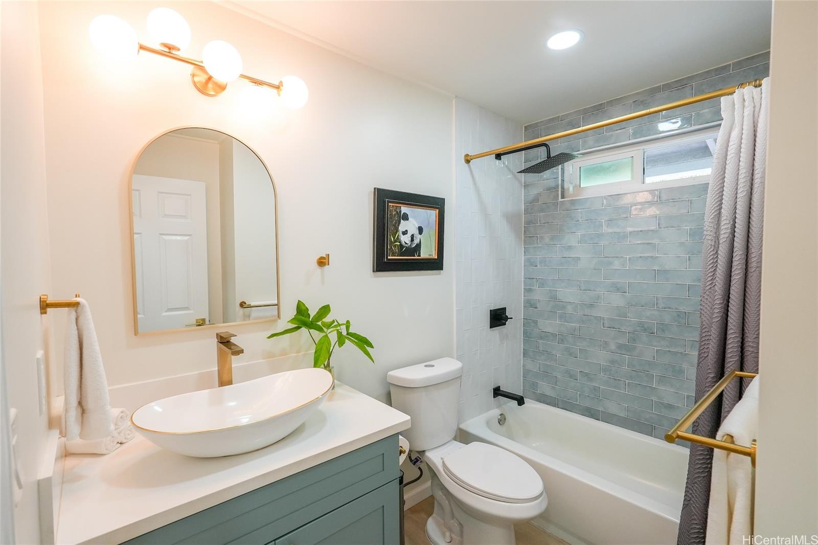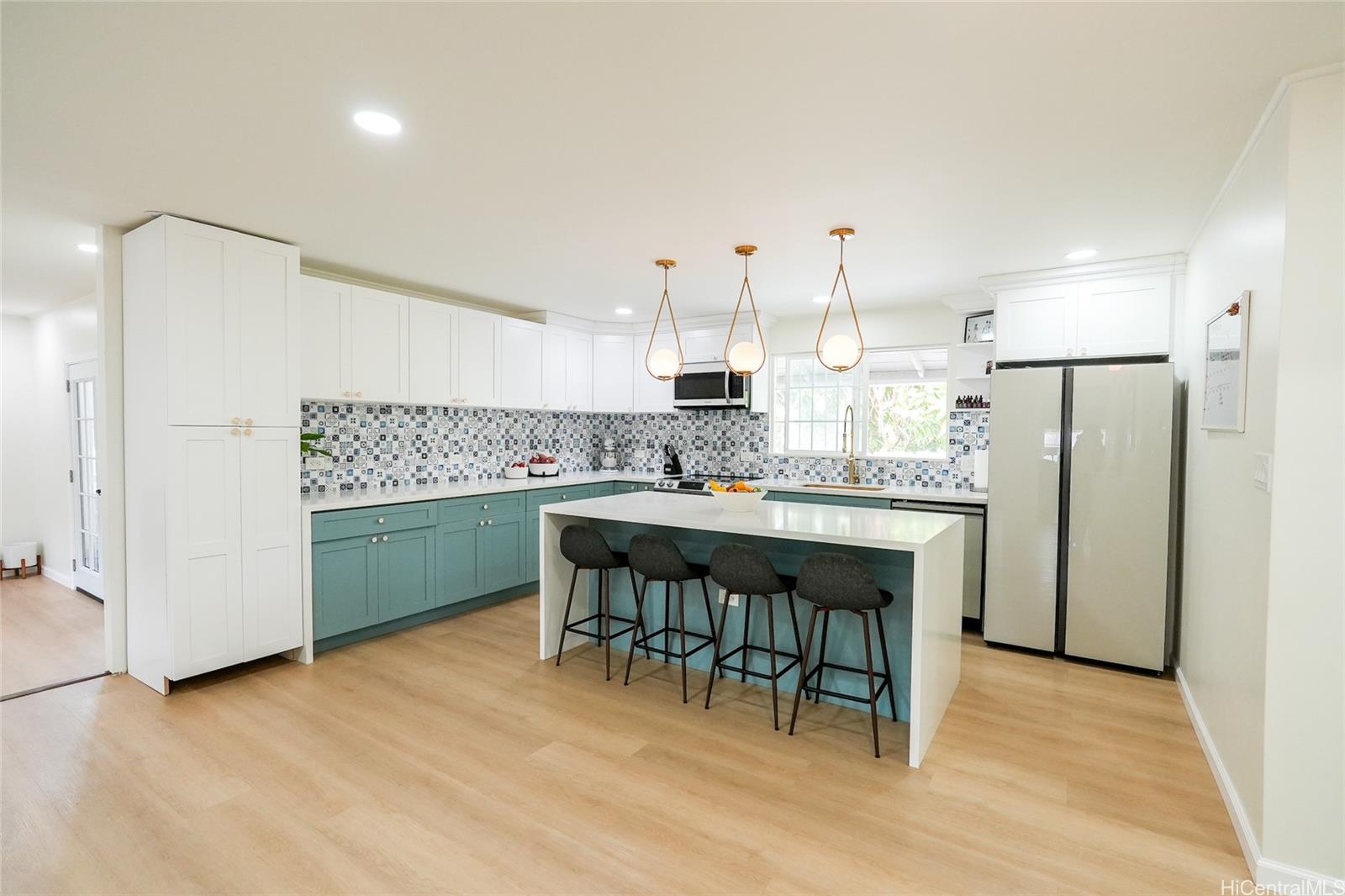 Tucked away in Wahiawa Heights, this newly renovated 5-bedroom, 2.5-bath home blends modern elegance with everyday comfort. Recently appraised at $1,040,000, this property offers exceptional value and peace of mind. Featuring an expansive 860 sqft permitted addition, the home offers an open, spacious layout. The stunning kitchen is a chef’s dream, designed for both style and functionality, with ample counter space, an island, and a pantry. Every detail has been thoughtfully crafted, from sleek gold fixtures to perfectly matched cabinetry in both kitchen and bathrooms. The bathrooms feature exquisite tile work, adding an extra touch of sophistication and charm. The primary bedroom includes a spacious walk-in closet that could be used as an additional room. Outside, the property has a cement driveway, 2-car covered carport, grassy front yard, and a lush backyard with a deck, ideal for relaxing or entertaining guests. Situated in a quiet neighborhood with easy access to North Shore beaches and freeway for a quick trip to town, this modern home offers the best of Wahiawa living. With everything in perfect condition, this home is move-in ready and waiting for you to make it your own.