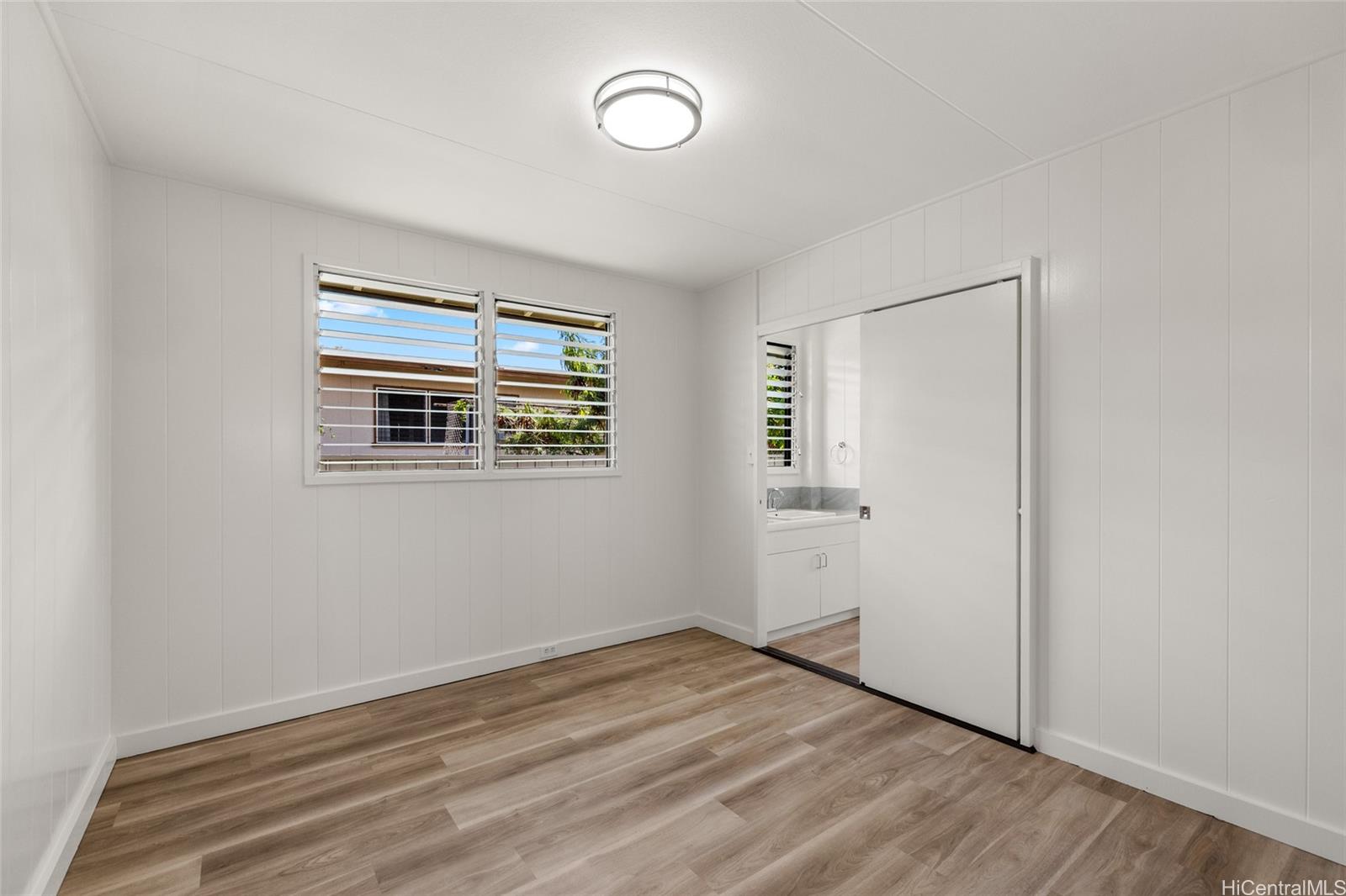Location, location, location - flat, flat, flat. Highly desirable Moanalua Gardens 4 bedroom, 2.5 bath home offers both comfort and convenience. Situated on a level, beautifully manicured and fully fenced yard, this property provides ample space to play, entertain, expand or simply relax and enjoy. Conveniently located near Moanalua Elementary and Intermediate schools. A LARGE storage room next to the garage adds valuable flexibility - perfect for tools, hobbies or extra space. Looking for income opportunity? Separate the upstairs 1 bedroom, 1 bath with living area - your choice. Home is move-in ready! Renovations include: exterior and interior paint, new luxury vinyl tile (LVT) flooring downstairs, new carpet upstairs, new countertops at full and half bath downstairs, new countertop at upstairs kitchenette, new door knobs, new light fixtures (at bedrooms, bath, hallway), new ceiling fan at dining room, new a/c at upstairs bedroom and many more.