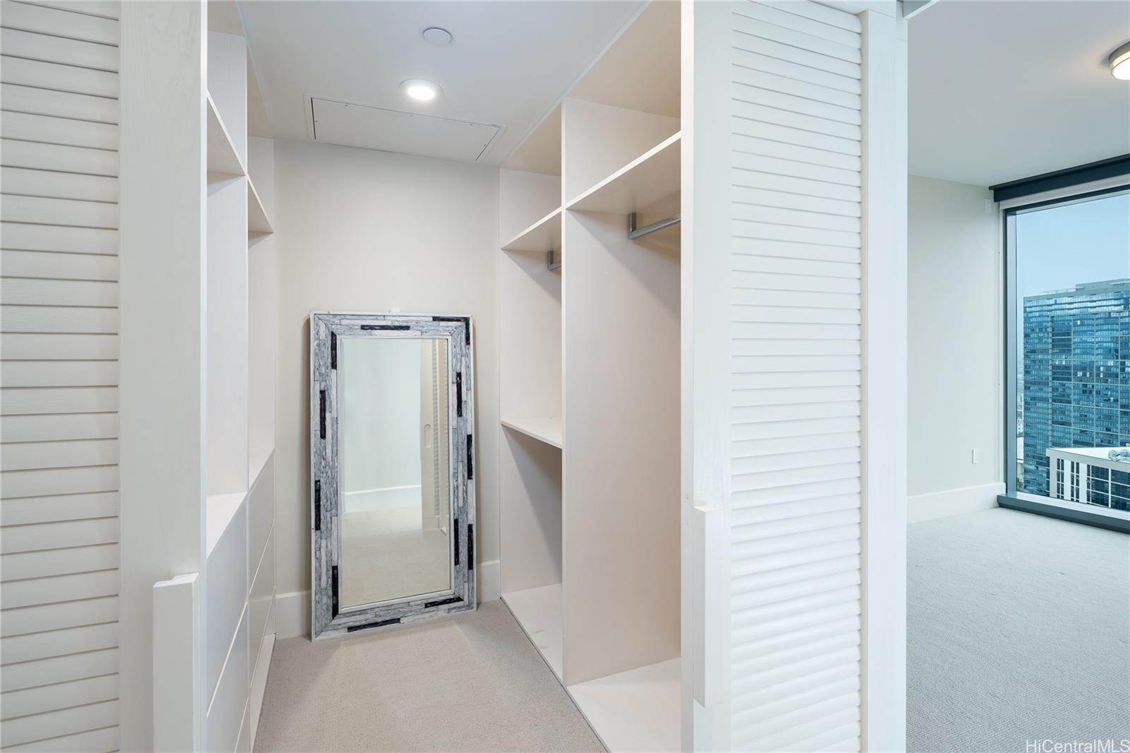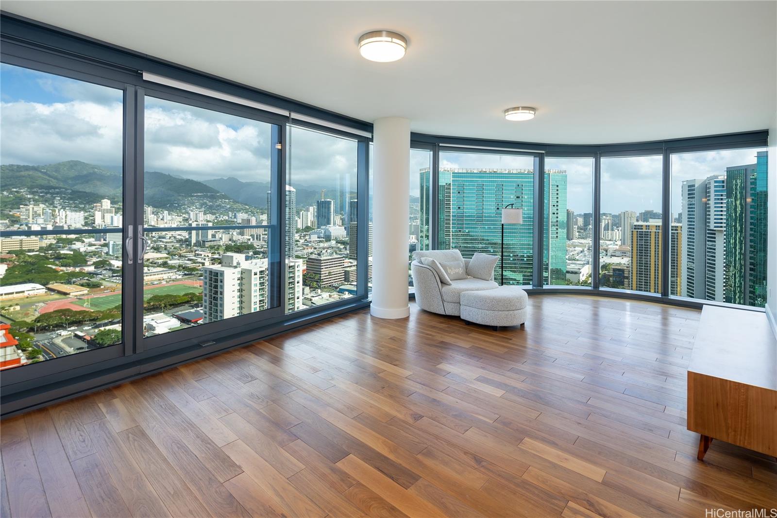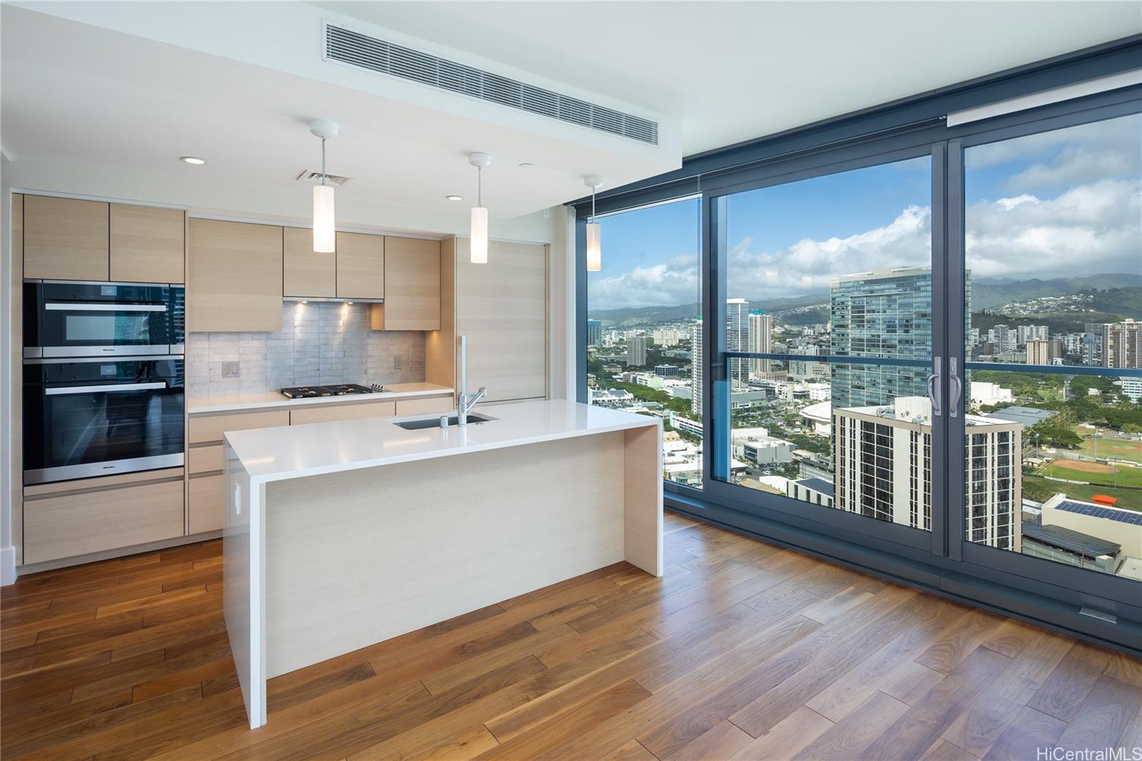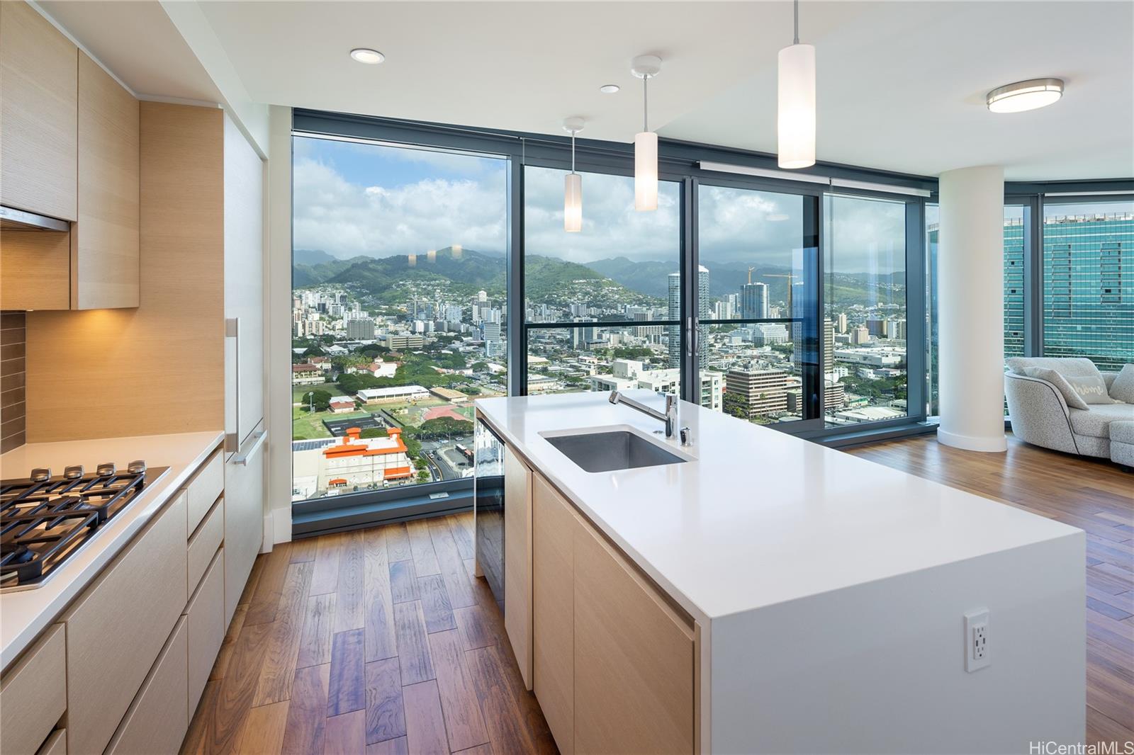 Fall in love with this luxurious, much preferred, corner unit boasting panoramic views of the beach, ocean and mountains. Floor-to-ceiling glass wraps around the living area, offering breathtaking vistas and inviting cool breezes. High ceilings and wide sliding doors create a bright and airy atmosphere. The gourmet kitchen features top-of-the-line Miele appliances, including a gas stovetop and a wine refrigerator, perfect for the discerning chef. High-quality finishes abound, with quartz countertops, hardwood floors, newer carpet in the bedroom and recently painted throughout. This private corner unit offers ample storage, including a walk-in closet. Unwind in the world-class amenities, including a stunning cantilevered glass bottom pool, a hot tub, a private theater, a tennis court, a fitness center, multiple entertainment areas with chef's kitchens and much more. Beyond the building, enjoy the vibrant Ward Village community with its shops, restaurants, and being right next door to Whole Foods Market. Ala Moana Beach Park is across the street, offering endless opportunities for outdoor activities. A must see for anyone looking to purchase a luxury one-bedroom in Ward Village.