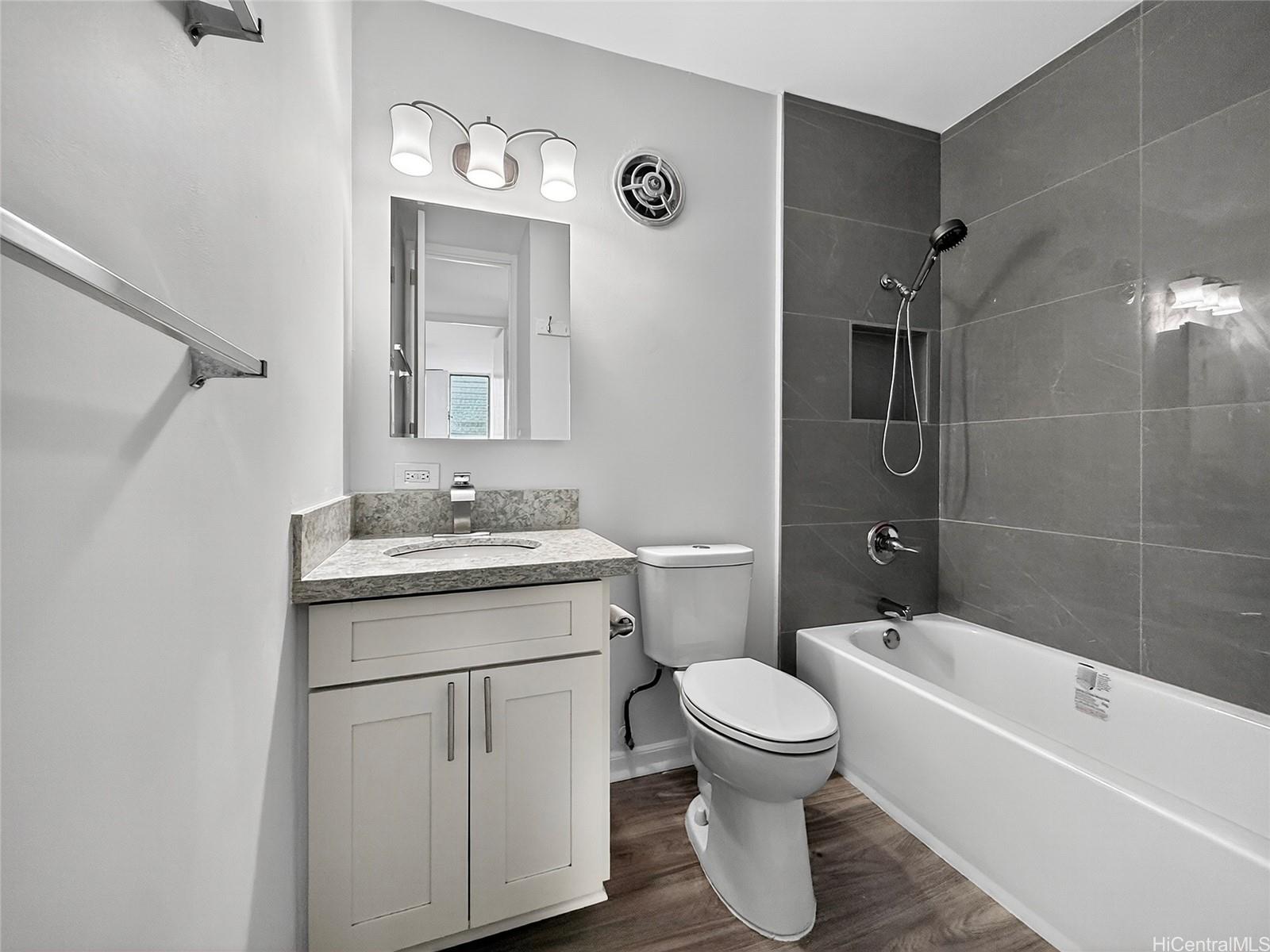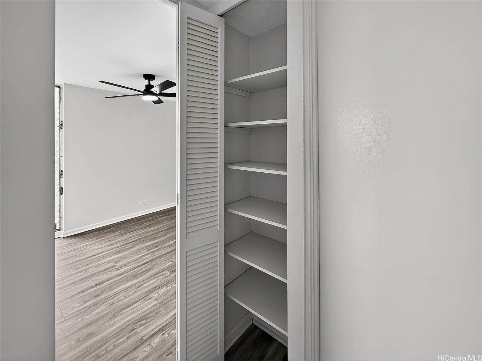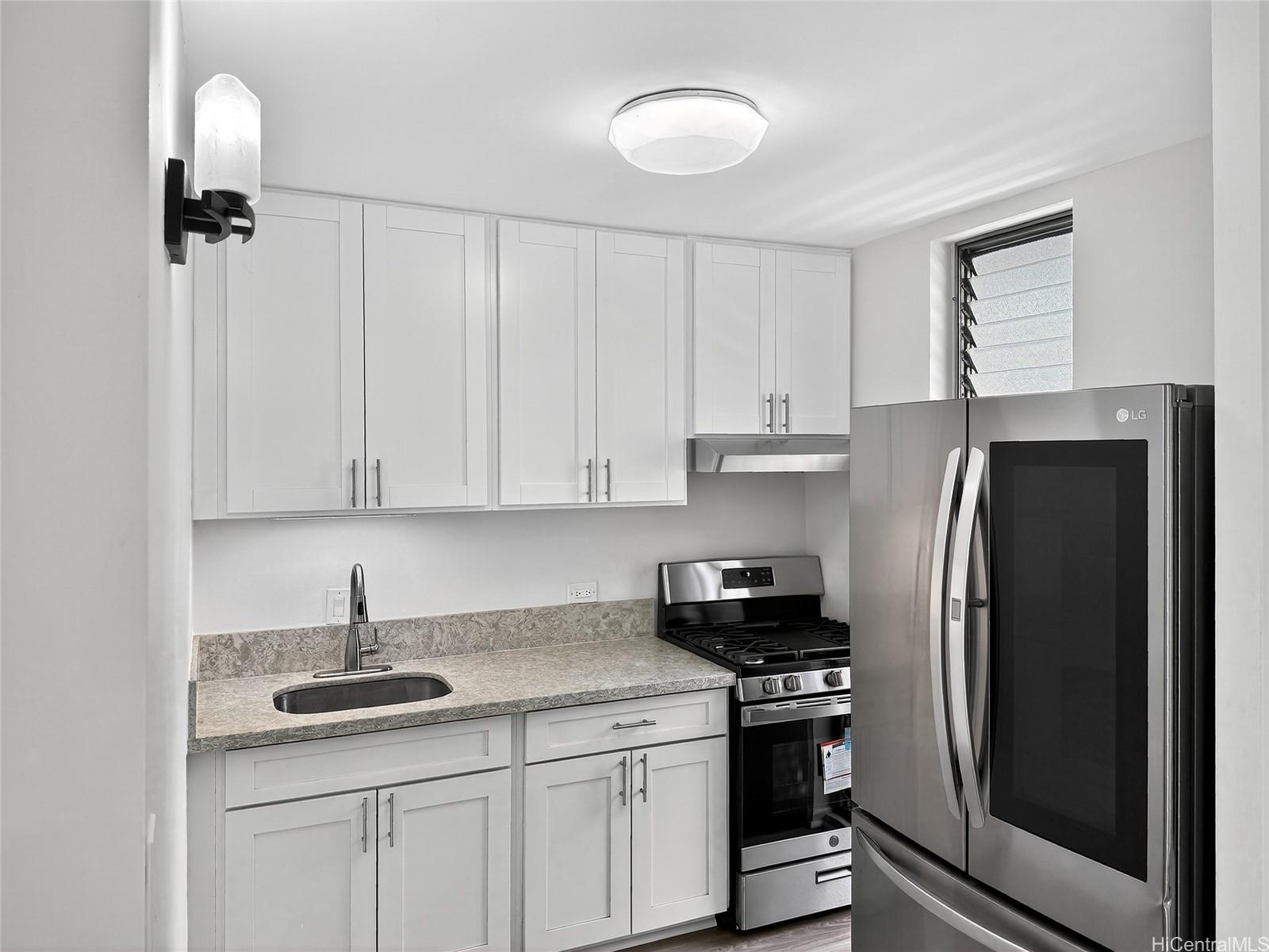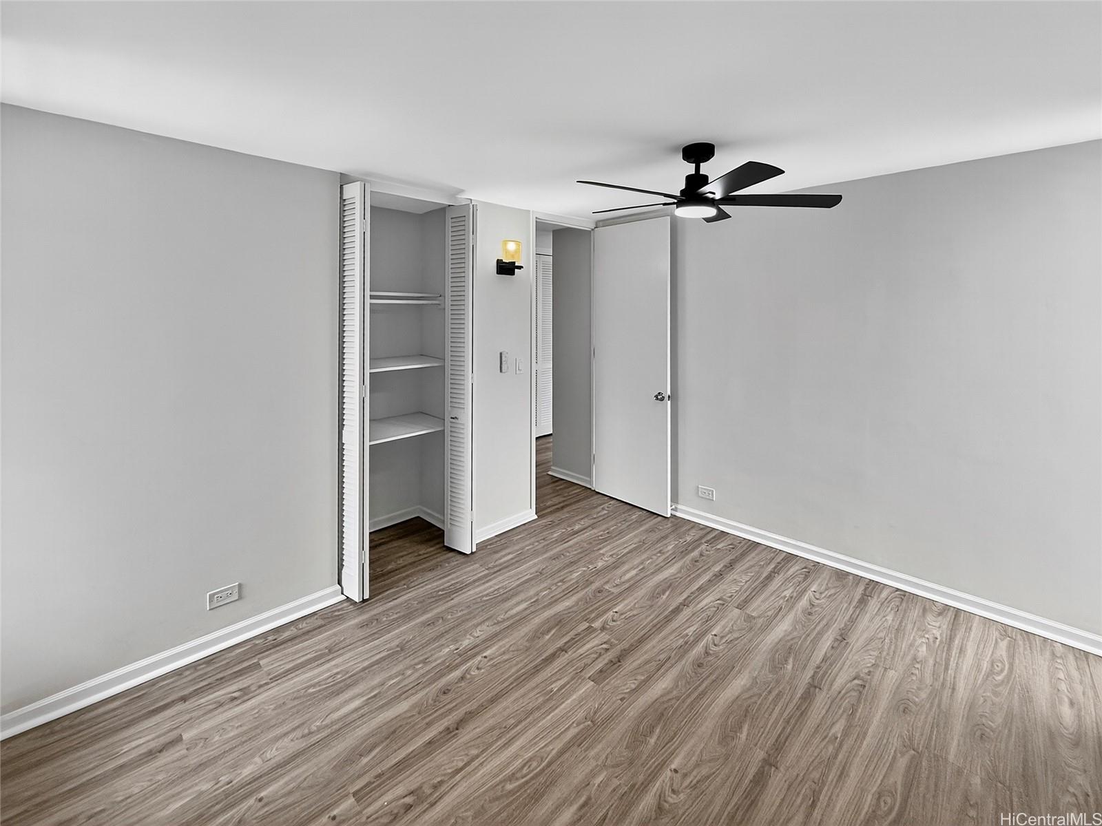 Great location, This convenient and comfortable newly renovated 2-bedroom, 1-bathroom corner unit offers the perfect balance of functionality and comfort. Installed with all modern hidden wire LED lighting, new fans and AC in every room for your comfort. Newly installed vinyl flooring throughout, Cinder block wall patched up & Popcorn ceiling removed! Updated Kitchen with huge 29 Cu. ft refrigerator and new wall niche tub style finish shower. All custom built closets throughout for extra storage room and all your storing needs. With an Extra long parking stall that can fit one 8ft bed truck or may fit up to two small compact vehicle. Features community laundry area. Nearby to Freeway, Ward, restaurant, Blaisdell center, shops for your convenient & travel!