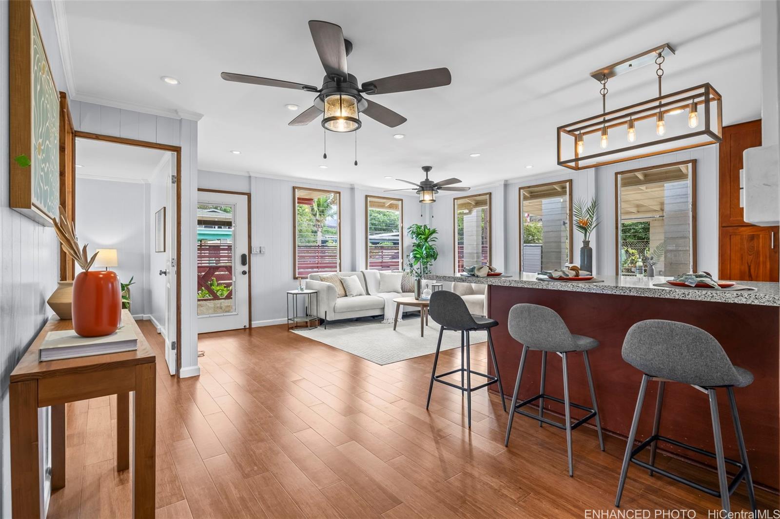 マイリの中心部に位置する、魅力的な3ベッドルーム、1バスルームの住宅へようこそ。420平方フィートのゲストスイート(スタジオ/1バスルーム)が付属しています。島での生活と毎日の快適さが融合する場所です。数々のアップグレードを施し、丁寧にメンテナンスされたこの住宅は、自然光がたっぷりと差し込む開放的で風通しの良い間取りと、全館スプリットシステムのエアコンを備えています。自動開閉式ゲート付きの完全にフェンスで囲まれた敷地に出ると、4台のピックアップトラックが駐車できる広々とした屋根付きカーポートがあります。広い芝生と庭は、エンターテイメント、ガーデニング、そしてリラックスするのに最適です。メインハウスの裏手には、多目的に使える400平方フィートの独立したフレックススペースがあり、エアコンが完備されており、ホームジムやオフィスに最適です。最近の改修には、エアコン、太陽光発電パネル(2020年)、そして2022年に建設されたカーポートと収納スペースが含まれます。ナニカイビーチパークとプウオフルハイキングコースから2ブロックの便利な場所にあるこの住宅は、冒険と静けさの両方を提供します。オアフ島のリーワード海岸にあるこの静かな島の隠れ家を次の住まいにしませんか。