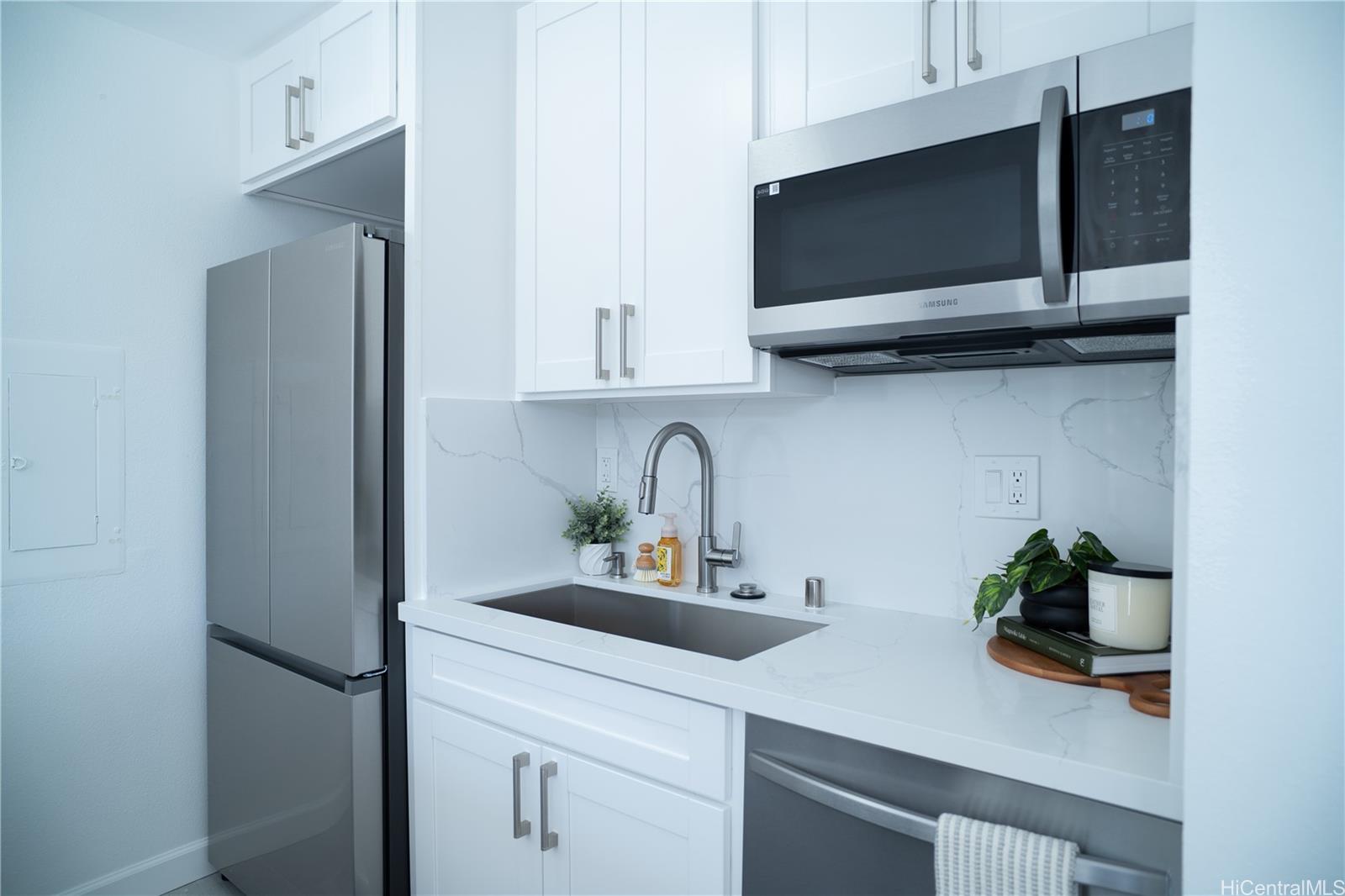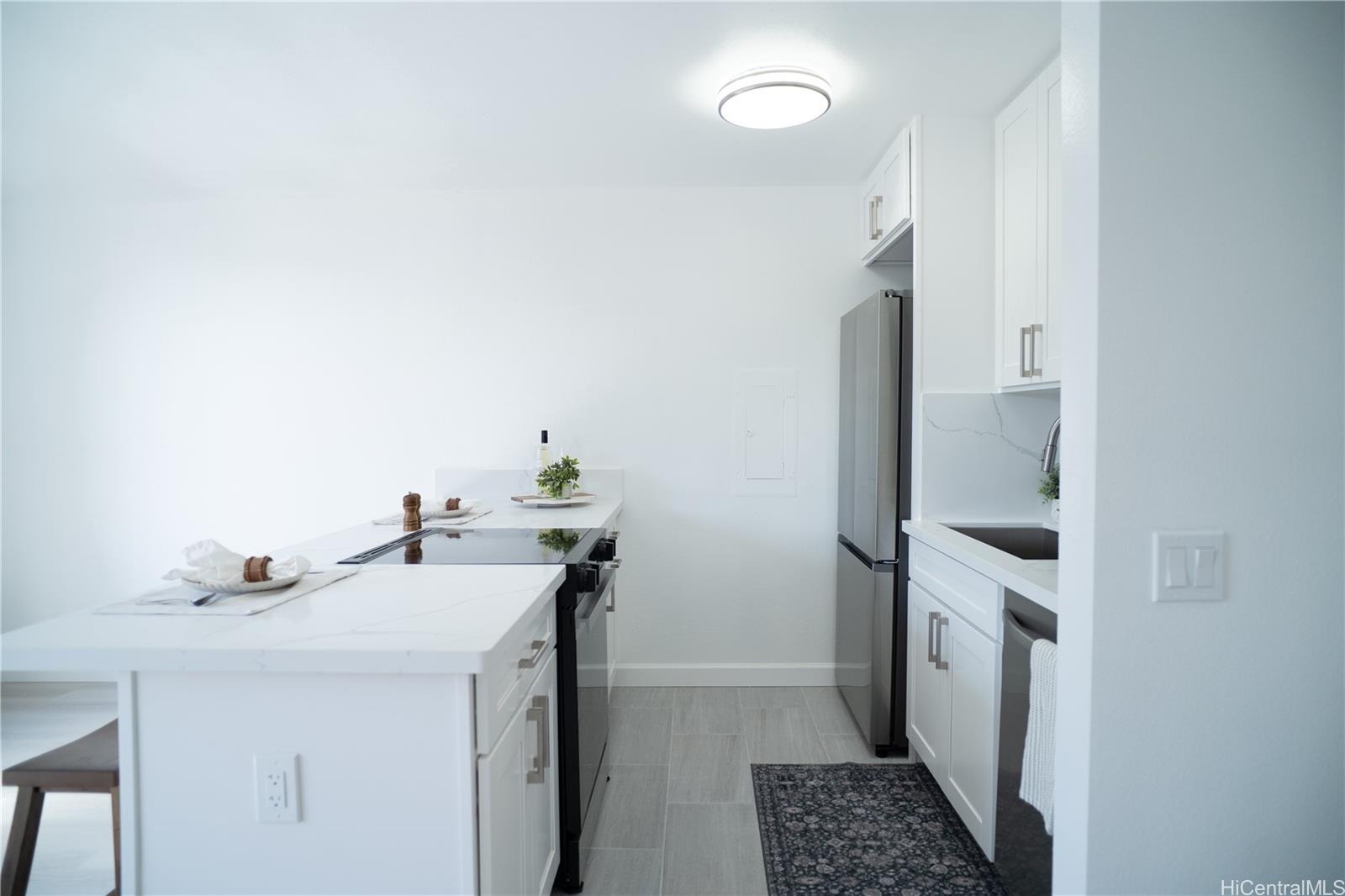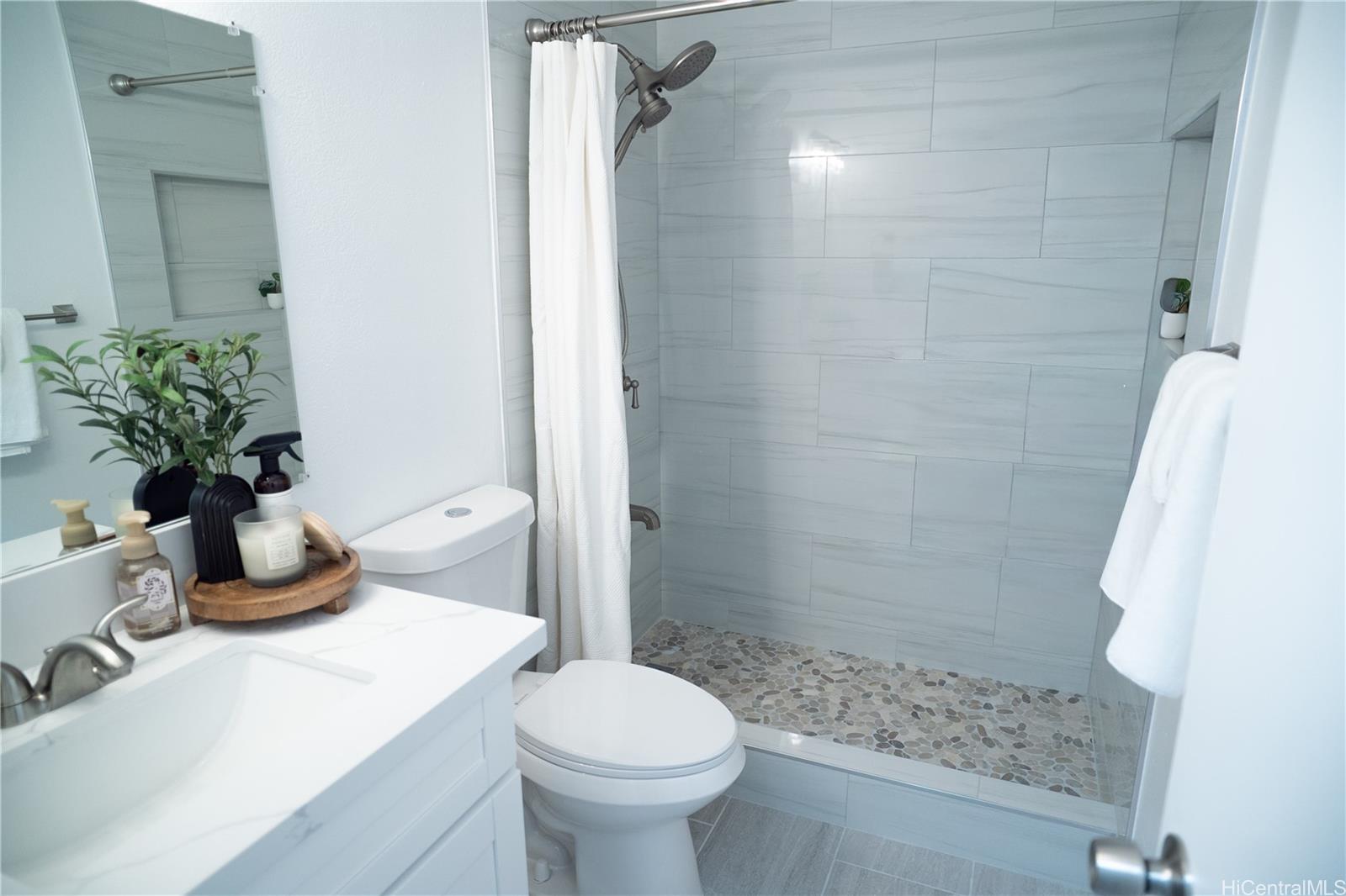 Welcome to your private oasis at Makaha Valley Plantation, Unit 106B – a fully remodeled gem that blends modern luxury with serene tropical living. Step inside to discover an open, light-filled layout featuring brand-new vinyl plank flooring throughout the main living areas and sleek tile in the kitchen and bath for effortless style and maintenance. The heart of this home is the stunning modern kitchen, boasting all-new shaker-style cabinetry, gleaming quartz countertops, and stainless steel appliances – perfect for everything from quick mornings to entertaining guests. Both bedrooms offer generous space and natural light, while the refreshed bathroom includes contemporary fixtures and a spa-like feel. Enjoy resort-style amenities just steps away: two sparkling pools, BBQ areas, tennis courts, and lush walking paths surrounded by swaying palms and mountain views. Gated security, assigned parking, and low maintenance fees make island living a breeze. Just minutes from pristine Makaha Beach and world-class golf, this move-in-ready condo is your gateway to West Oahu’s laid-back paradise. Don’t miss this rare turnkey opportunity!