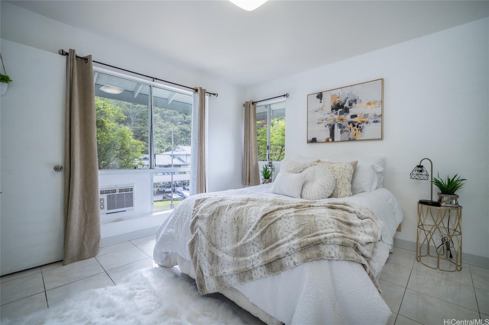 Tucked in the lush Gardens at Launani Valley, this upstairs corner end unit blends privacy with convenience in Central O'ahu. A bright, open living area flows to a covered lanai framed by valley greenery—perfect for morning coffee. Thoughtful layout with a separate primary suite for added privacy, plus in-unit washer/dryer. Practical perks include two assigned parking stalls and ample guest parking, in a pet-friendly community (verify rules). Enjoy resort-style amenities—pool, tennis court, BBQ areas, clubhouse, playgrounds, and shaded walking/jogging paths—set along a peaceful, tree-lined valley. Minutes to H-2, Mililani Mauka shops, and Schofield/Wheeler. Your easy, nature-close lifestyle starts here.