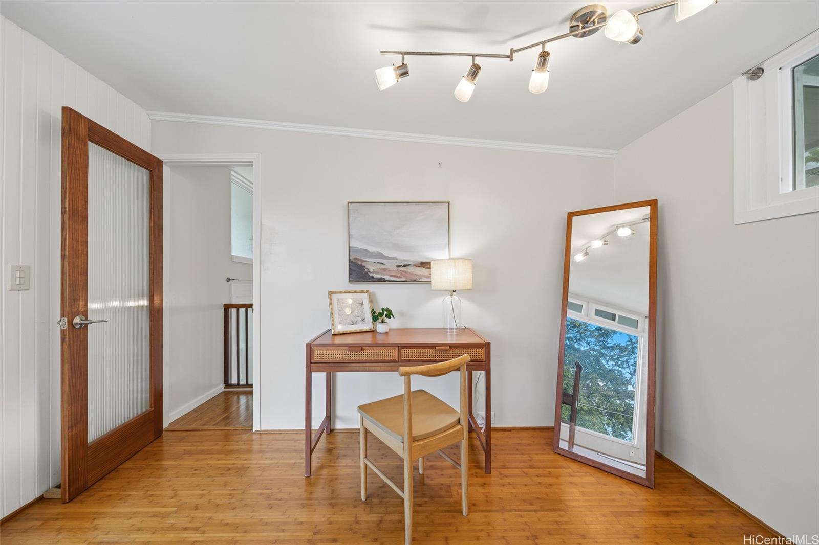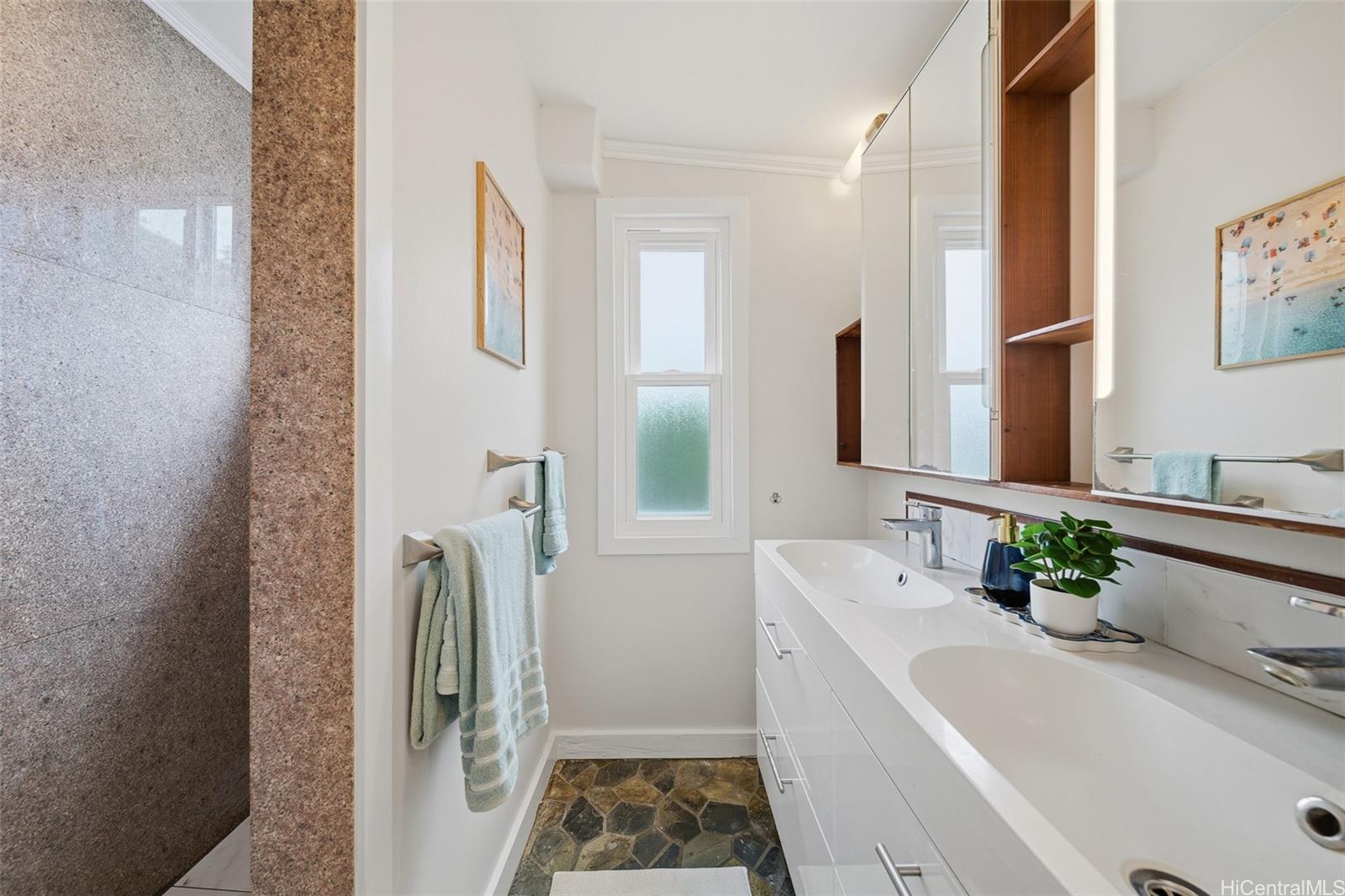 カネオヘ湾を見下ろすルラニ・オーシャンに佇む、ミッドセンチュリー・モダンの至宝。島民の暮らしと時代を超越したデザインが融合しています。ありきたりな住宅ではなく、個性、流れ、そして心地よい空間を体現しています。キッチンとバスルームは長年にわたり改装され、屋内と屋外が繋がっているため、ゲストとの交流もスムーズです。涼しい風が吹き抜ける複数のベランダからは山々の景色を一望でき、緑豊かで広々とした10,710平方フィートの敷地は、夢にまで見たADU(独立居住ユニット)の設置にも最適です。階下には、専用のエントランスを備えた独立したリビングエリアがあり、広々としたリビングやクリエイティブな空間として活用できます。プールサイドでくつろいだり、コオラウの滝を眺めたり、近くのラエナニ・ネイバーフッド・パークからカヤックを漕ぎ出したりと、様々な楽しみ方ができます。2台分のガレージに加え、駐車スペースと広々とした収納スペースも備え、機能性と楽しさを兼ね備えた住まいです。オーシャンフロントの住宅価格に見合うことなく、真の海辺のライフスタイルを実現できます。