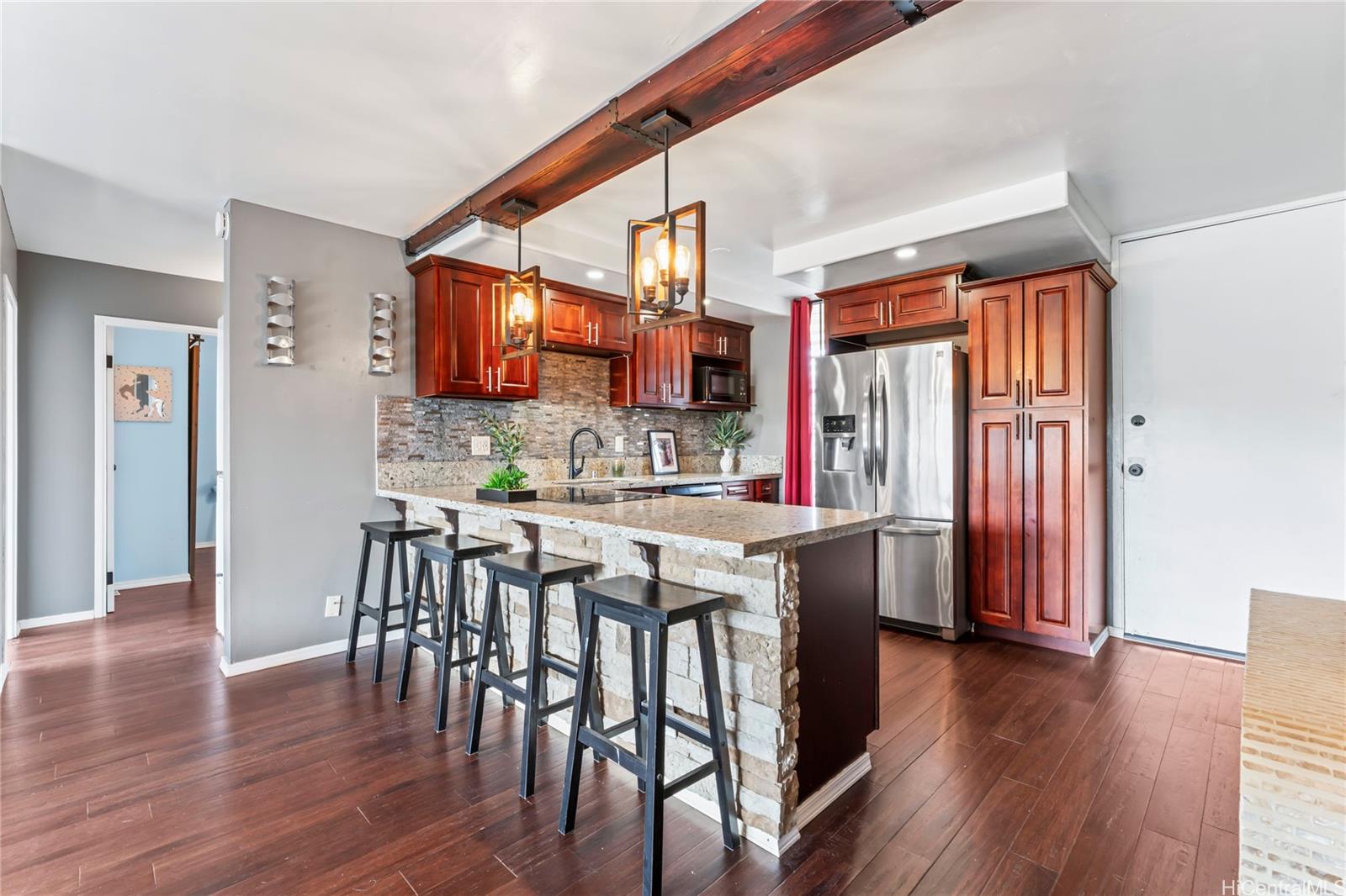 Treetop breezes and gorgeous valley views from this uniquely renovated 2 bedroom, 1 bathroom, 2 parking (one covered), condo with in-unit laundry (in the hallway, NOT in the kitchen)& external storage area. Kitchen features upgraded cabinets and appliances, stone countertops and backsplash, pendant lights and breakfast bar overlooking living room. Living room features wood beam ceiling, with ceiling fan and access to the lanai with gorgeous, breezy views (You can even see the swimming pool!). Storage area approximately 6' x 6' and located on the 9th floor. Two assigned parking spaces, one covered on the second floor and one uncovered on the third floor. You DON'T have to walk up any stairs to get to the unit from the parking stalls. There are walking bridges to the building from both stalls.