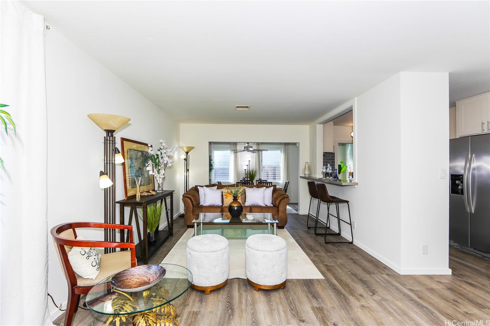 PRESTIGIOUS & rarely available Kuapa Isle! This inviting 4 bedroom 3 bath townhome features a covered lanai upon entry with a tranquil rock garden to sit & enjoy with your morning coffee. The stunning living room, smart breakfast nook off to the side and an additional enclosed lanai beyond the living room will leave you pleasantly surprised. The updated kitchen is equipped with SS appliances and includes a functional pass thru bar to the living room. The entire unit was freshly painted, includes luxury vinyl flooring throughout the downstairs and brand new carpets installed on the stairway and 3 bedrooms upstairs. The fourth bedroom downstairs has its separate entry fronting the lovely rock garden & covered patio. It also includes a full bath and a separate washer/dryer area. This well maintained home is ready for the buyer that is looking to move in NOW. Amenities include Marina access, spacious swimming pool, fantastic recreation room/ clubhouse, basketball court and much more. Well managed community staff, guarded entry, excellent maintenance of grounds, pet friendly complex makes for a truly appealing neighborhood.