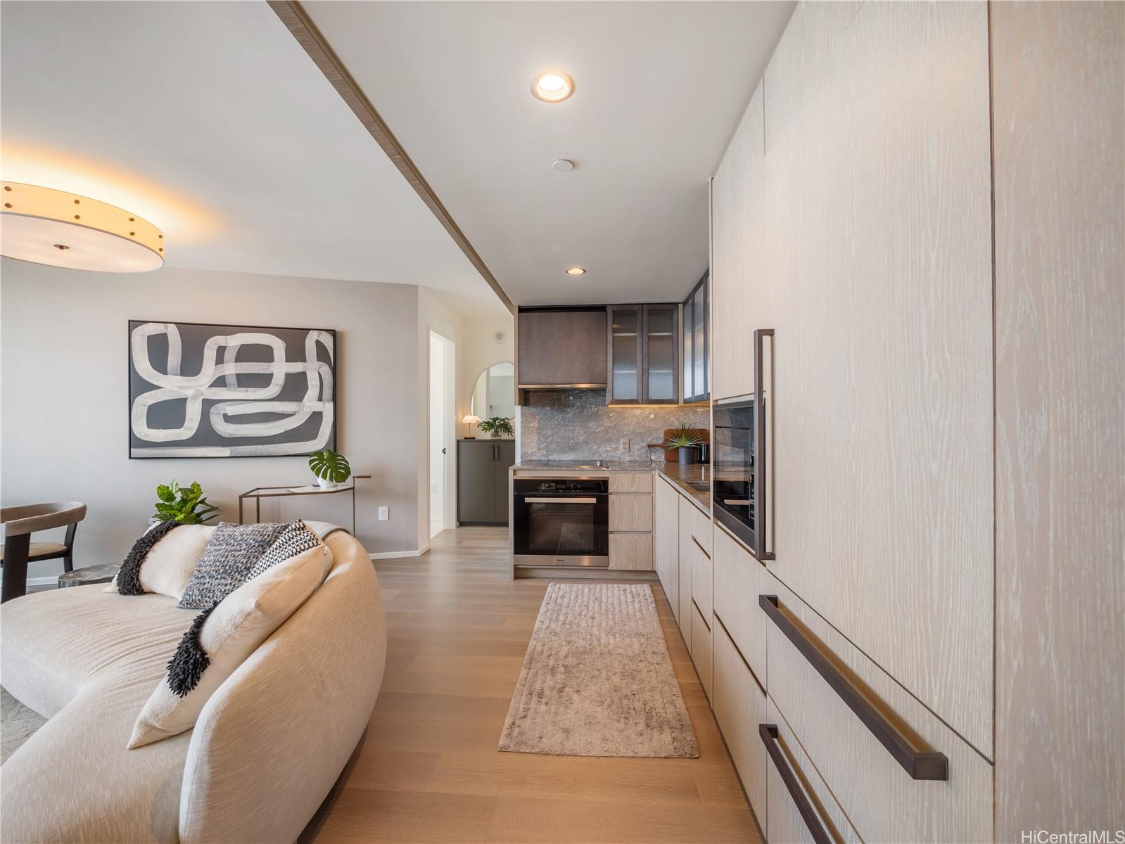 This attractive, upgraded, fully furnished Koula condo offers one bedroom, one bath, and one assigned parking space with an EV charger. Features include motorized drapes, designer wallpaper, and custom built-ins. Enjoy high-end Miele appliances, a modern aesthetic, and access to resort-style amenities. Located in the award-winning Ward Village development, this condo offers convenient access to beach parks, theaters, restaurants, and Ala Moana Center. The building features an open-air lobby, a park-like setting, and over an acre of outdoor amenities, including barbecue areas, a fitness center, and spa pools.