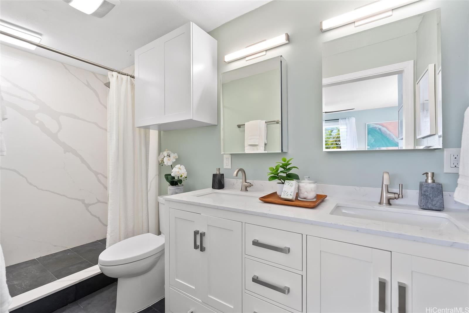 Beautifully remodeled in 2024, this coastal-chic Kailua home offers flexible living in one of Hawai‘i’s most desirable beach towns. Tucked on a quiet cul-de-sac, this breezy property features three separate living areas—perfect for multigenerational living, rental income potential, or a separate home office / home school / home gym. The second-floor main home includes a bright 3BD/2BA layout with sea-glass designer tones, while the ground level offers a stylish 2BD/1BA unit plus a spacious studio. Enjoy 6 bedrooms, 4.5 baths, two full laundries, an extraordinarily spacious garage, and a carport. Live in one space and rent the other two with ease. Just moments from windsurfing paradise Kailua Beach. One lot away from the world-famous Kawainui Marsh. This beautiful home embodies easy island living with room for everyone. Short walk to Kailua town with lots of beachy boutiques and popular dining options. Peace of mind with the fresh remodel and home warranty. Tenants on month to month leases.