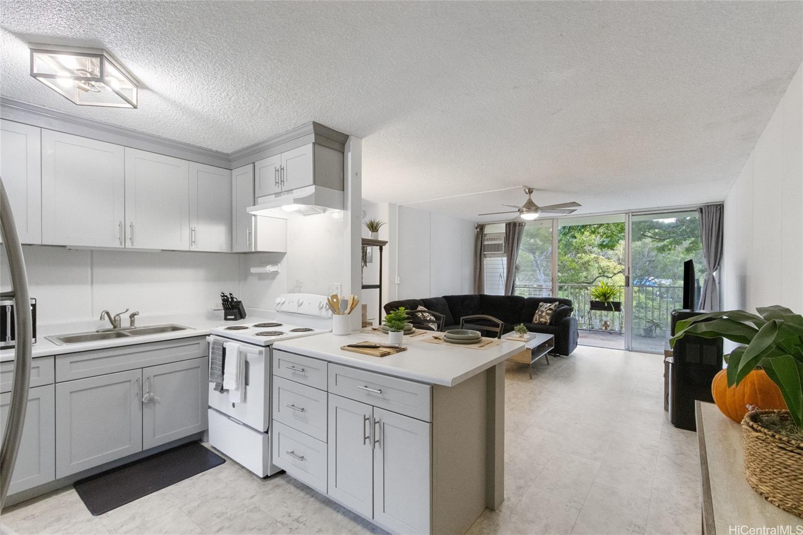 Welcome to Northbrook Melemanu in Waikalani! This spacious 2-bedroom, 1-bath condo offers 896 sqft of total living space and includes 2 parking stalls for added convenience. Remodeled in 2020, the unit features modern updates and a functional layout. Enjoy direct access from the parking garage, making loading and unloading a breeze, especially with no stairs from the 2nd-level garage to the front door. While stairs are present from the parking stall, the layout is ideal for easy drop-offs.