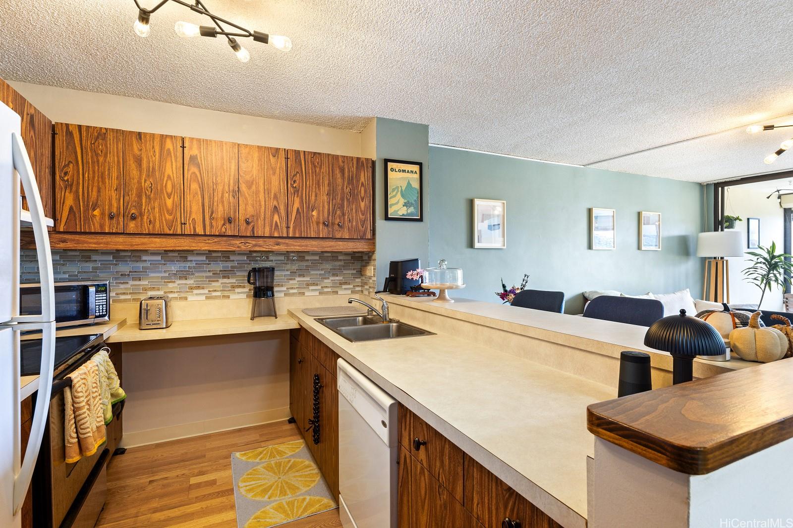 Looking for space and convenience? Excellent indoor/outdoor living with large 175 sf covered lanai with Punchbowl, city and lush mountain views. Kitchen offers tons of storage and counter space for the chef. Open bar that runs the length of the kitchen opens directly to the dining area and living room to enhance entertaining. Improvements include new light fixtures, new paint, audio fire alarm system, refurbished AC unit and oak hardwood floors. Mott Smith has under gone massive improvements to the amenity deck, pool, tennis court, whirlpool, gazebos and grills, garage & more. Total square footage of this unit offer excellent value!