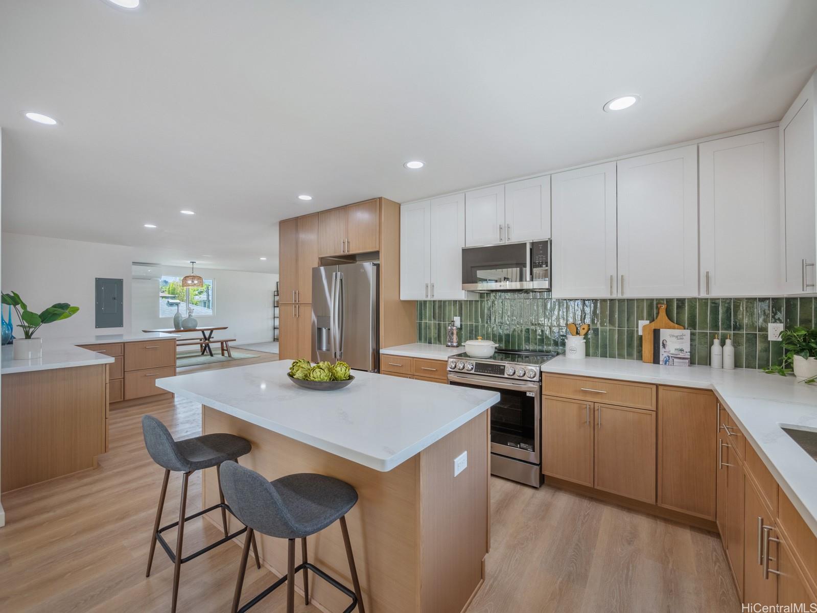 Brand new construction in Kailua's Coconut Grove neighborhood! This 2-story, 5-bedroom, 3-bath single-family home is thoughtfully designed for multi-generational living. The lower level offers 2 bedrooms, 1 bath, and a wet-bar-- ideal for extended family or guests-- while the upper level includes 3 bedrooms, 2 baths, and a bright living room filled with natural light and mountain views through large windows. Enjoy two expansive covered lanais, including an upstairs lanai perfect for relaxing or entertaining with scenic views. Modern finishes and stainless steel appliances complement this fresh, functional layout. A 2-car garage plus driveway parking provides ample space for vehicles and storage. Conveniently located near Kailua Beach, schools, shopping, and dining. For estimated property taxes, assessed value is only land value as the county has yet to assess the improvement value of the subject property. Next Open House Sunday, January 11th, 2pm-5pm.