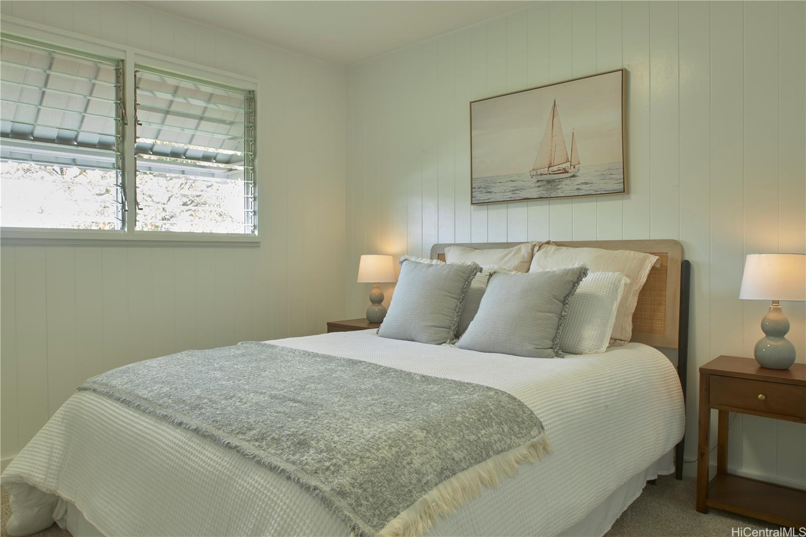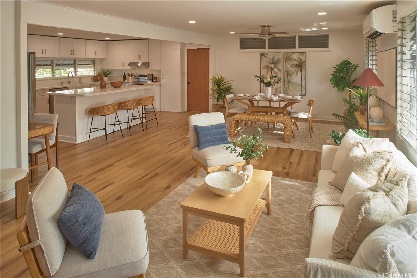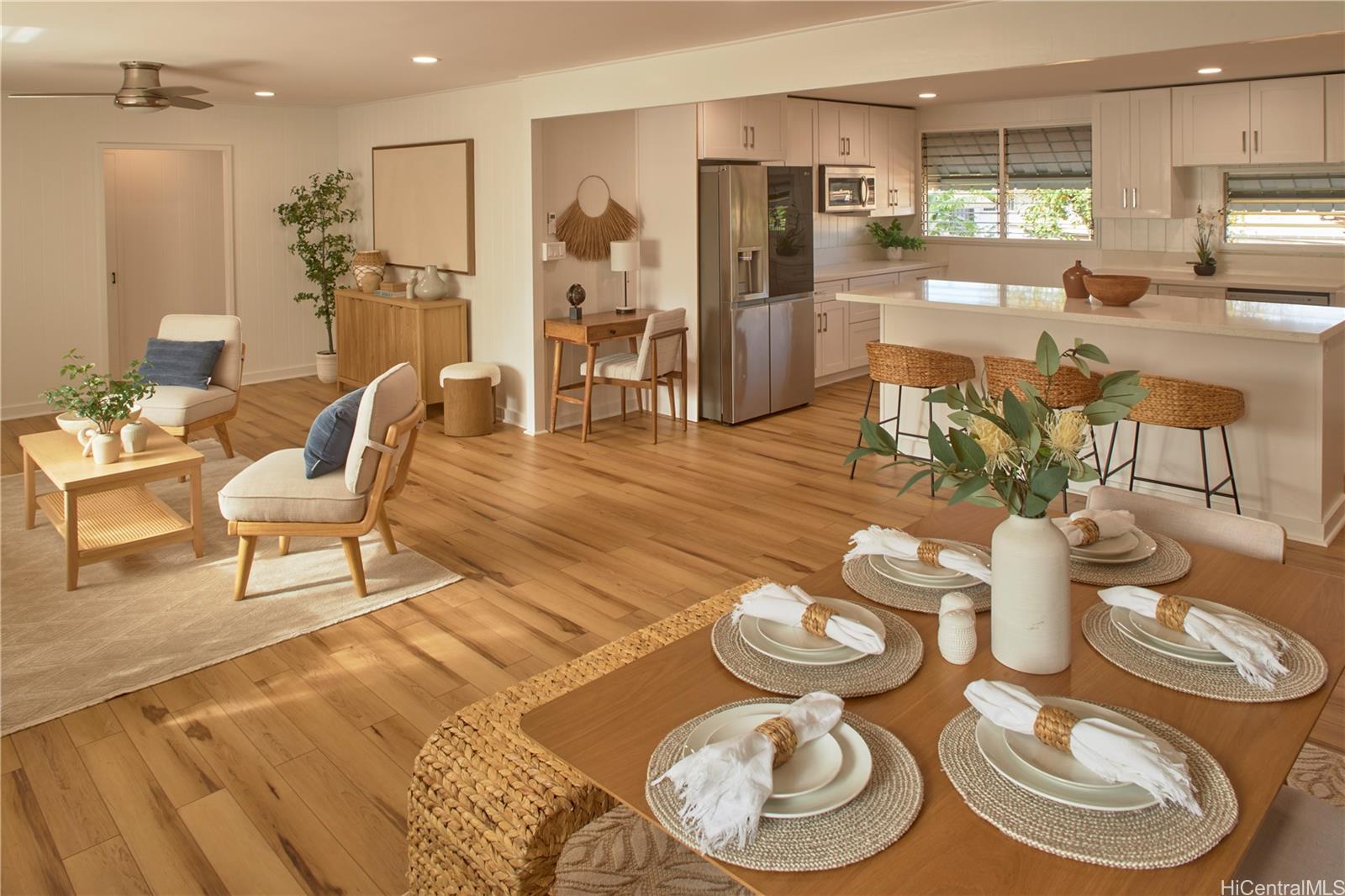 Located in this quiet, established neighborhood is this wonderful, upgraded single-level home. Beautiful and bright, the large kitchen has stainless appliances including beverage fridge, generous counter space and kitchen island, and soft close cabinetry. Ceilings are smooth drywall and there's recessed lighting in kitchen, dining and living areas. The floorplan flows beautifully, making the home feel spacious, and the split a/c and ceiling fans make for comfortable living. The many windows bring natural light and breezes. Vinyl flooring in kitchen/living area and the nicely sized bedrooms are carpeted. Roof is less than 10 years old; there's fresh paint inside and out and a renovated bathroom. Updated electrical and all copper plumbing including new drain lines. This home is move-in ready! The large, level corner lot feels private, is fully fenced and has mature mango, lychee, avocado, papaya and tangerine trees,and banana plants. The carport is extra-large for multiple cars and has storage. Stellar location, just minutes to freeway access and close to Don Quixote, Walmart, Home Depot, and restaurants. Home was just tented and has a warranty. This is a MUST-SEE home!