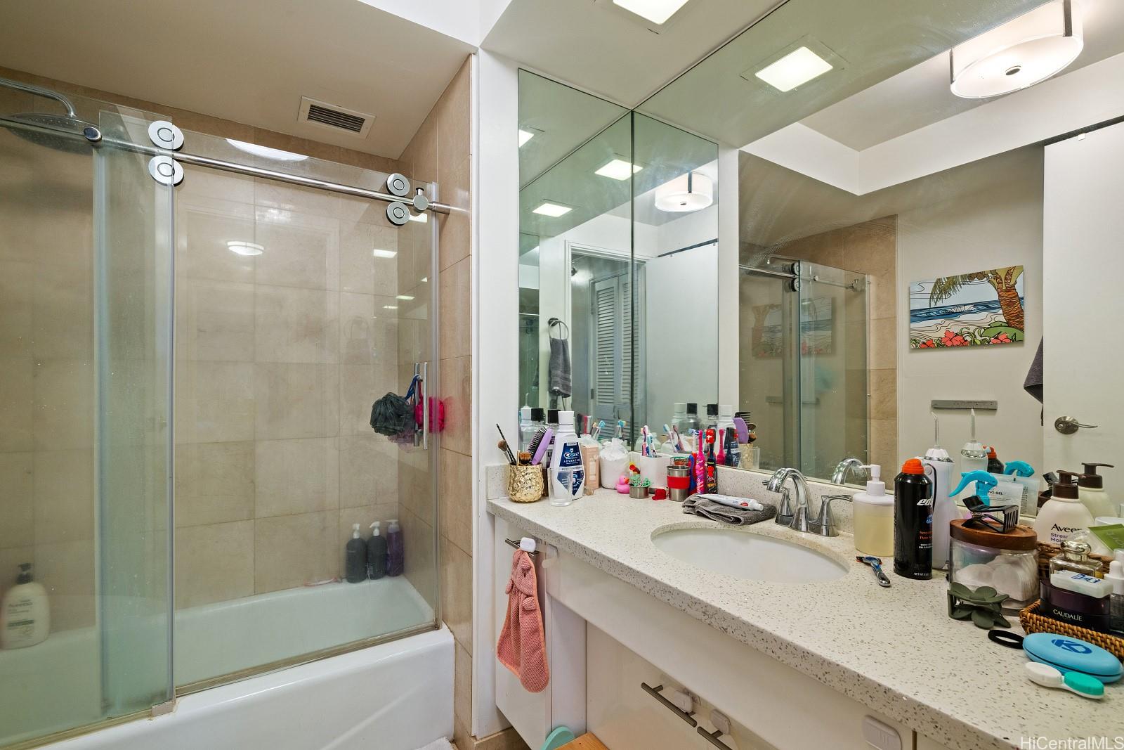 Spacious 1-bedroom, 1-bath unit in desirable One Waterfront Towers, located in the heart of Kakaako. This well-maintained, fee simple condo offers over 800 sqft of interior space with a functional layout and open lanai. Features include a large living area, floor-to-ceiling windows, and a covered parking stall. Enjoy resort-style amenities including a pool, tennis court, fitness center, and BBQ areas. Conveniently situated near SALT, Downtown, and major freeway access. Secure building with 24-hour security and pet-friendly policy (verify). Unit sold AS-IS.