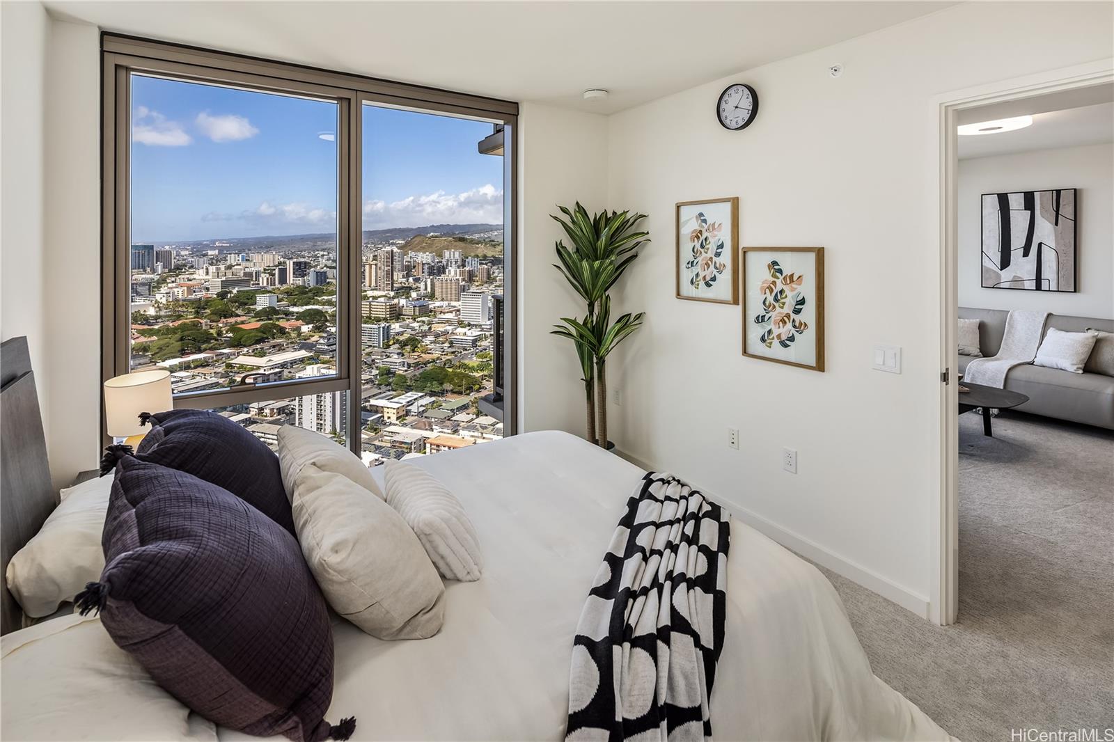 06 unit is offered for the first time above the 35th floor, Residence 3906 is a 2-bedroom, 2-bath layout at Sky Ala Moana West that combines elevated design with panoramic views. Thoughtfully crafted for privacy and versatility, the bedrooms are separated by a spacious living area that includes room for a full-sized dining table—a feature seldom found in this building. The primary suite boasts a dual-sink vanity and a large walk-in closet, one of only two layouts to offer this bonus feature. The second bedroom also includes a walk-in closet, adding to the home’s generous storage. Floor-to-ceiling windows frame sweeping views of Honolulu’s skyline, sparkling night lights, and the majestic Ko‘olau mountains. Residents enjoy resort-style amenities including BBQ cabanas, recreational rooms with full kitchens and outdoor seating, a playground, and a dog run. Plus, complimentary access to hotel-side luxuries: a family pool with jacuzzis, pool bar, lap pool, fitness center, and a full-service spa with saunas, ofuro soaking tubs, and a cold plunge. This is elevated island living—rare, refined, and ready to welcome you home.