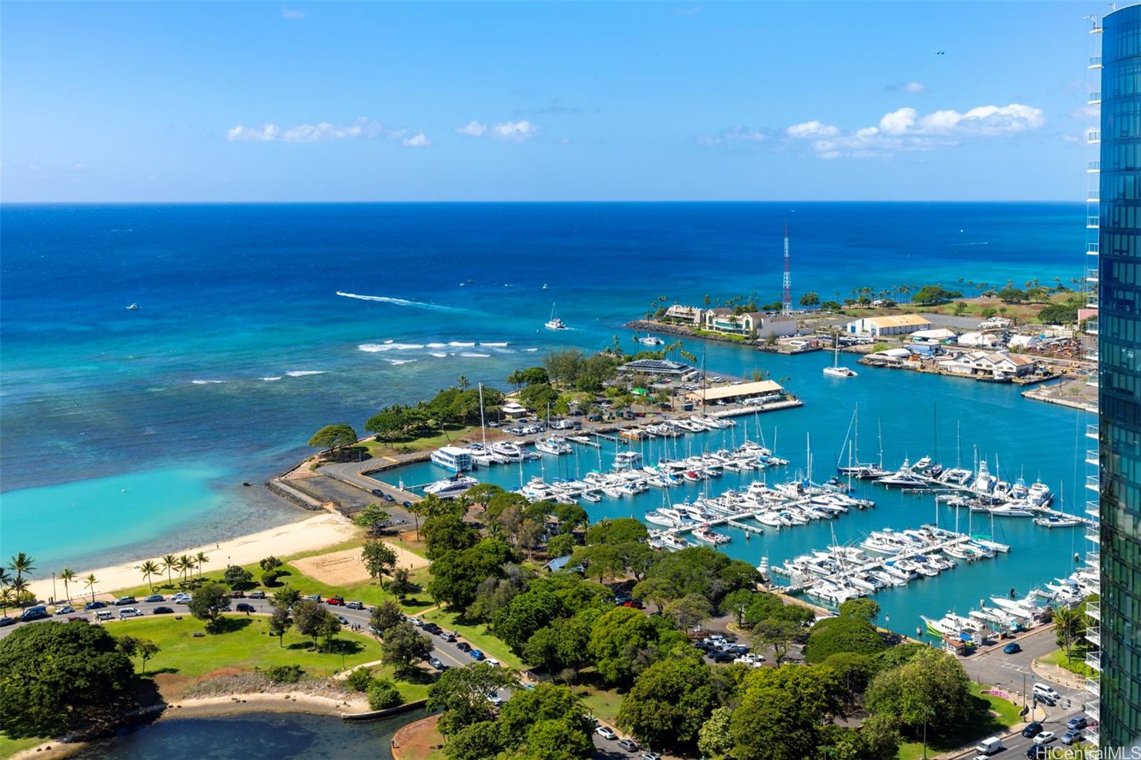 Anaha stands as one of Honolulu's premier ultra-luxury destinations, situated in award-winning Ward Village, where nearby shops, restaurants, entertainment, & sandy beaches are within blocks. This high-floor, rarely available front-corner 3-bedroom, 3.5-bath, 2,445 sq.ft. residence sits just under the Penthouse-level & features higher ceilings, unique to the 33rd floor & Penthouse suites. Inside, panoramic floor-to-ceiling windows in the open-concept luxury living space draw in views from Diamond Head & Waikiki, to Ala Moana Beach Park & Kewalo Boat Harbor. The primary bedroom enjoys stunning Pacific Ocean & Beach Park views, & includes a large walk-in closet & resort ensuite bath. Two additional bedrooms enjoy Diamond Head & Pacific Ocean views. This residence is sold with an additional storage room & EV charger. Anaha features a host of resort amenities including an iconic infinity-edge pool with a transparent overhang, a full-size tennis court/pickleball courts, volleyball court, multiple barbecue areas, kid's play area, golf simulation, billiards room, movie theater room, chef's kitchen, & much more. Listing includes enhanced photos.