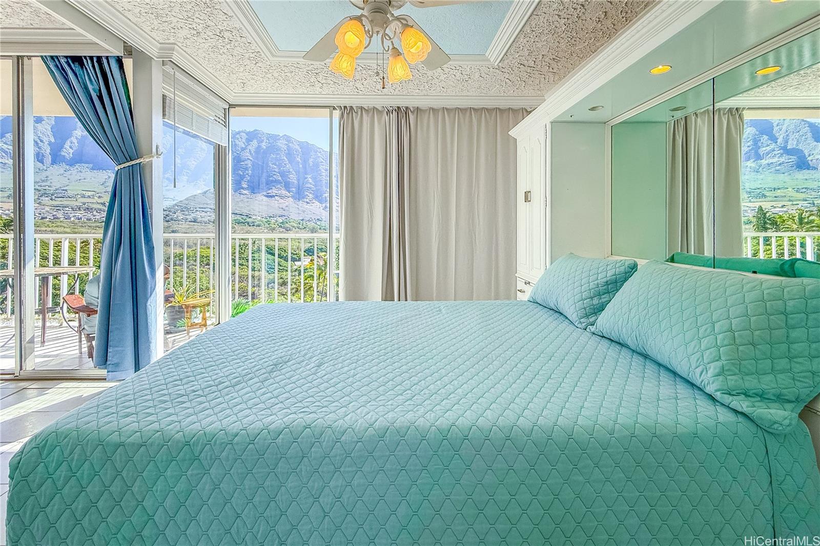 Discover an exceptional opportunity to own a rarely available 2-bedroom, 1 bath residence at Makaha Valley Towers, beautifully positioned in the building closest to the ocean, at a great price! Once owned by a contractor, this thoughtfully improved unit stands out with quality touches, smart functionality, and added durability throughout. This spacious home features an open-concept layout with floor-to-ceiling windows that frame breathtaking views of the ocean, valley, and dramatic mountain ridgelines. Natural light fills every room, creating a warm and inviting atmosphere. Enjoy a modern kitchen with refreshed cabinetry and countertops, updated lighting, and a seamless flow to the living area—perfect for entertaining or unwinding after a long day. Both bedrooms offer generous space, while the bathroom with newly refinished tub, showcases quality workmanship and clean, contemporary design. The unit comes fully furnished so just move on in! Makaha Valley Towers provides 24-hour security, a resort-style heated pool, landscaped grounds, and the unmatched tranquility of Makaha Valley. Located minutes from world-class beaches, hiking, and all the natural beauty the Leeward Coast offers.