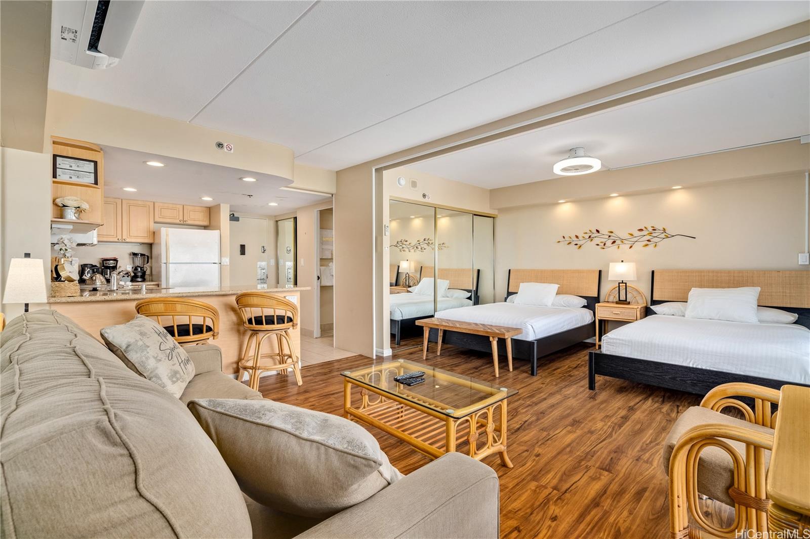 one-minute walk to the beach. The location is unbeatable at the entrance of Waikiki, close to well-known restaurants, Ala Moana Center, International Marketplace, and the Hawaii Convention Center.