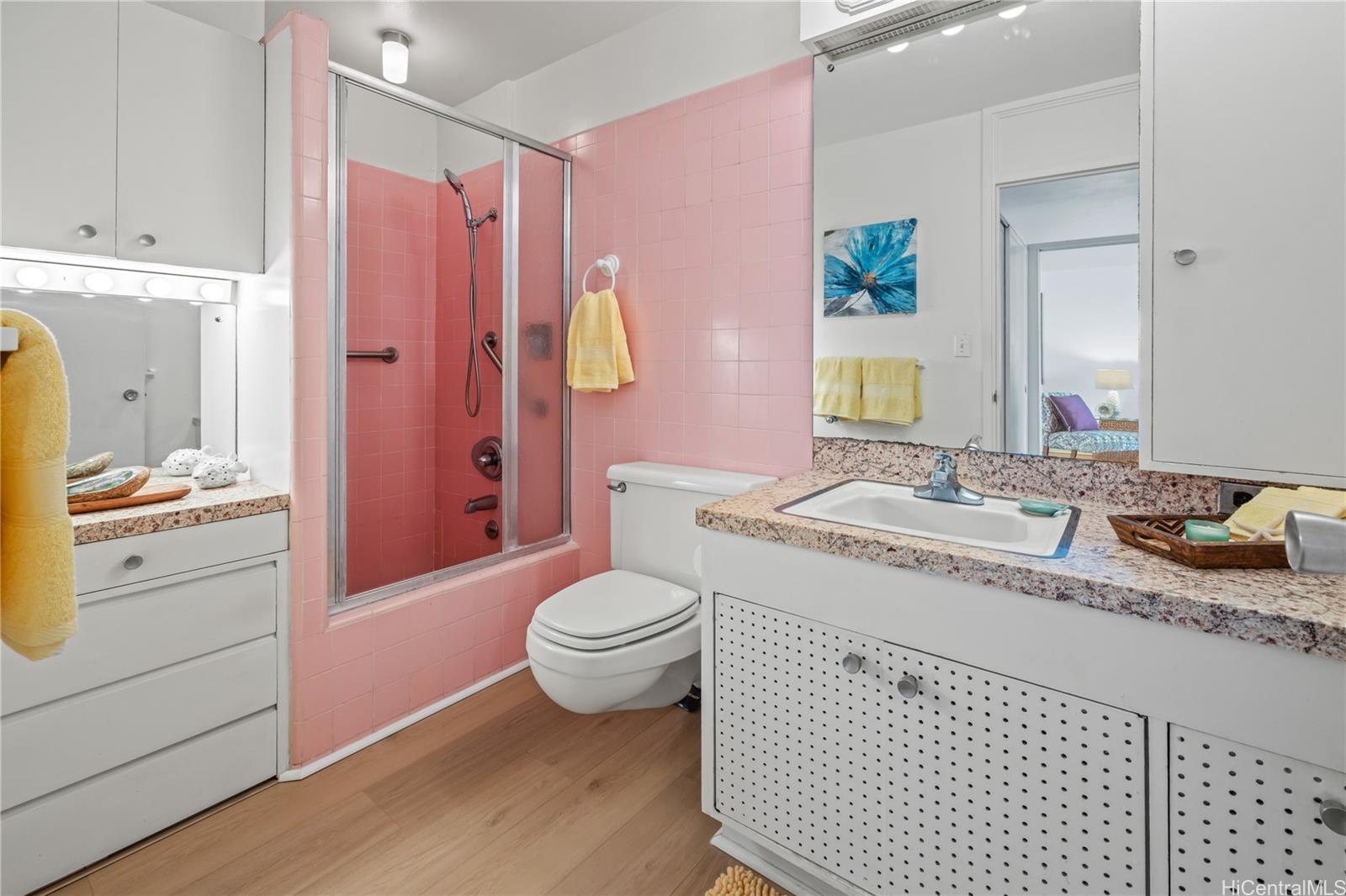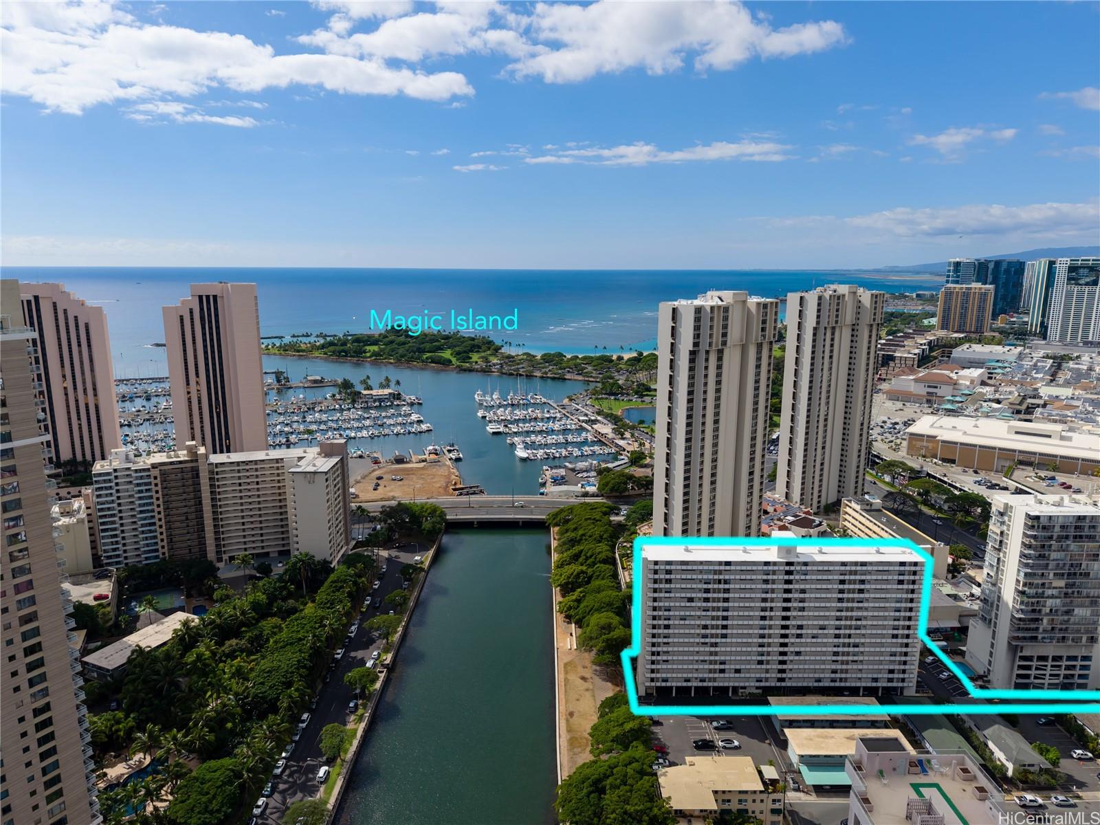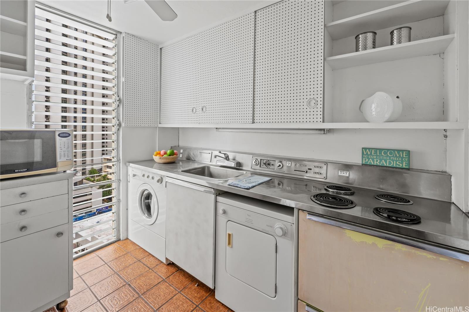 Welcome to Atkinson Towers! This high rise condo is just steps from Ala Moana Beach, the beauty of Magic Island, and Ala Moana Shopping Center. With direct access to the Ala Wai Promenade and the fun energy of Waikiki, you're perfectly positioned for ocean adventures, dining & entertainment. Step into this inviting 792-square-foot, 1-bed/1-bath gem where nostalgia meets modern elegance. Discover charming original features like built-in bookshelves, a dresser, and vanity drawers, complemented by a unique stainless steel integrated countertop. Newly installed luxury vinyl plank flooring and smooth ceilings (no popcorn!) add a touch of modern style and easy maintenance. Imagine unwinding on your enclosed lanai, soaking in the peaceful ocean views and breathtaking sunsets—what a delightful way to end the day! Inside, you'll find a full-size washer and dryer, along with extra storage closets. Plus, there's an additional storage locker on the same floor, making it easy to keep your space tidy and organized.