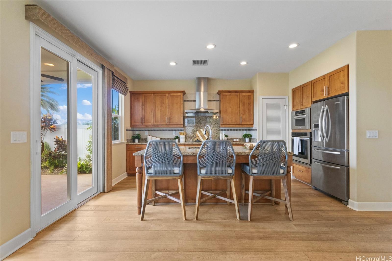 Now with Seller offering $20,000 Credit toward closing! Enjoy golf course views from this island oasis home. Overlooking the fairway of Hoakalei Country Club, this stunning 4 bed, 3 bath home offers an unmatched blend of comfort and island elegance. Its thoughtful design creates a seamless flow between indoor and outdoor living. The heart of the home is a modern, open-concept kitchen outfitted with granite countertops, stainless steel appliances and custom cabinetry. Just outside, the covered lanai leads to lush green space and a patio, featuring built in gas grills. Whether you’re preparing a meal or entertaining friends, this space is as functional as it is beautiful. The bedroom and full bath on the first floor provides convenience and ease of accessibility for guests or extended family. A versatile loft upstairs offers multiple use options — perfect for a home office, playroom, or media space. The primary suite boasts a private balcony with sweeping views of the golf course and Waianae mountain range just across the water, bringing the resort lifestyle right to your backyard.