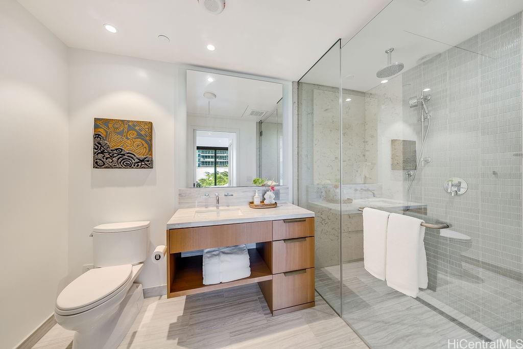 Rarely available 3-bedroom, 3-bathroom unit in the much-desired East-facing ’00 stack of Ward Village’s newest development, Victoria Place. This corner end unit features strong views overlooking the Pacific Ocean, the boat harbor and Diamond Head. Three well-sized bedrooms, an office nook, and a separate laundry room round out this functional living space, which also features custom-designed cabinetry by Studio Becker, Sub-Zero refrigerator, Wolf gas range, oven, and microwave. Victoria Place is a 350-unit luxury development designed by Architect Solomon Cordwell Buenz and placed on the front row of Ward Village. The common areas feature lush, green landscaping by VITA Planning and Landscape Architecture, and the resort-style amenities are in abundance, including a lap pool and lounge pool with ocean views, wine cave, spa, hot and cold plunge pools, fitness center, movie theater, and 24/7 concierge and valet service. This unit comes with two side-by-side parking stalls on the second floor w/an EV-ready 240V electrical outlet, which was installed during construction. No storage unit will be conveyed with this unit sale.