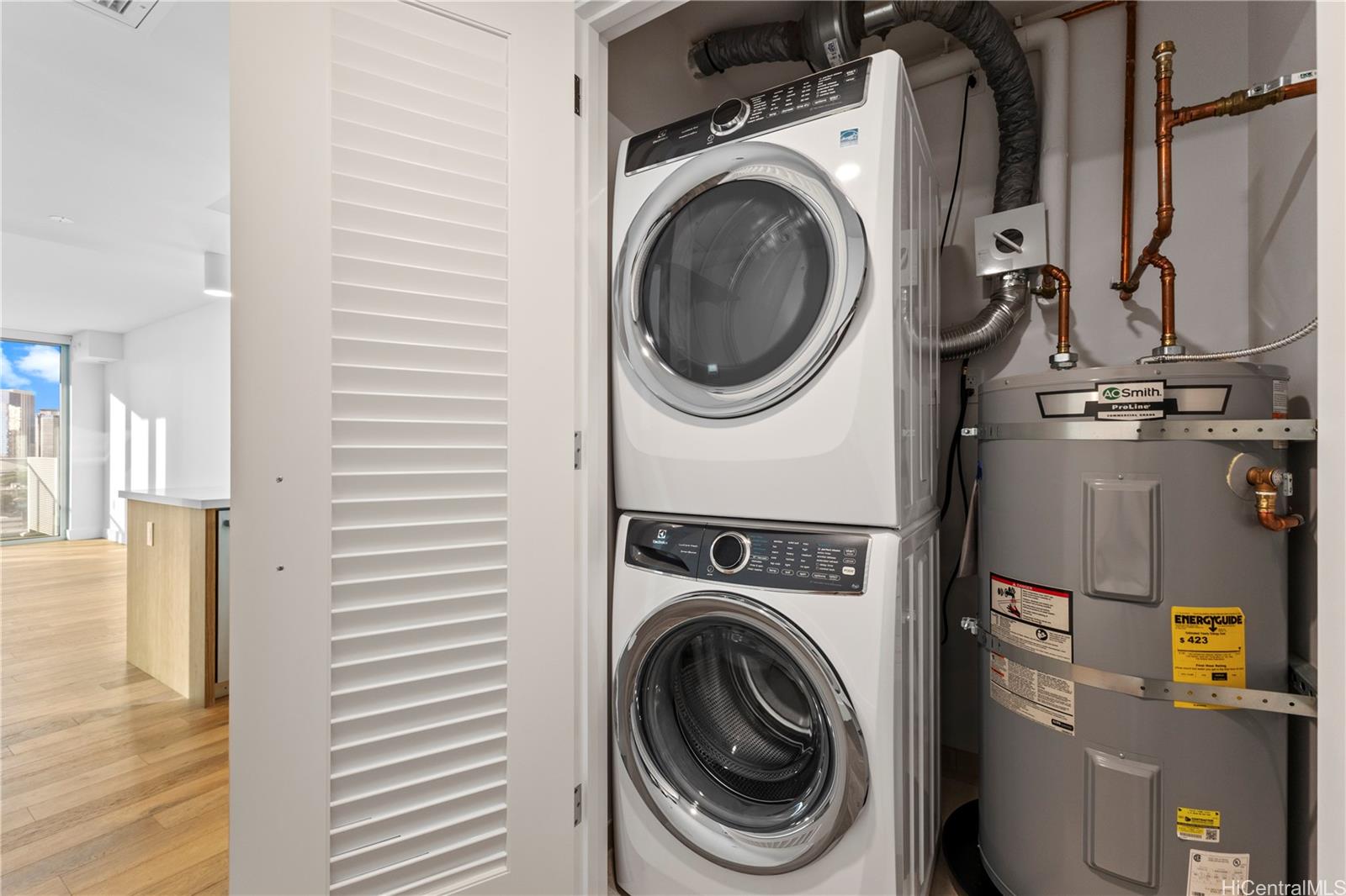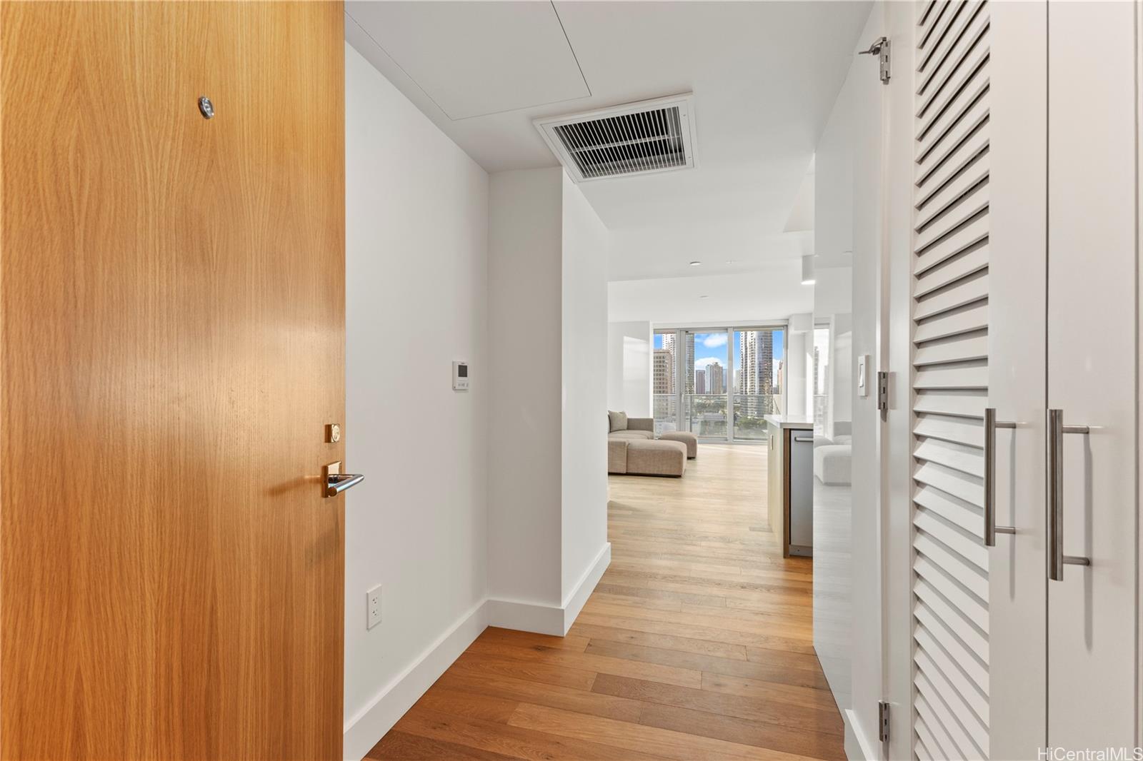 This unique 12-stack corner residence features 1,092 sqft of living area with a spacious lanai and premium upgrades throughout. Enjoy engineered wood flooring, floor-to-ceiling windows, and split A/C with ducts concealed in the ceiling. The modern kitchen offers glossy white cabinetry, uniquely designed quartz countertops, and top-of-the-line Wolf, Sub-Zero, and Bosch appliances.