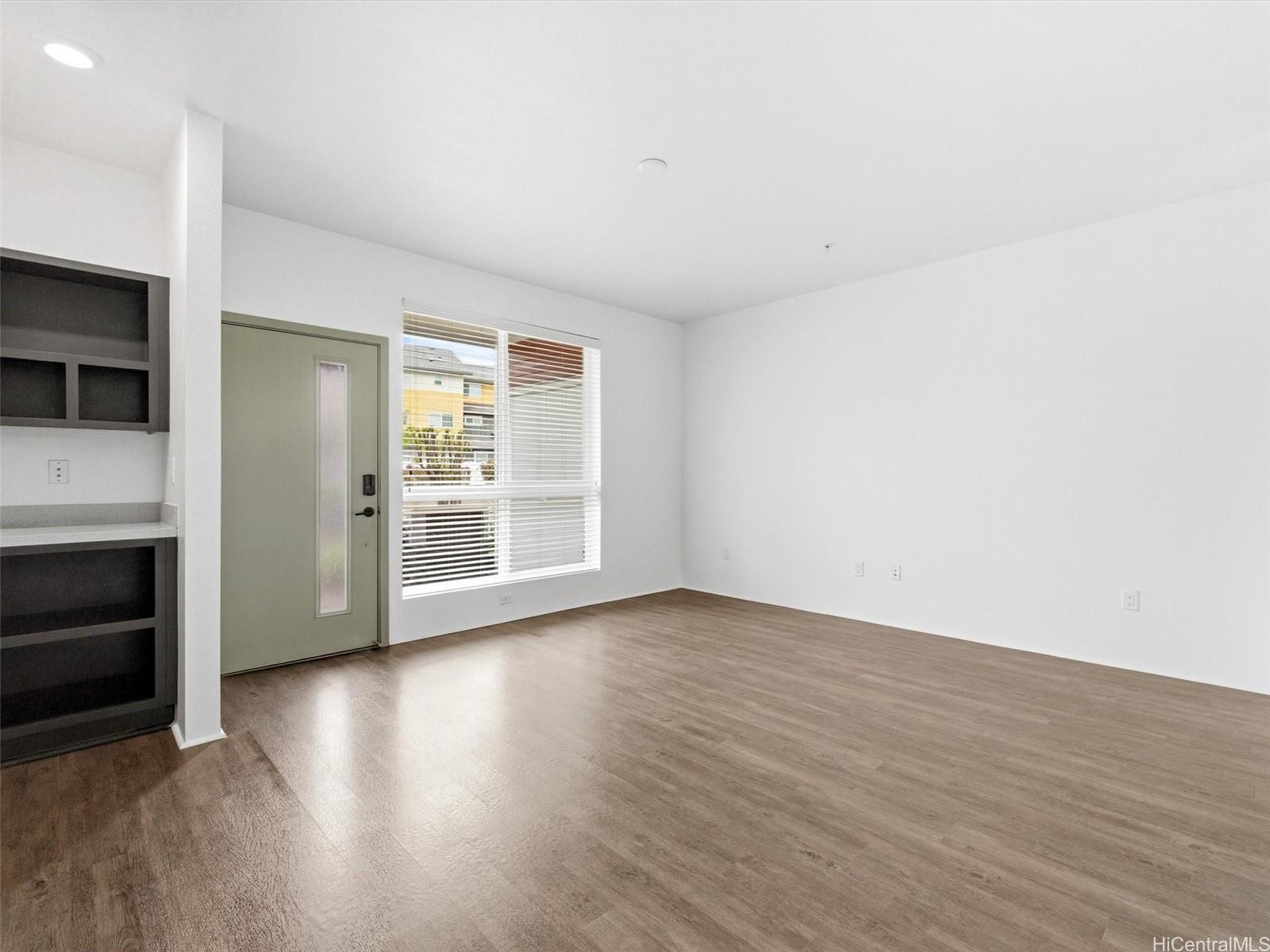 652 interior square feet of comfortable living space. The spacious bedroom opens directly to a private, fenced backyard, providing added privacy and functional outdoor space. The open living and kitchen layout is efficient for everyday living. The unit includes two assigned parking stalls, an uncommon feature for a one-bedroom. Ideally located within walking distance to Ho‘opili’s parks, playgrounds, community pool, Local Joe’s Coffee, and Sage Creamery, with convenient proximity to freeway access for an easy commute. This home delivers ground-floor convenience, walkability, and accessibility in a community where opportunities like this are limited.