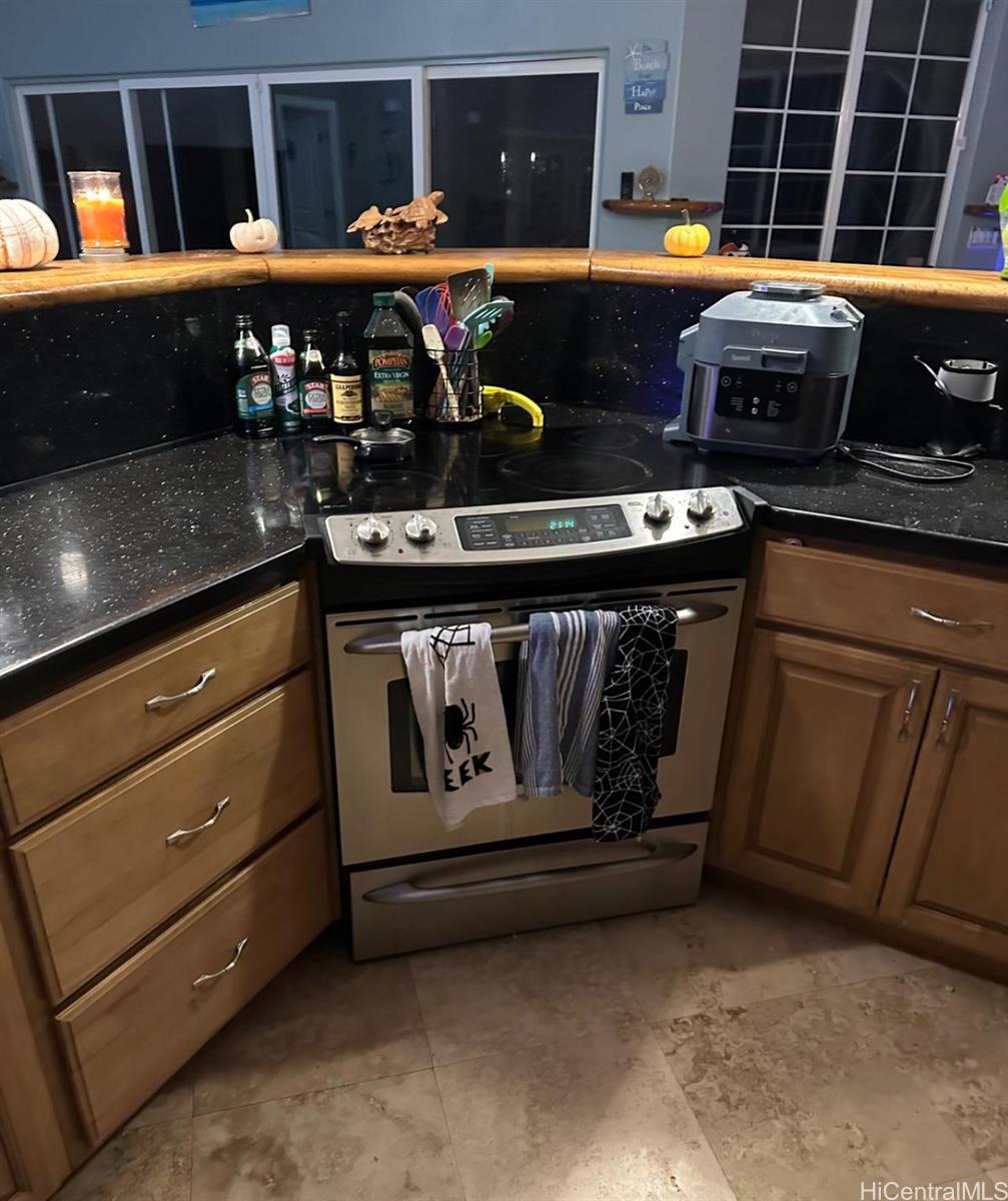 PRICED $200K UNDER LAST APPRAISAL IN 2022. HIGHLY UPGRADED, custom-built home with one bedroom ohana, inground pool, spa, solar, Security, tile flooring, large lanai, automatic gated entrance, fruit trees, and fully landscaped fenced yard. The main home has a 36-panel photovoltaic system (leased). The 1 acre yard offers has many flowering tropicals and fruit (blood orange, jackfruit, avocado, coconuts, papaya, lilikoi, pineapples, tangelo). The one-bedroom, one-bath ohana sits privately tucked towards the back of the property. It has gas for an on-demand water heater, stove, and dryer. The ohana dwelling is permitted as a separate living space with a living area, bedroom, and bath, but the kitchen is not permitted. Updates include: Interior paint 2022, AC split units 2020, Dishwasher 2020, Washer & Dryer 2020, Garage door 2018