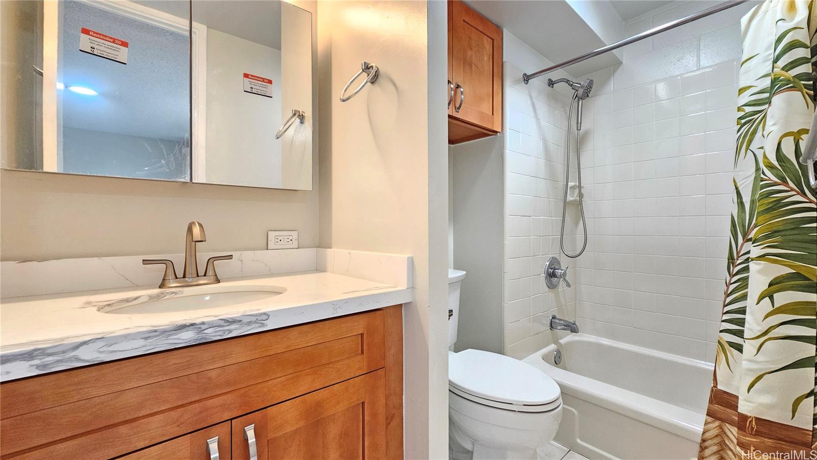HIGHLY RENOVATED in 2025 with BRAND NEW kitchen & bath cabinets, counter tops, sink, vinyl plank laminate flooring, paint, bedroom & bathroom vinyl single hung windows, reglazed bathtub, lowered bedroom partition, mirrored closet doors, refrigerator, toilet, light fixtures, AC, curtains, sliding screen door. 1 year old gas range. Fee Simple 1 bedroom in central & convenient location close to Ala Moana, Safeway, beach, etc. with low maintenance fees of $464 which includes hot water, water, gas and sewer. 1 assigned covered parking stall. Community laundry on first floor. Rycroft Manor is fully insured, Buyer to verify.