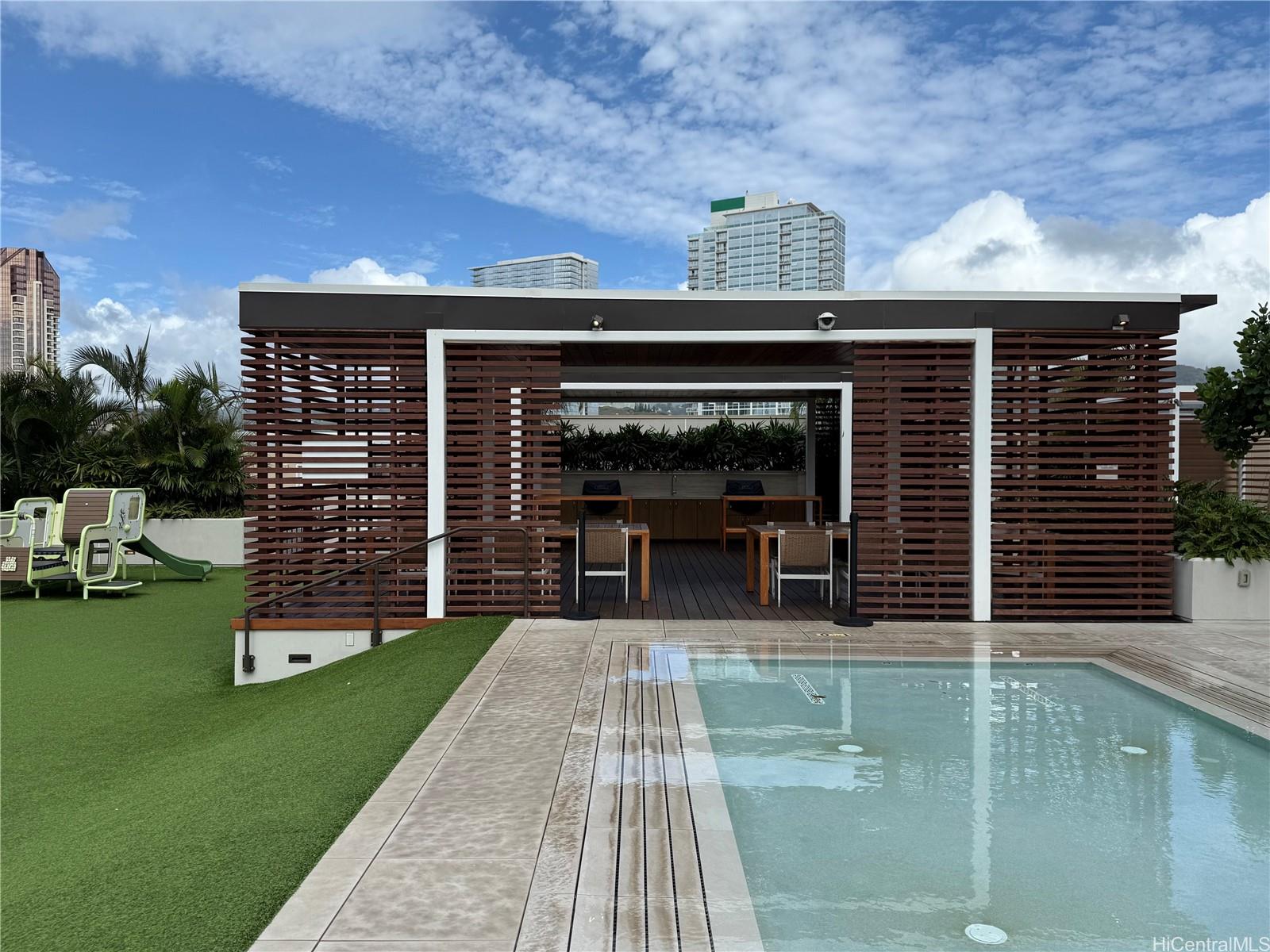 Aalii offers an impressive resort style amenity deck designed for relaxation and recreation, featuring a spa, pool deck, BBQ areas, yoga rooms, private pavilion, multiple cabanas, a fully equipped fitness center, children's pool and playground along with inviting indoor and outdoor gathering spaces.