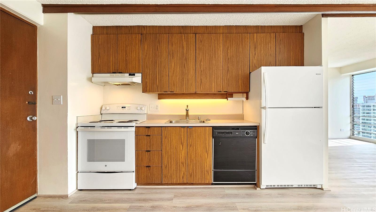 PRICED BELOW MARKET!!! Super desirable high floor FEE SIMPLE 1 bedroom on preferred Diamond Head side with sweeping mountain, Ala Wai Canal, Diamond Head, ocean & city view. Upgraded with BRAND NEW laminate plank flooring, paint (walls & ceiling), lighting fixtures, electric plates, switches, outlets and kitchen faucet. Ideal parking assigned covered stall with easy access. Assigned storage locker. 2 washers & 2 dryers on each floor. Great location - close to Ala Moana, Don Quijote, Palama Market, Waikiki, 24 Hour Fitness, numerous restaurants, banks, Walmart, beach, etc. Pool on 27th floor with cabanas.