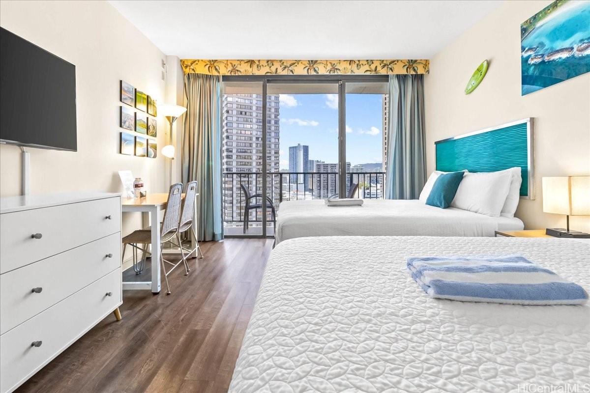 活気あふれるワイキキの中心部に位置し、島の優雅さと抜群の利便性が融合したパームス・アット・ワイキキへようこそ!高層階に位置し、広大な街並みと山々の景色を望むこの美しく整えられた、家具完備のターンキー・スタジオは、短期賃貸やプライベートな隠れ家として、また、合法的な滞在先として最適な物件です。島の魅力に囲まれたプライベートラナイでくつろぎ、2階には希少な大型専用駐車スペースが1台分あり、利便性も抜群です。ワイキキでも貴重な物件で、ゲストにもオーナーにも最適です。輝くプール、フィットネスセンター、バーベキューエリア、ランドリー設備、24時間対応のフロントデスクなど、充実したアメニティをお楽しみください。ワイキキビーチ、アラモアナセンター、そして世界クラスのショッピングやレストランもすぐ近くです。比類のない柔軟性、高い収益性、そして最高のロケーションを備えた楽園の一角を所有するチャンスをお見逃しなく!