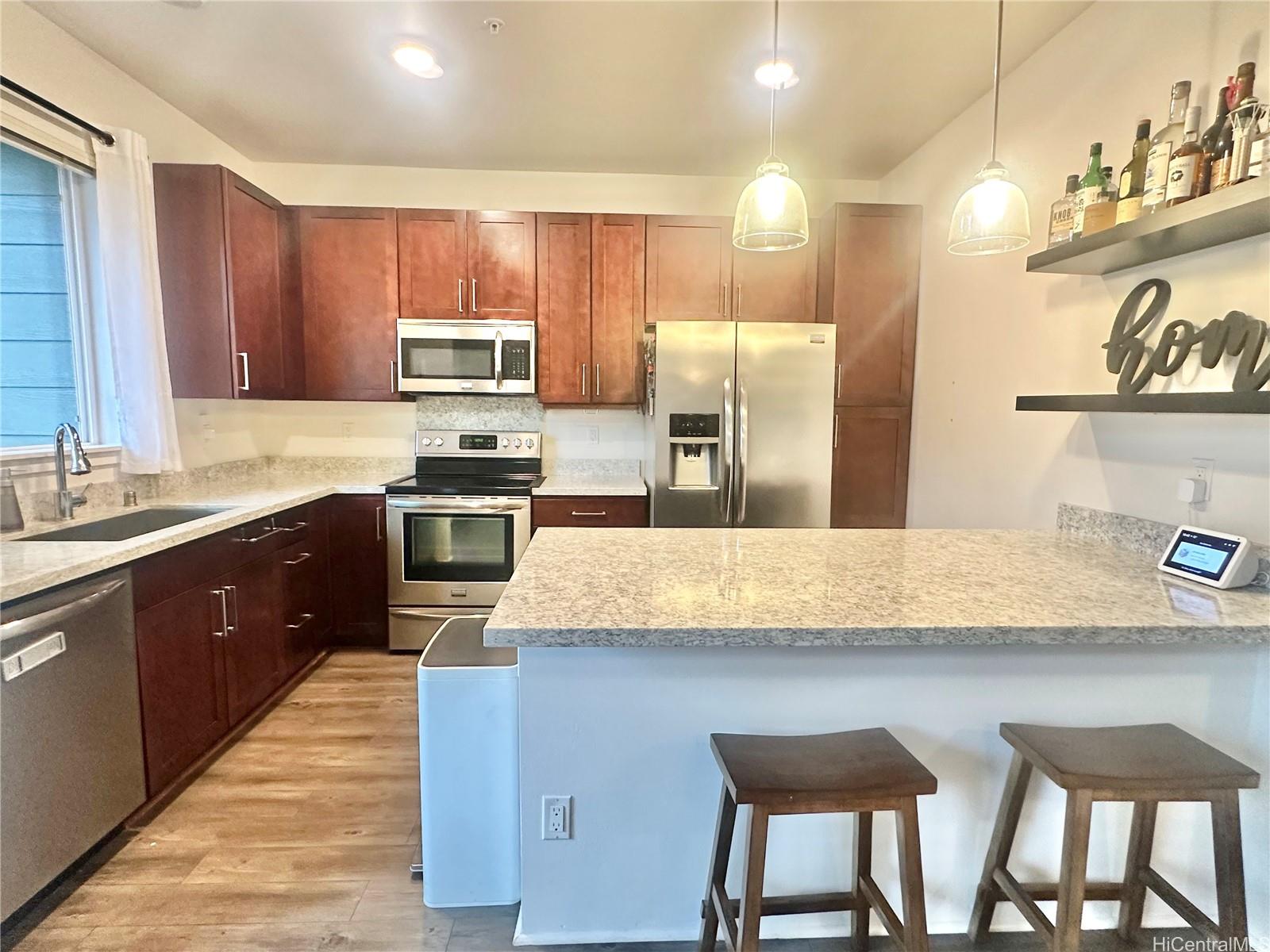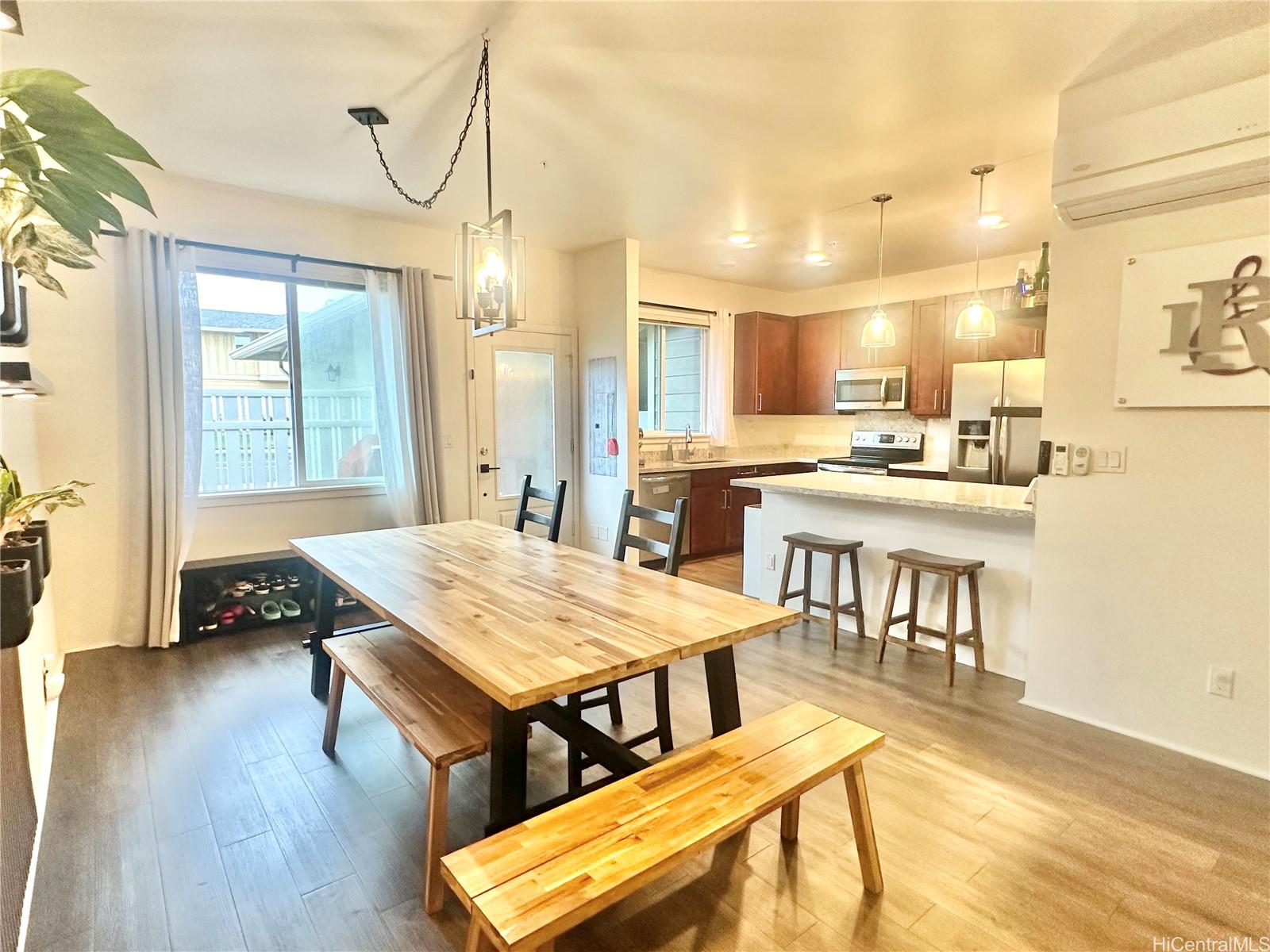 A really amazing opportunity to buy into desirable Haloa at Hoopili! These townhomes are located closer to the parks for the kids and pets. Haloa has a larger, more open floorplan feel with no units above or below and spacious open concept living, a large primary bedroom and bath with custom IKEA closet system, a welcoming front yard and buffering back yard. Modern touches for the new owner, such as open shelving, drop down knife drawer, and even a self-watering living wall. Additionally, this unit is well located close to guest stalls, street parking and an open turn around area, adding to the easy going open air feel of this home. Come see and compare - feels as spacious as a single family home!