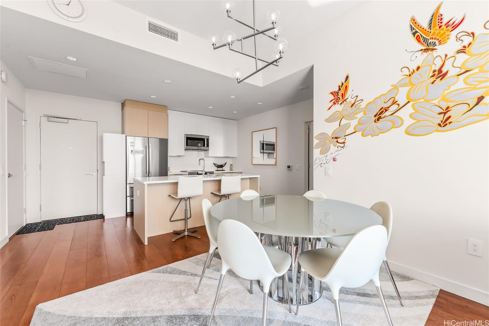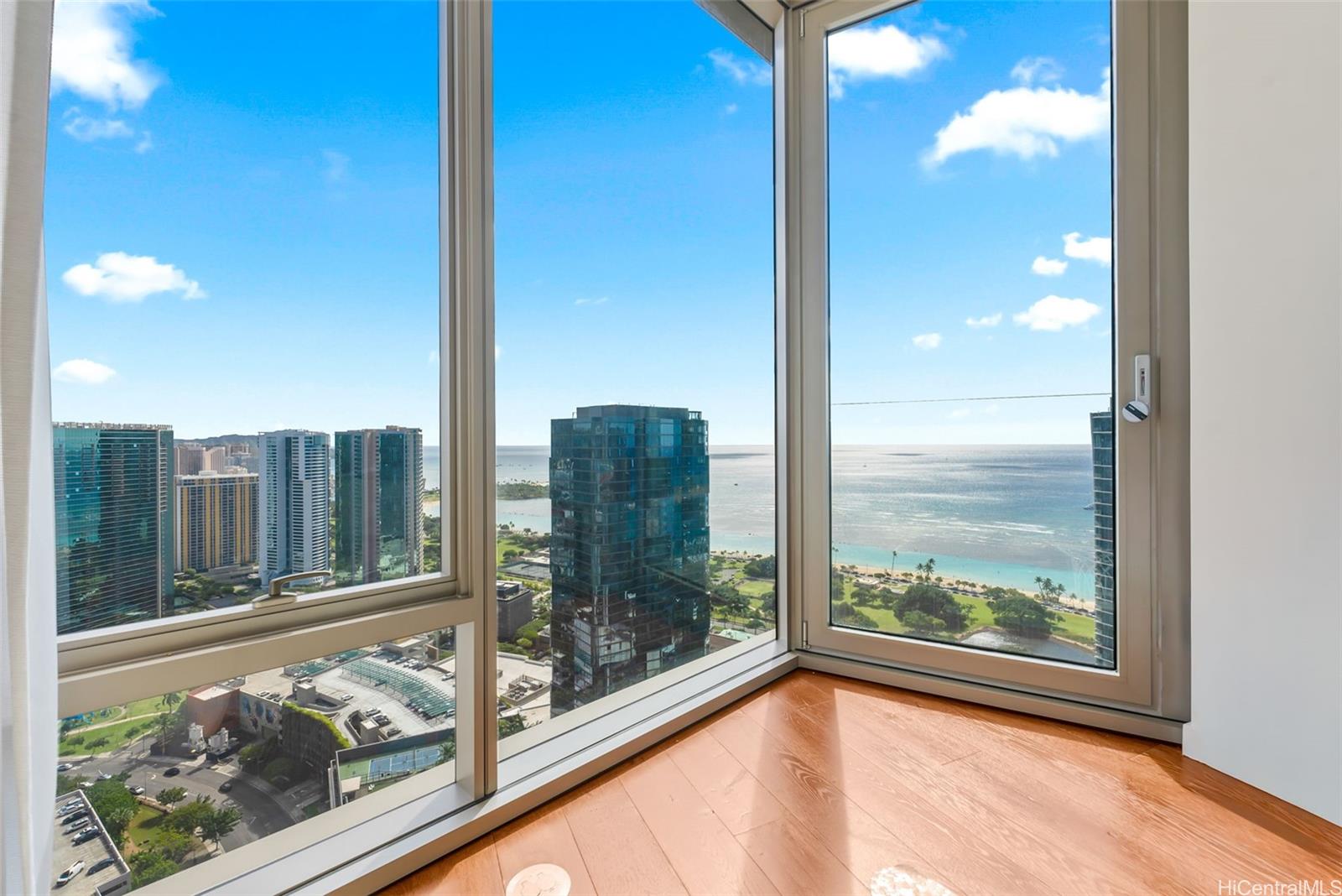 BEST VALUE & LARGEST 2-Bedroom 08-Stack Penthouse-Level Residence in Ae'o. Located on the preferred Diamond Head side, this penthouse-level home offers PH higher ceilings and a noticeably more open, premium feel. One of only a limited number of 2-bedroom residences built at 1,092 sq ft, #3908 provides meaningfully more living space than other penthouse 2BR offerings currently on the market. Floor-to-ceiling windows frame ocean, coastline, city, mountain, and sunrise views while capturing cool tradewinds and balanced natural light throughout the day. The well-designed split-bedroom layout features a contemporary kitchen, quartz countertops, and Bosch appliances, along with quality wood flooring throughout living areas and bedrooms, motorized window drapes, Toto washlets, and central A/C. Two parking stalls, featuring a secure mezzanine stall and a convenient fourth-floor stall, plus a large deeded storage room nearby. Ae'o offers resort-style amenities, pet-friendly, and direct private access to Whole Foods, all in the heart of Ward Village near Ala Moana Beach Park, shopping, dining, and entertainment.