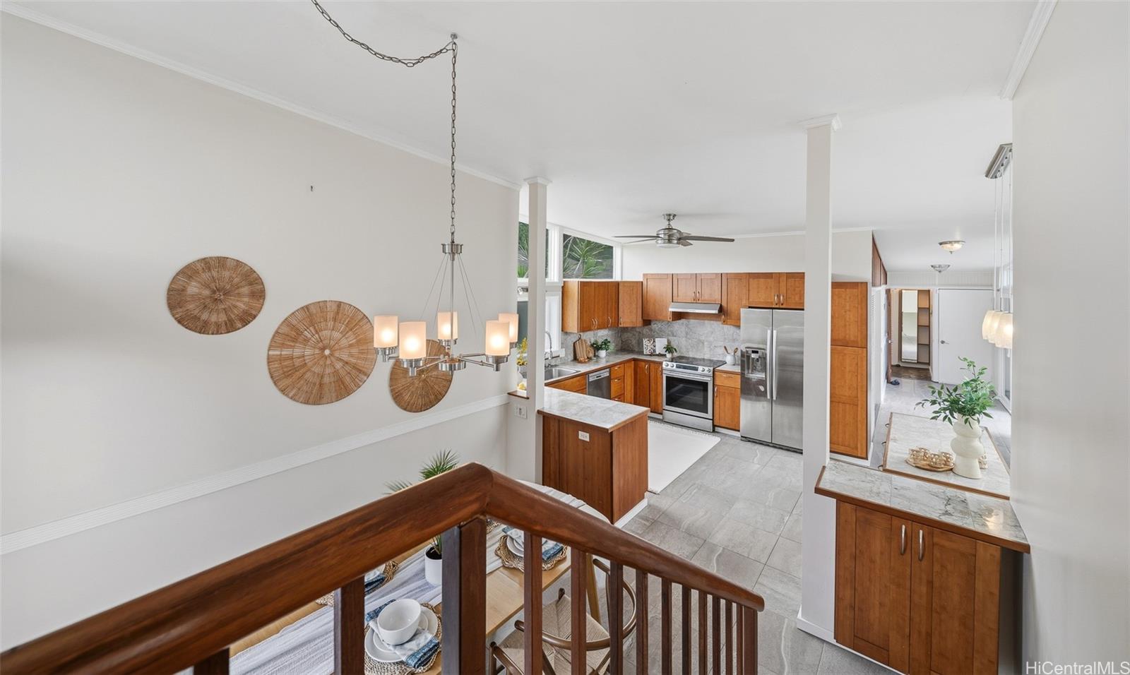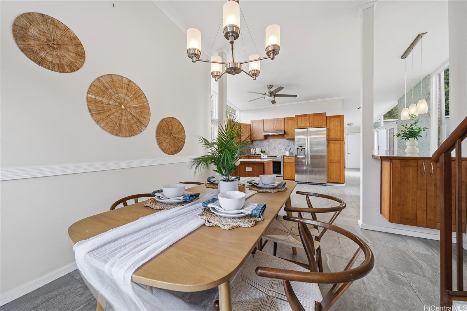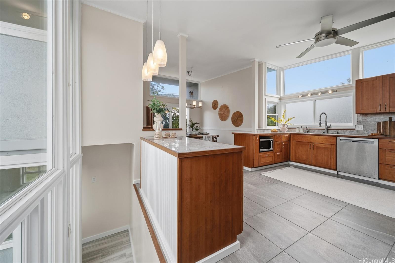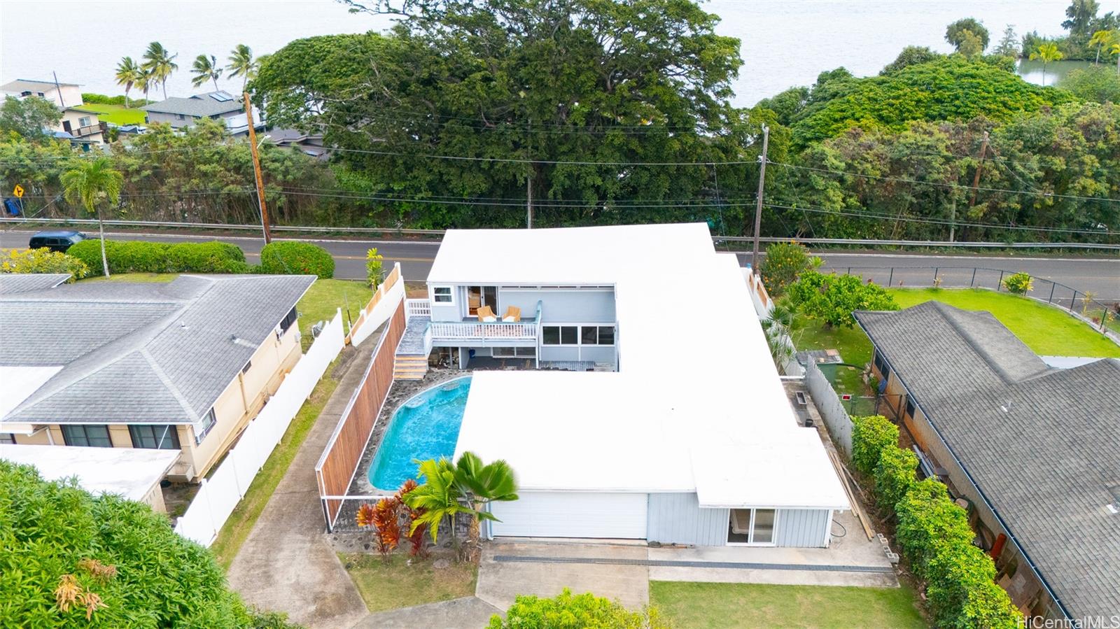 Tucked in Lulani Ocean, perched above Kaneohe Bay, this mid-century modern gem blends islander living with timeless design. Not your cookie-cutter home, it embodies character, flow, and spaces that just feel good. The kitchen and baths have been updated over the years and the indoor/outdoor connection makes entertaining effortless. Multiple lanais open to cool breezes, mountain views, and a lush and expansive 10,710 sq ft lot that might be perfect for that ADU you've dreamt about. Downstairs, a separate living area with its own entrance offers flexibility for extended living or creative space. Lounge by the pool, take in the Koolau's, or launch your kayak from nearby Laenani Neighborhood Park. Two-car garage plus extra parking and generous storage make this one both functional and fun. A true coastal lifestyle, without the oceanfront price tag.
