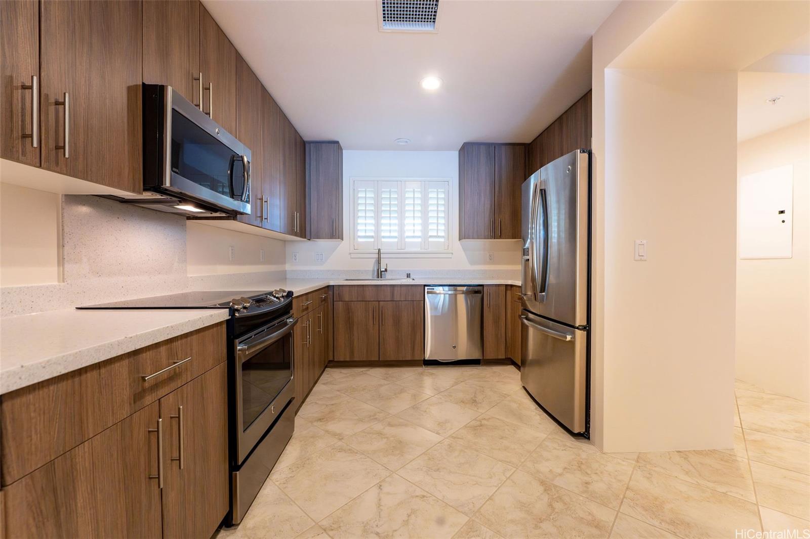 Ka Malanai at Kailua offers quintessential "modern island living" in the heart of Kailua, where everything is truly at your fingertips—Kailua Beach, shopping, fine dining, fitness centers, yoga studios, and more. This peaceful and beautifully upgraded Aoloa Plan A1 residence features tile flooring throughout the main living area with plush carpeting in the bedrooms. Lightly used as a second home by its original owners, the unit has been meticulously maintained and is in excellent condition. Features include fresh interior paint, vertical blinds, classic plantation shutters providing flexibility for light control and privacy, and upscale appliances. The home has been professionally cleaned and is move-in ready. Enjoy the coolness of central air conditioning, a comfortable open-concept floor plan, spacious covered lanai overlooking the lush, professionally landscaped grounds—ideal for relaxing or entertaining. There are two assigned covered parking spaces. Some photos are virtually staged.