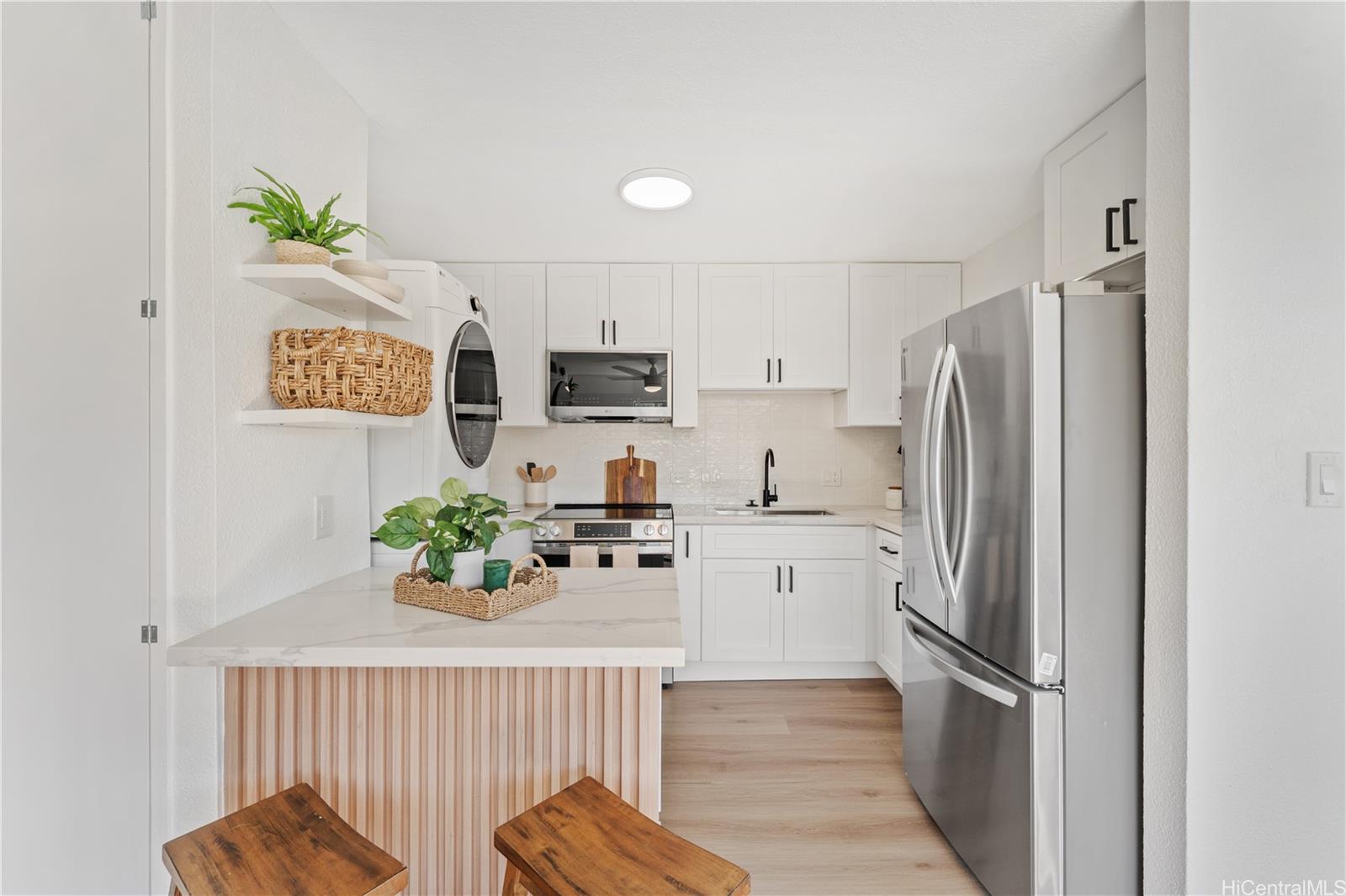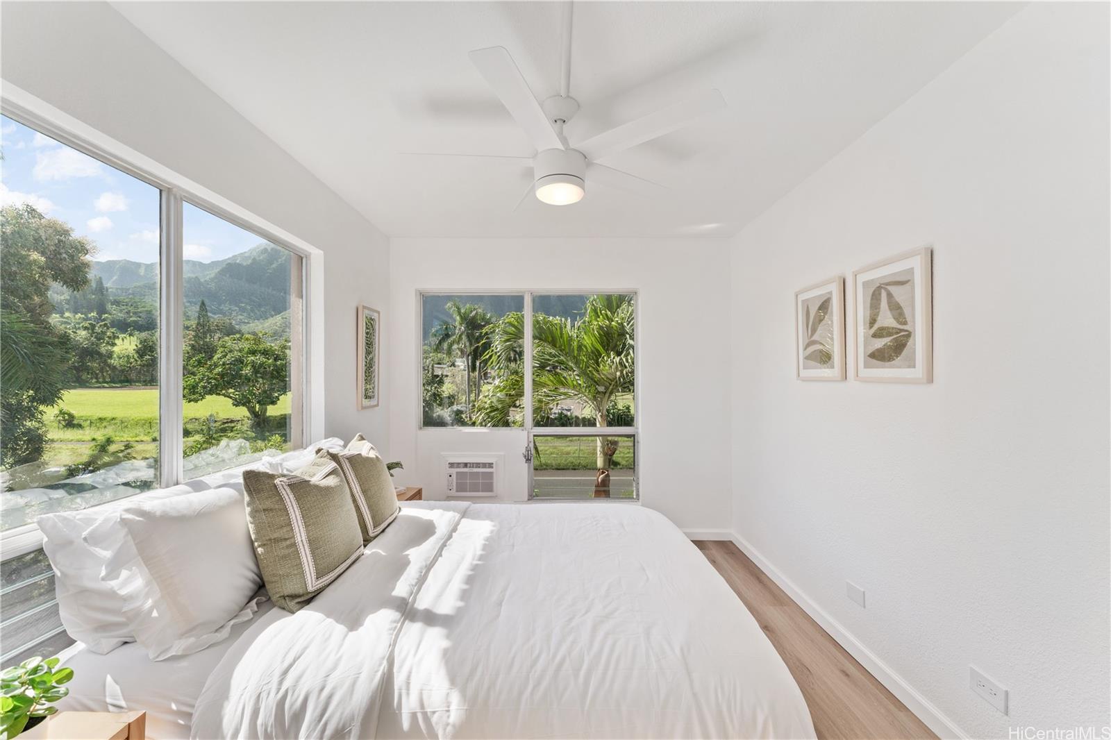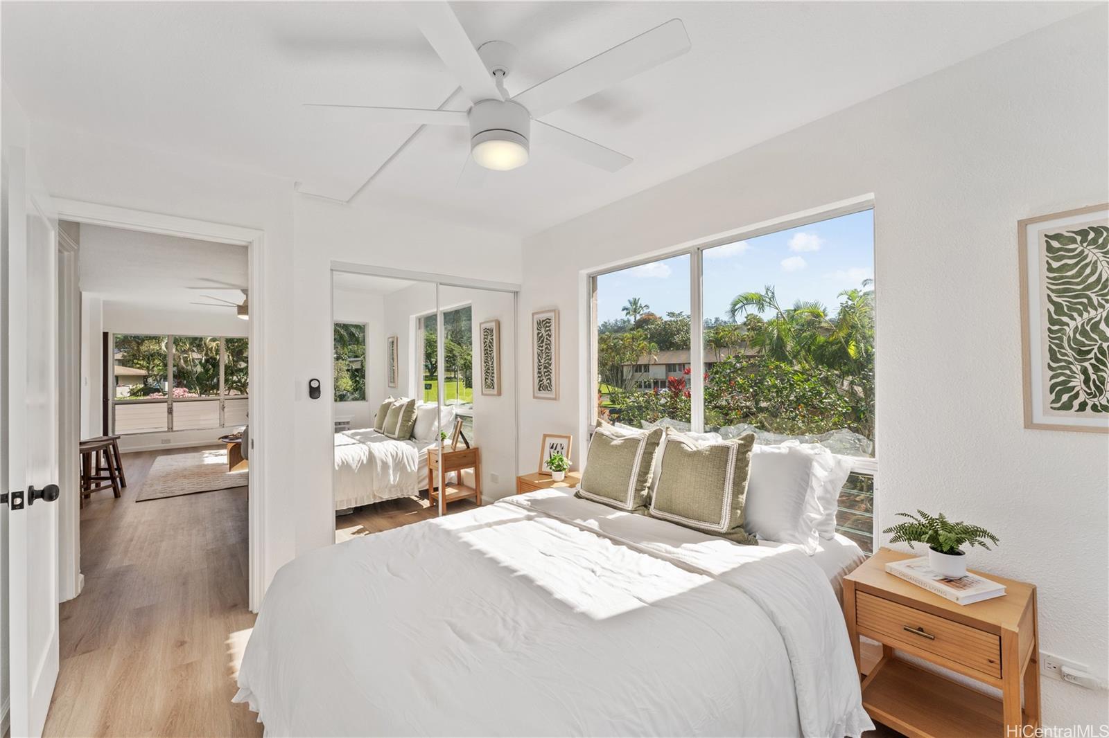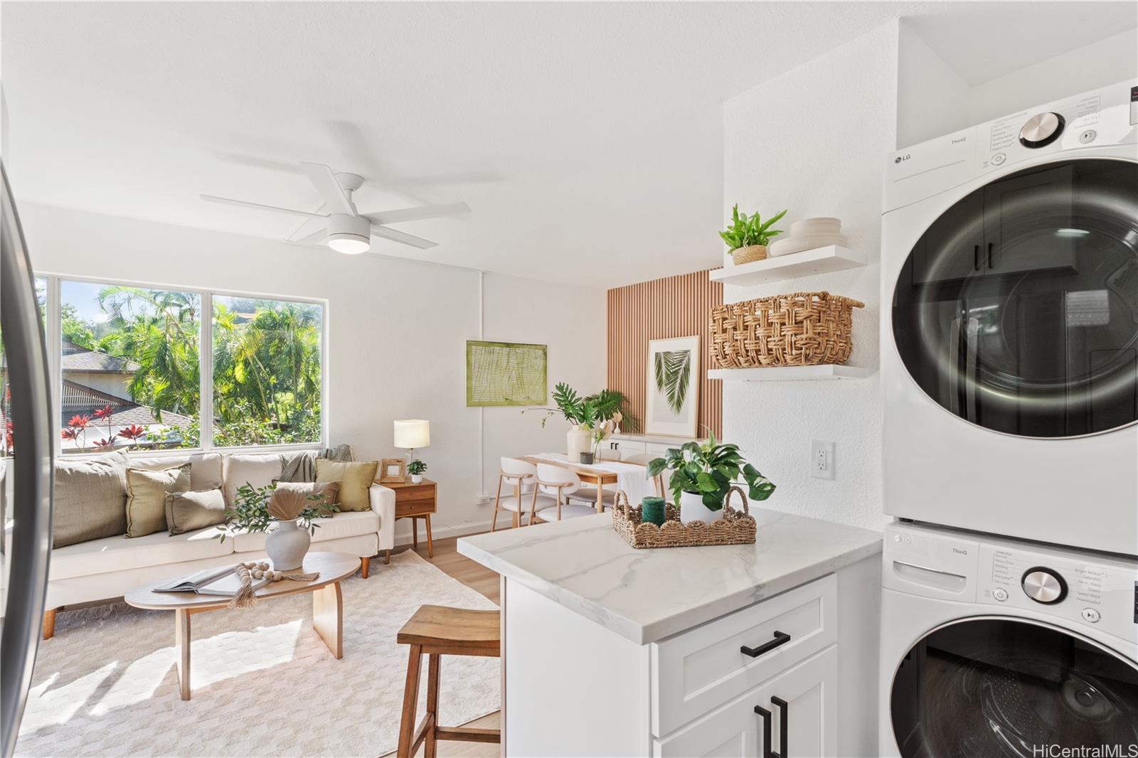 Welcome to your Windward Oahu oasis, this beautifully renovated 2-bedroom, 1-bath home offers the rare bonus of two parking stalls at an incredible value. Wake up to peaceful Koolau mountain views just outside both bedroom windows, and enjoy a bright, airy living space filled with natural light. Thoughtfully updated throughout, the home features warm natural wood accents, custom built-in cabinetry and a fluted wood entertainment wall, light oak-tone vinyl plank flooring, quartz counters throughout, and the convenience of a full-size washer and dryer. The remodeled bathroom showcases a tiled tub/shower combo and modern LED vanity lighting, creating a fresh, spa-like feel.
