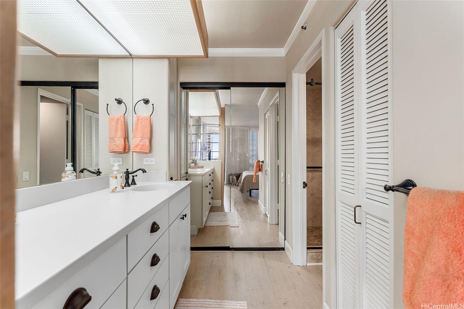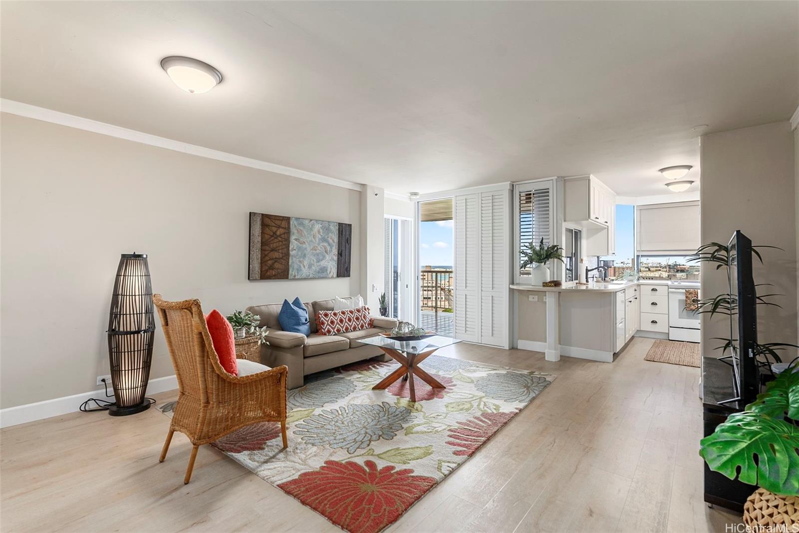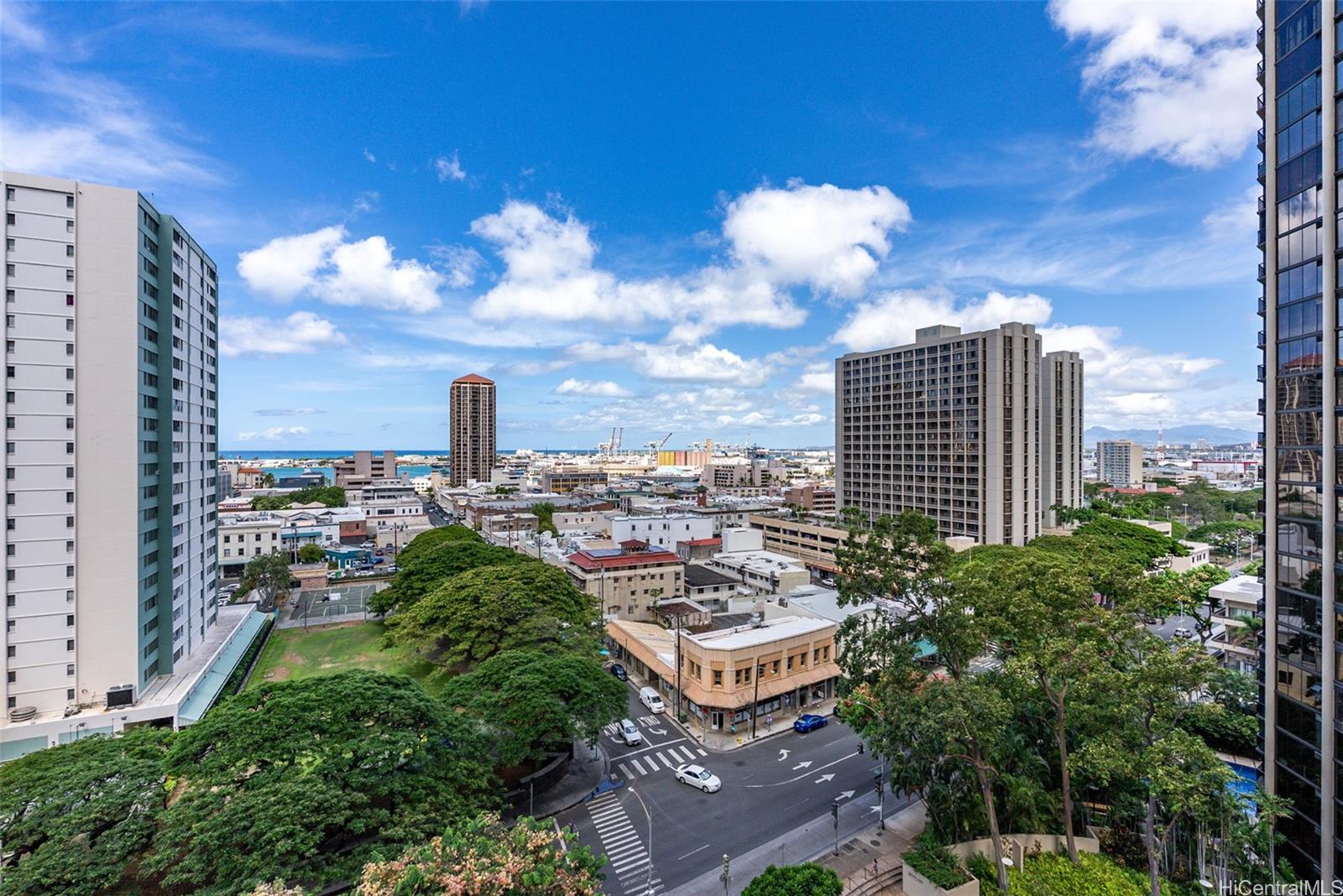 Experience elevated city living in this beautifully updated 2-bed, 2-bath unit in the highly sought-after Stack 9 at Honolulu Park Place. Quietly positioned mid-tower with partial ocean, city, and harbor views, #1309 offers a peaceful escape with cool breezes and sunset skies from your private lanai. Inside, enjoy thoughtful 2018 updates throughout: no popcorn ceilings, luxury vinyl plank flooring, updated kitchen and bathrooms, a sleek walk-in shower, plantation shutters, crown molding, and central AC. This move-in-ready home combines modern style with everyday comfort. Honolulu Park Place is a full-service, pet-friendly building with resort-style amenities: swimming pool, hot tub, two-story fitness center, tennis, racquetball & pickleball courts, BBQ cabanas, koi ponds, bowling alley, café, party room, and ample guest parking. Secure and convenient with 24-hour security and gated garage parking. Rarely available Stack 9 layout—schedule your showing today before it’s gone!