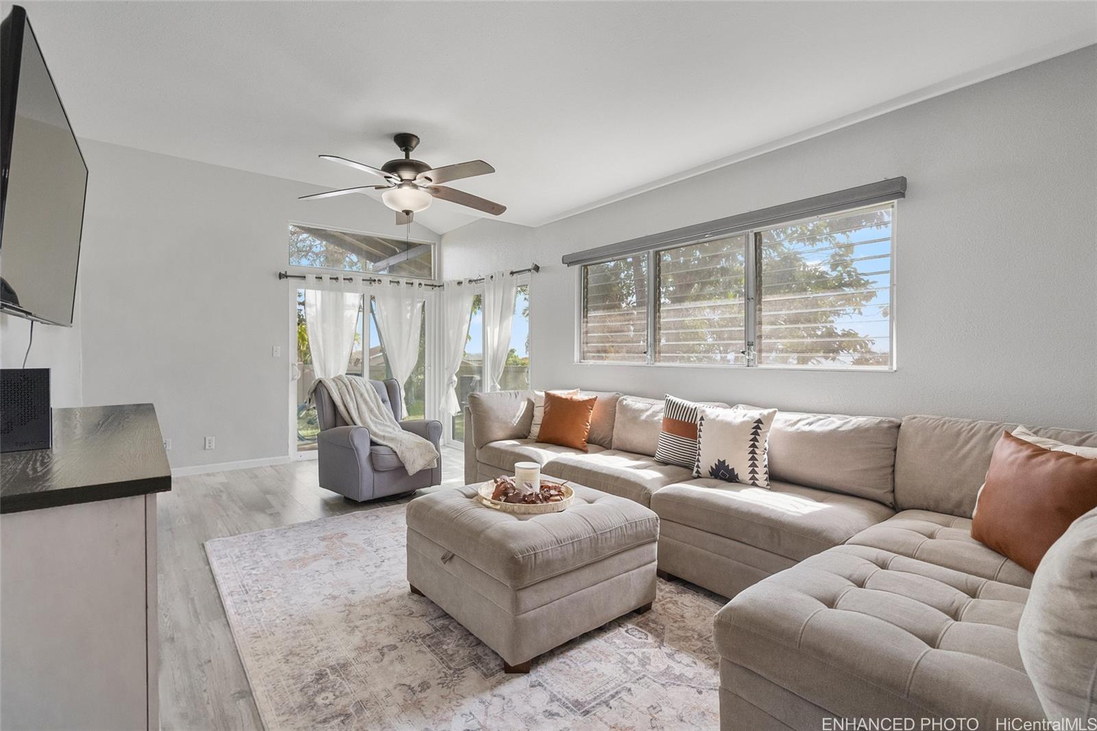 Rare opportunity for peaceful, private corner-lot living with a remarkably large fenced outdoor space, one of Palehua Hillside’s largest yards. This spacious multi-level townhome offers the comfort & feel of a single-family residence w/split A/C, 2 cov’d side-by-side parking stalls, plus ample street parking for guests. Vaulted ceilings & an open, airy layout enhance the sense of space, while the wrap-around, fully fenced private yard creates an exceptional setting for indoor-outdoor island living. Enjoy morning coffee on the lanai, evening gatherings under the stars, and plenty of room for pets to play in a tranquil, tropical environment. First level features a versatile living room with double-door entry. Updated for modern living, the bright open kitchen features an island, granite countertops, stainless steel appliances & flows seamlessly into the dining area. The main living level also includes a convenient half bath w/indoor laundry, side-by-side full-size W/D. The primary suite offers a walk-in closet w/built-in shelving and en suite bath, creating a comfortable private retreat. Enjoy ceiling fans, vinyl plank flooring, 2-outdoor storage sheds & pet-friendly community!